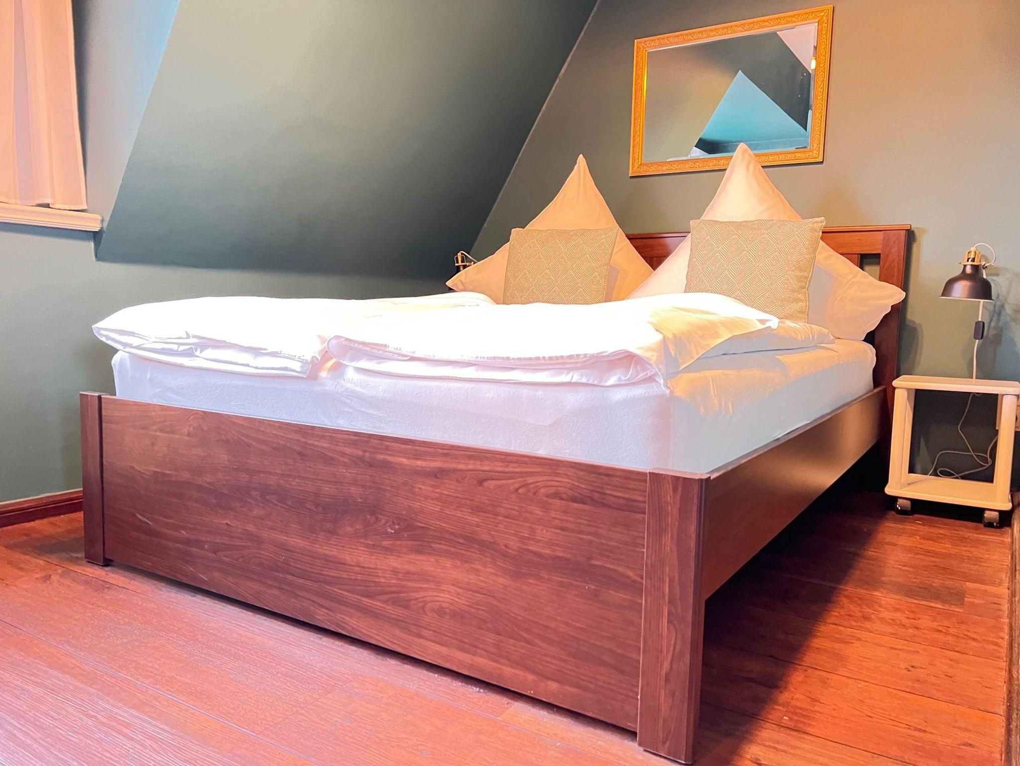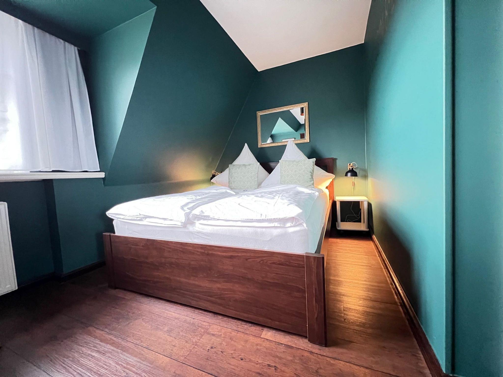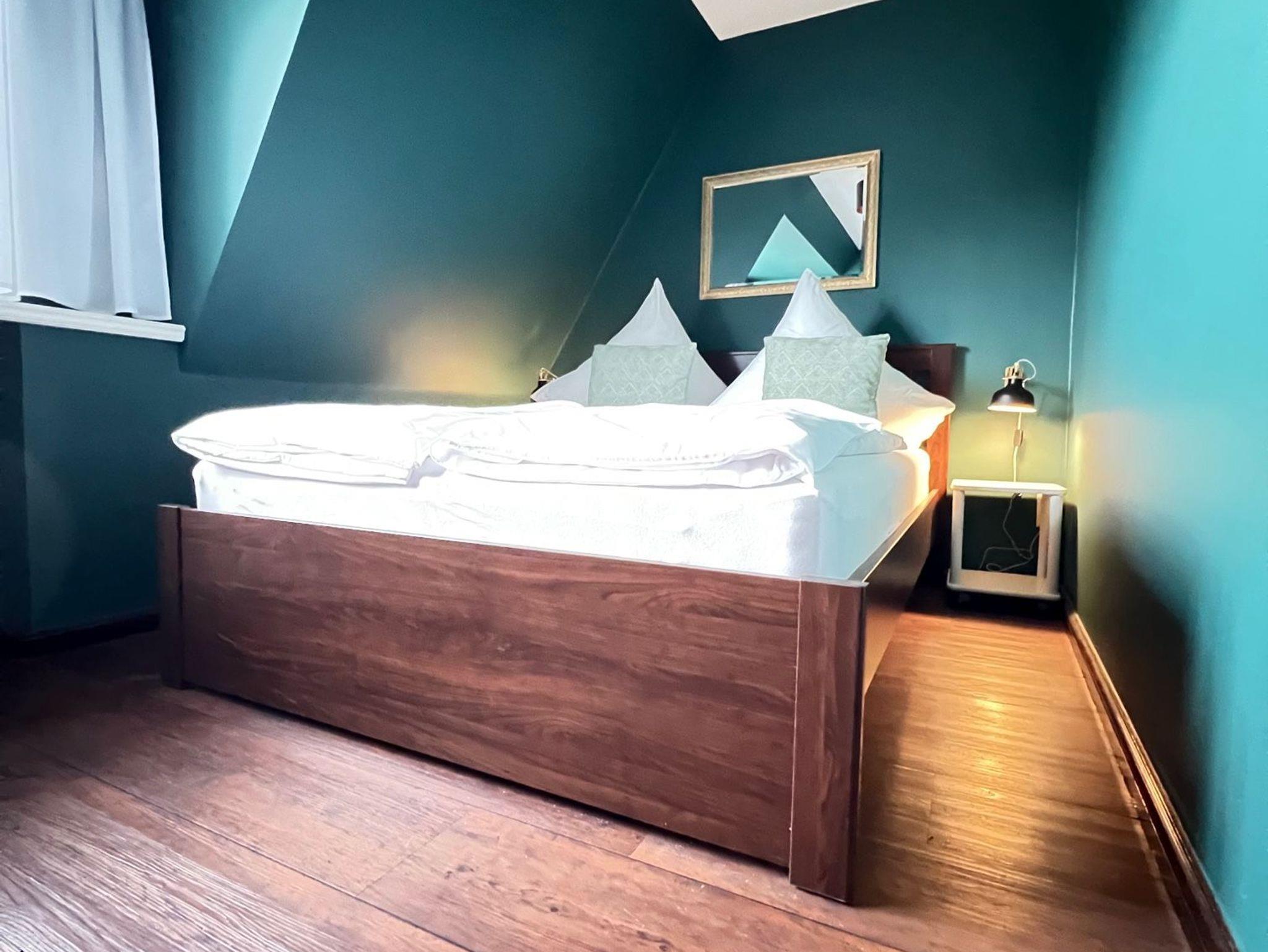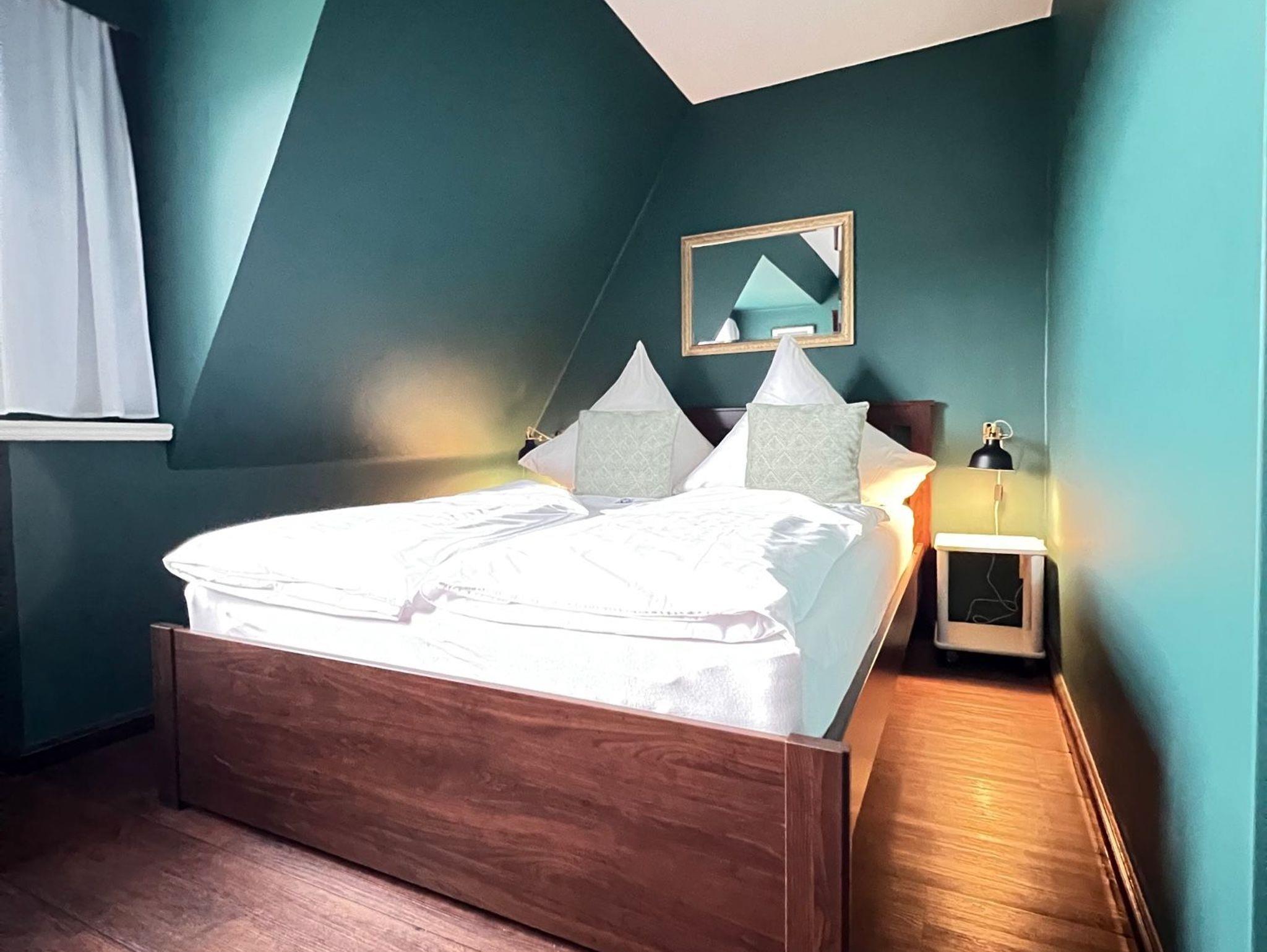 Personen ausgelegt. Die in Pastellfarben gehaltenen Wandtöne und der dunkle Holzboden verleihen der