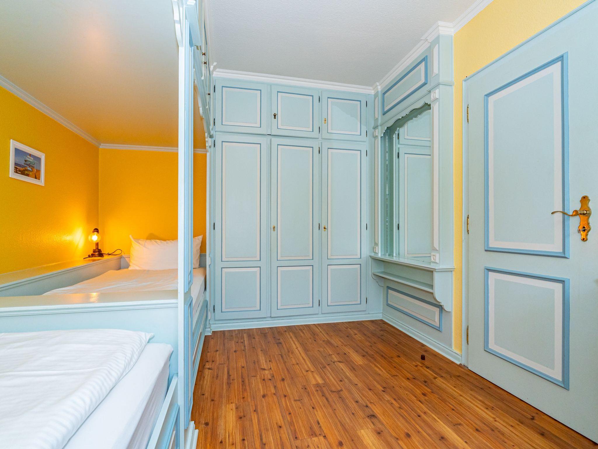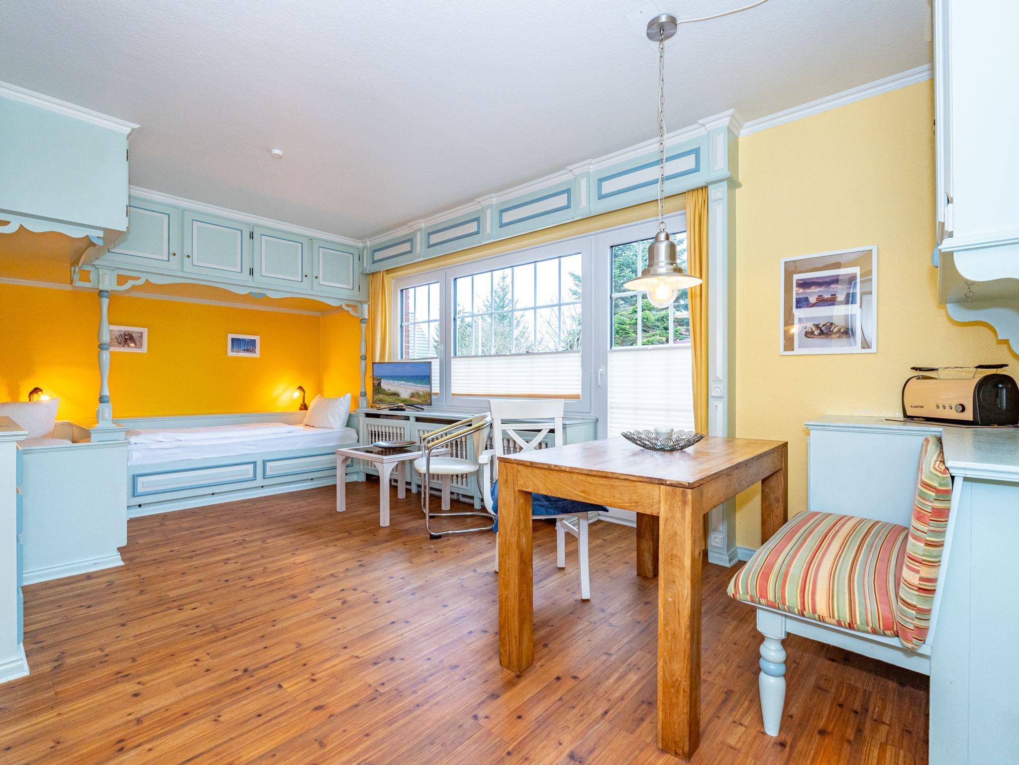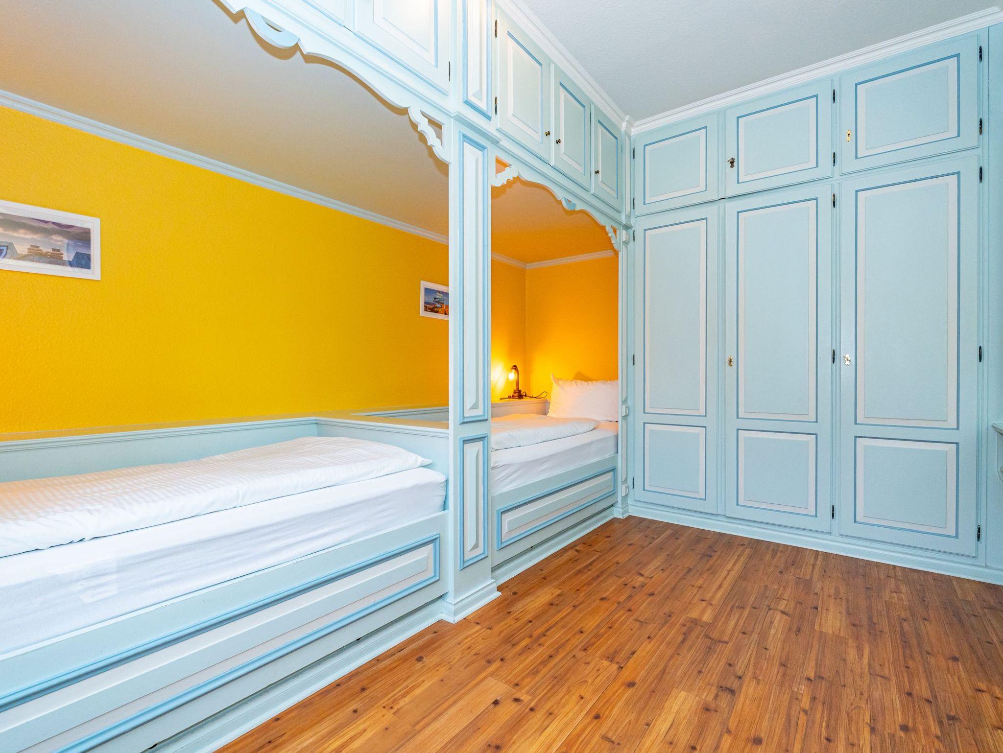 Im dritten Apartment, welches sich ebenfalls im Erdgeschoss befindet und über eine eigene Terrasse verfügt, werden Schifffahrtsträume wahr. 50 Quadratmeter verteilen sich auf 2 Zimmer mit gemütlichen Schlafkojen für 4 Personen. Über den offen gestalteten Wohn- und Essbereich gelangen Sie direkt zum Außenbereich. Das Badezimmer ist ausgestattet mit Dusche, WC und Waschbecken.