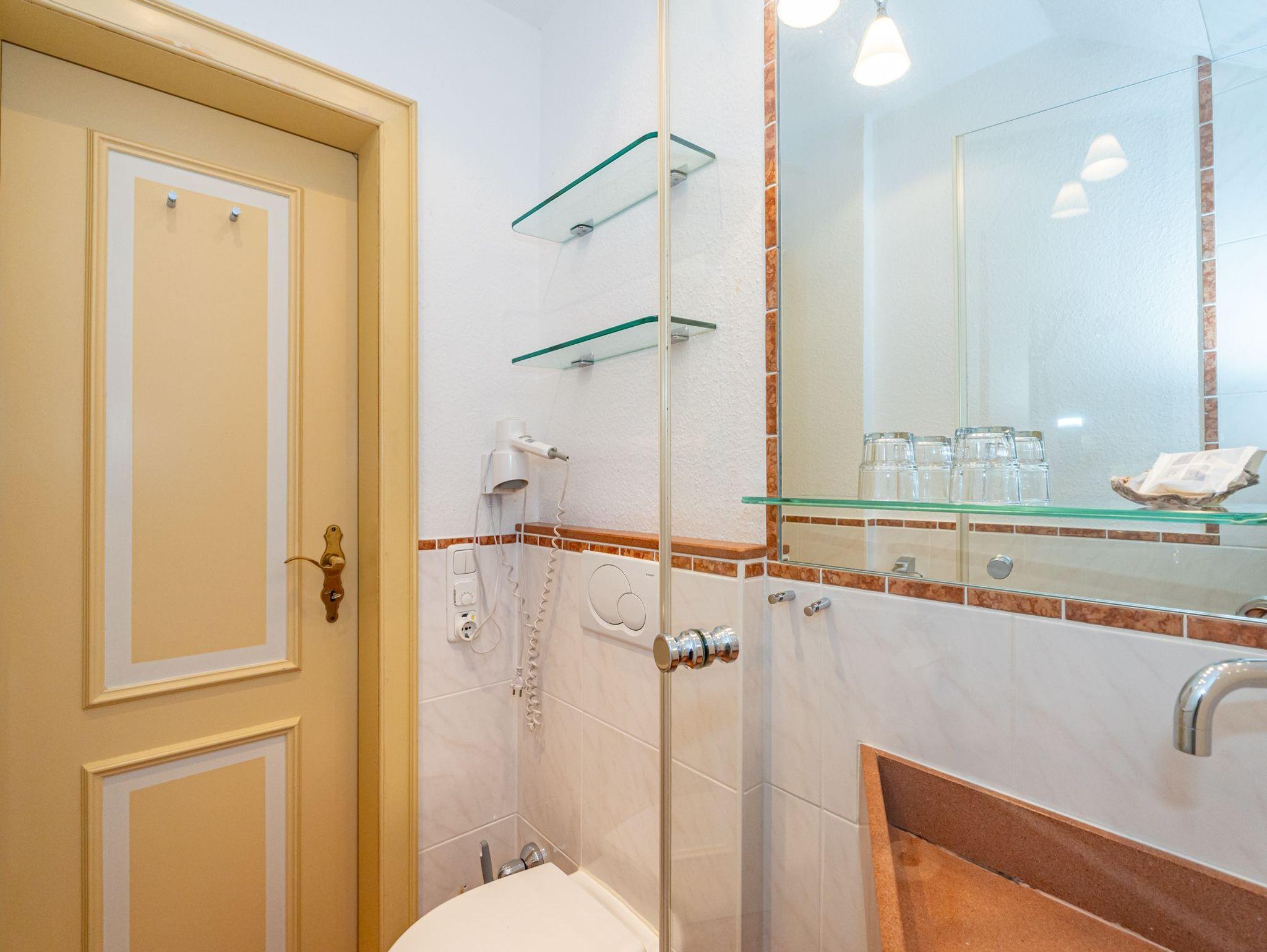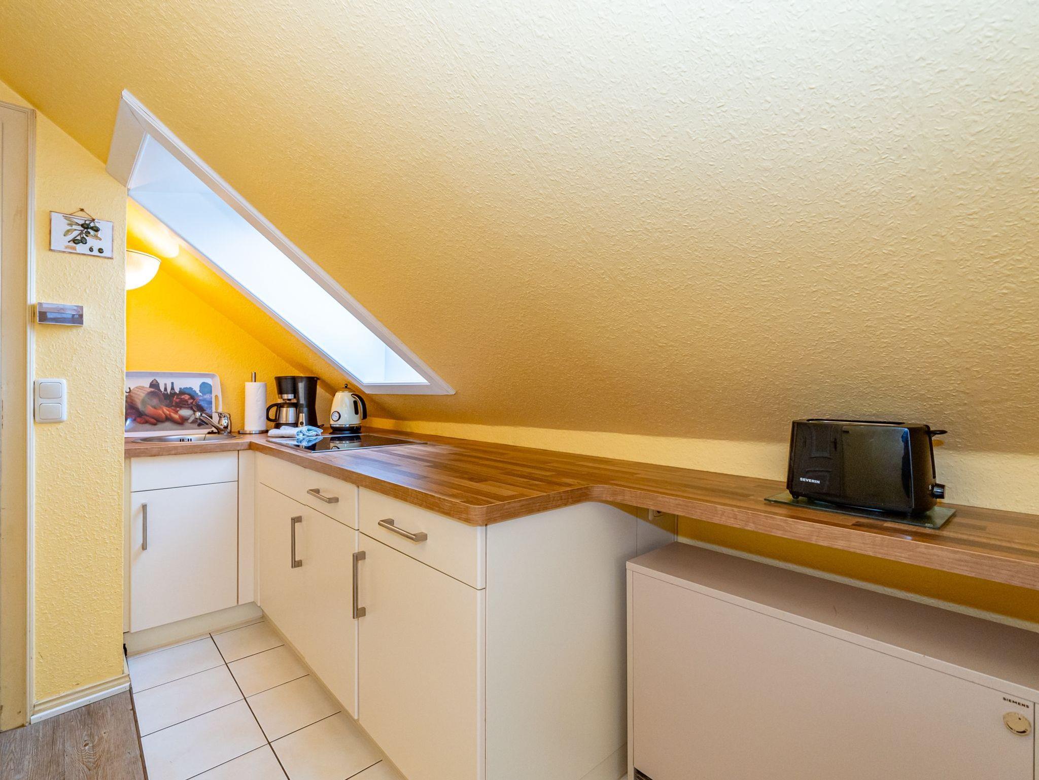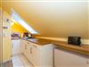 Im Giebel des 2. Obergeschosses liegt das achte Apartment. Die in edlen Cremetönen eingerichteten 30 Quadratmeter bieten Platz für 2 Personen. Der offen gestaltete Wohn- und Essbereich verfügt über 2 Einzelbetten und Sitzmöglichkeiten. Das Bad ist ausgestattet mit Dusche, WC und Waschbecken.