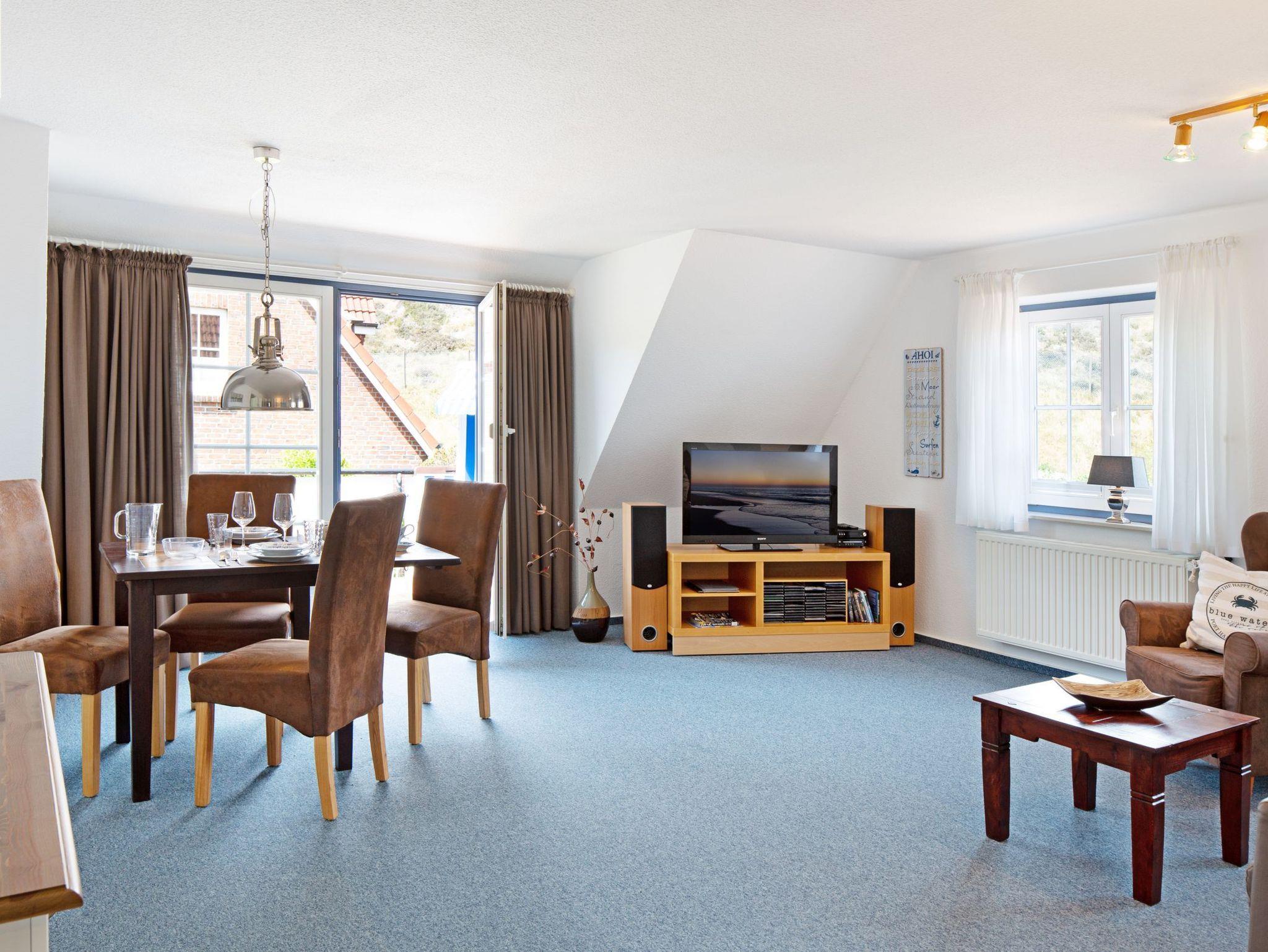 Der gemütliche Wohnbereich lädt mit einer komfortablen Sitzecke und dem Zugang zum großen Balkon zum Entspannen ein. Hier stehen in der Saison bequeme Balkonmöbel und ein Strandkorb bereit der ideale Ort, um den Tag bei einer frischen Nordseebrise ausklingen zu lassen. Das separate Schlafzimmer ist mit einem bequemen Doppelbett ausgestattet und bietet erholsame Nächte. Bei Bedarf ist auch getrenntes Schlafen möglich, da im Wohnzimmer eine hochwertige Schlafcouch zur Verfügung steht.