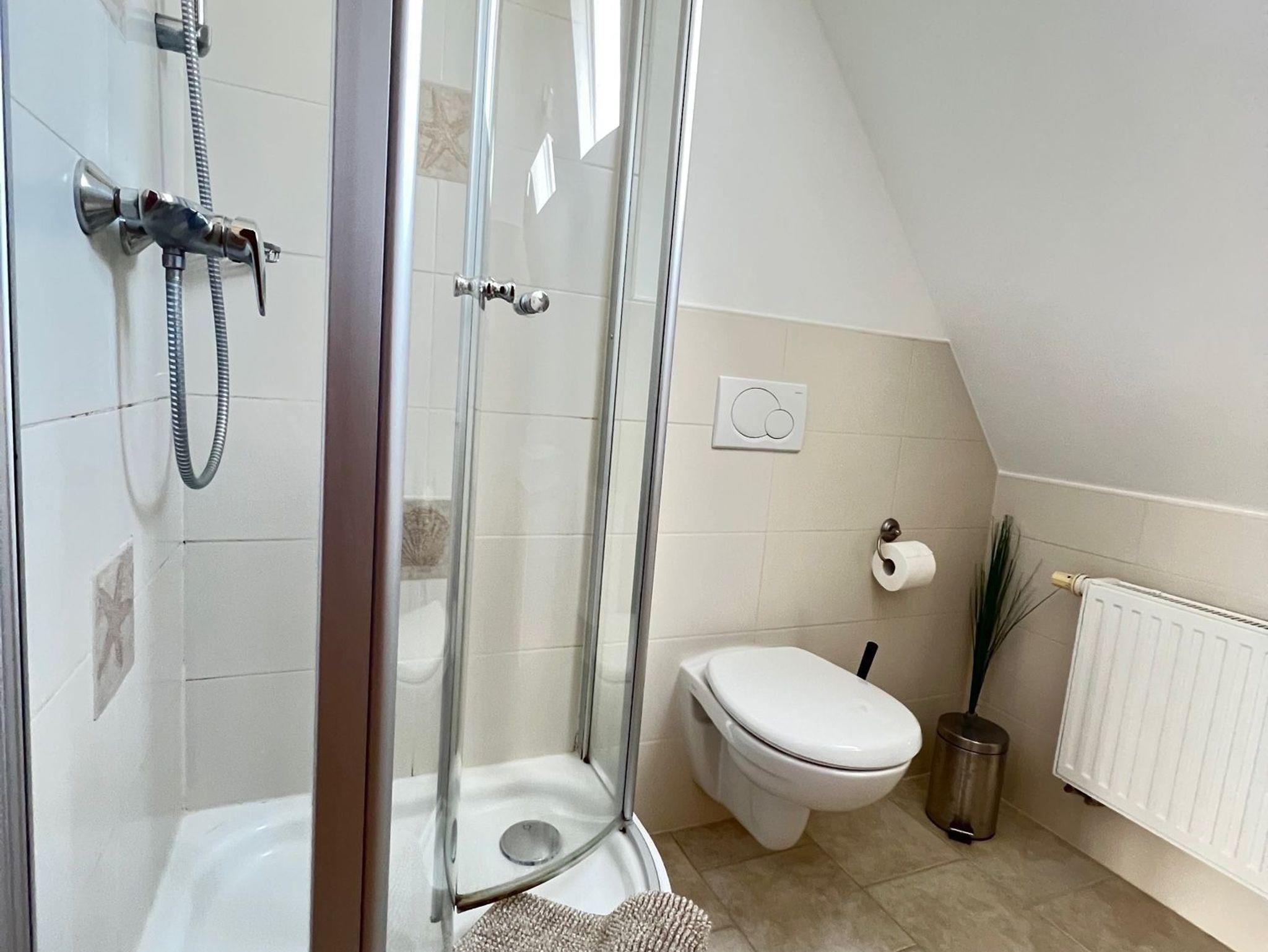 Die Wohnung bietet einen Wohn- und Schlafbereich, eine kleine Küchenzeile zur Selbstverpflegung sowie ein Badezimmer mit Dusche. Die Einrichtung ist zweckmäßig und klar, perfekt für Gäste, die Wert auf Funktionalität und Ruhe legen.