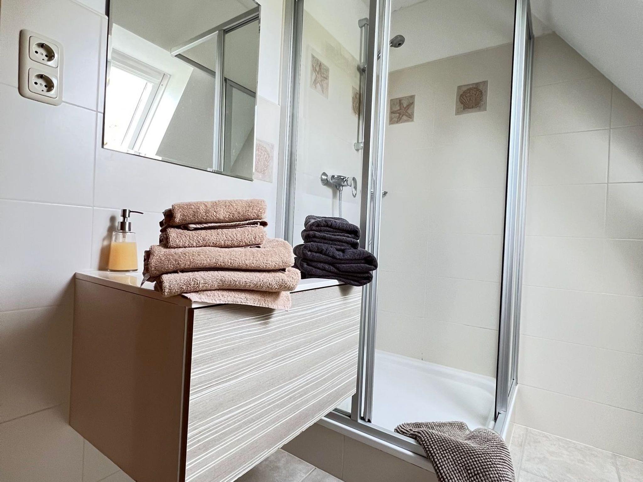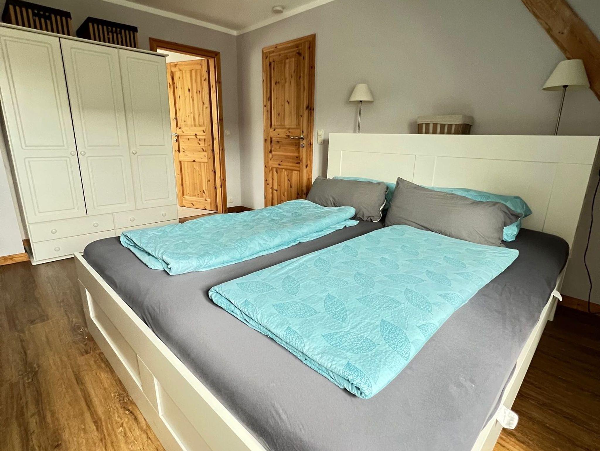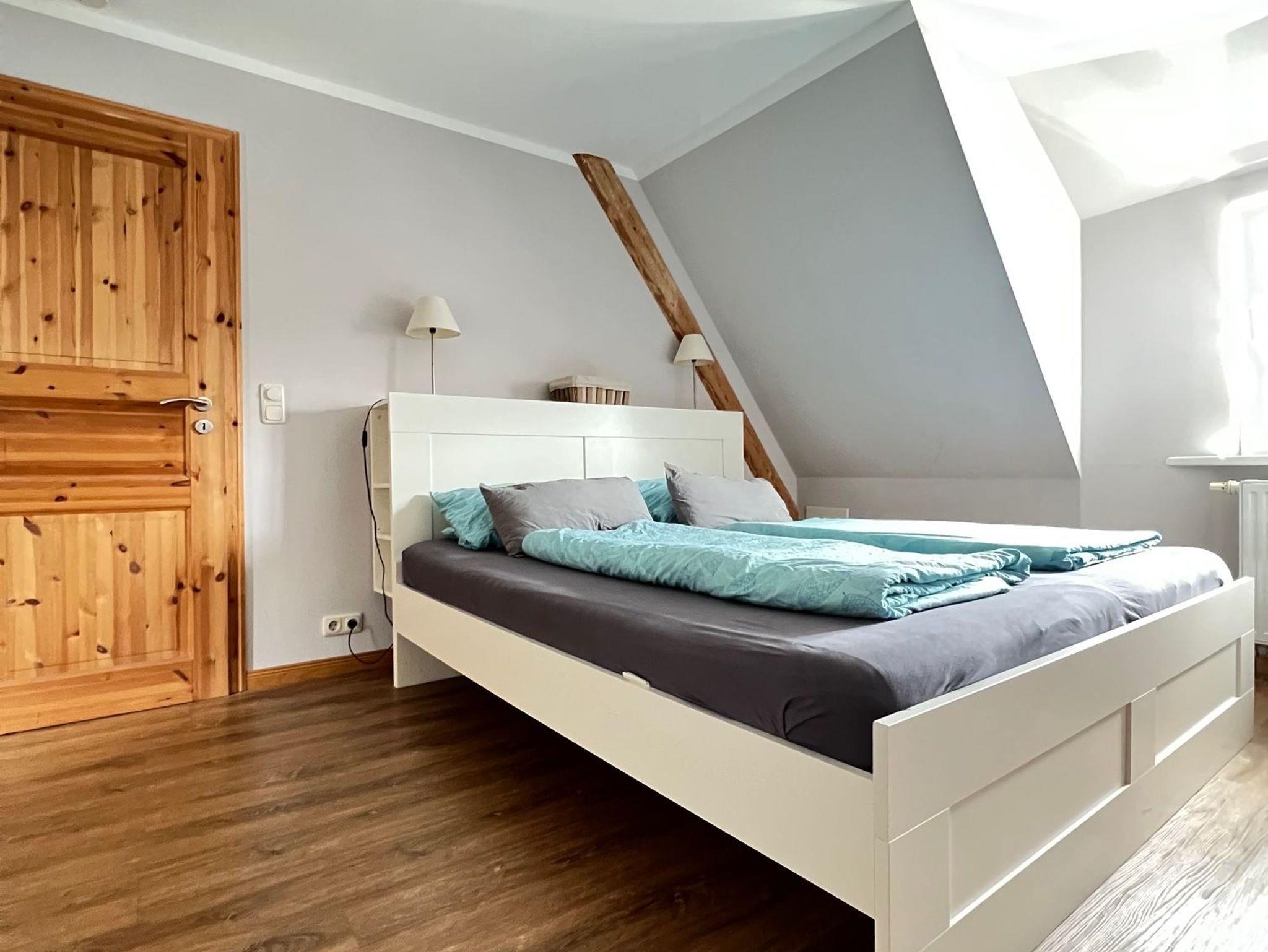 Doppelbett sowie ein Duschbad mit WC. Die Dachschrägen und der Holzdielenboden verleihen der Unterkunft