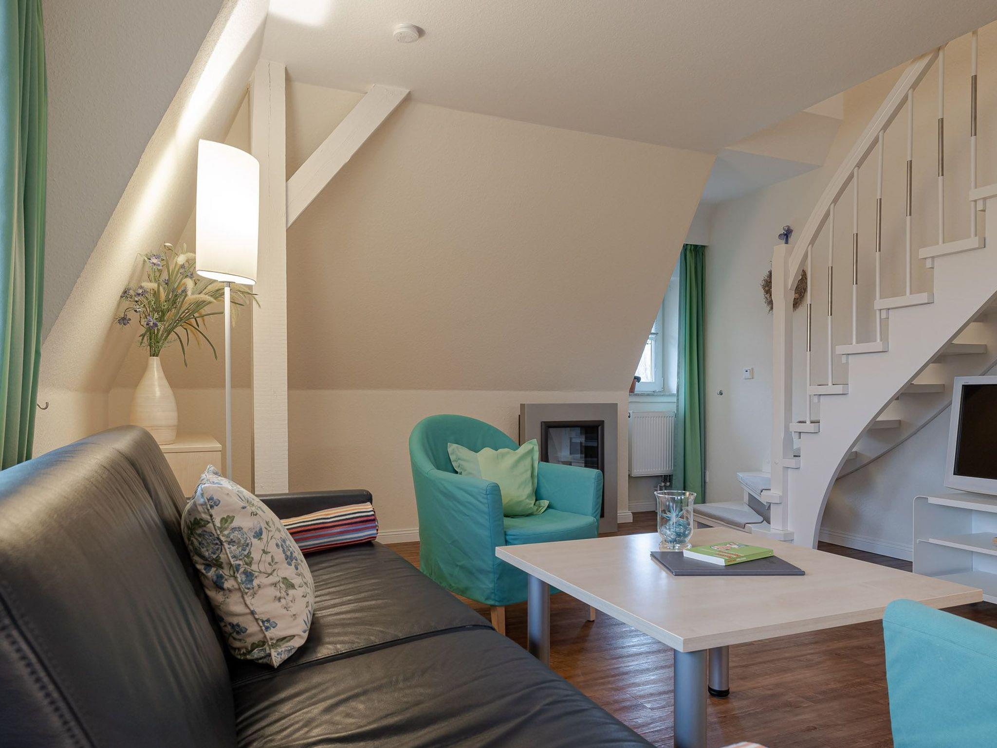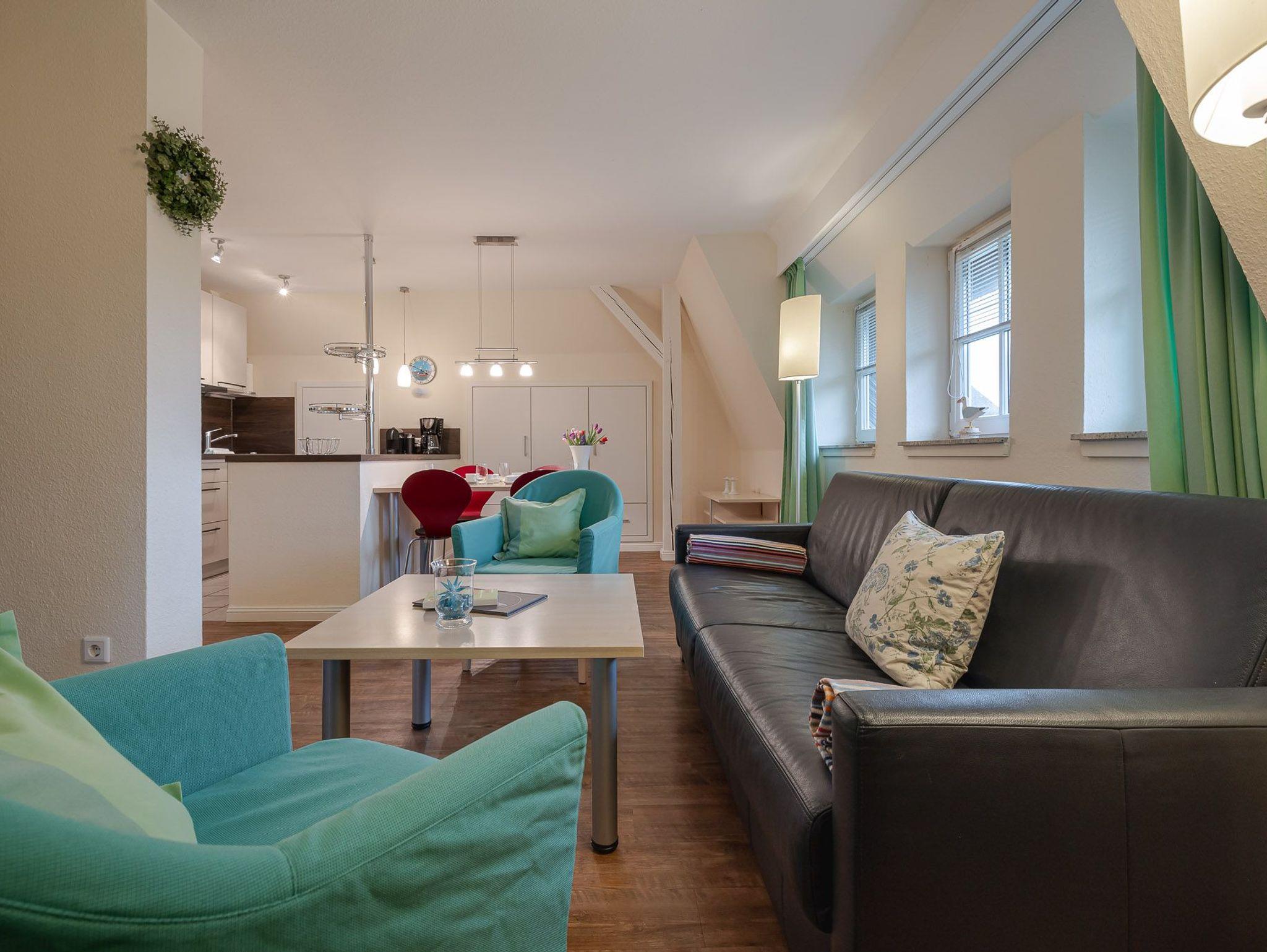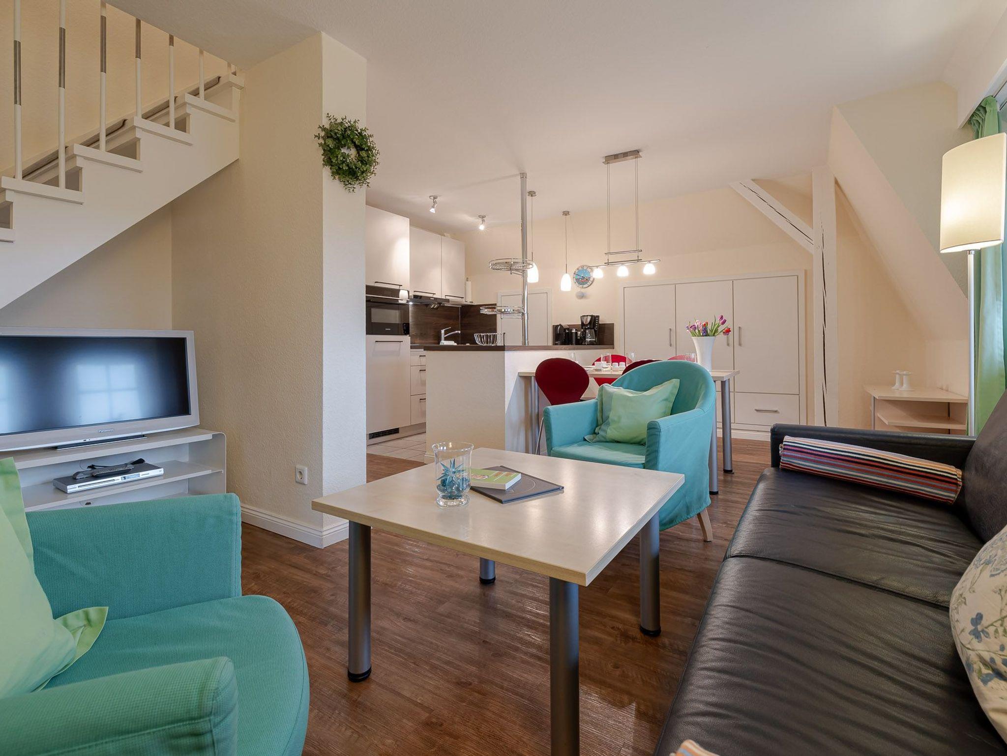 Wohnzimmer mit einer angeschlossenen offenen Küche ? zahlreiche Sitzgelegenheiten laden zu entspannten Stunden zu jeder Tageszeit ein. Es gibt weiterhin ein Schlafzimmer mit Doppelbett und ein Duschbad. Im oberen Stockwerk befinden sich ein weiterer Schlafraum sowie