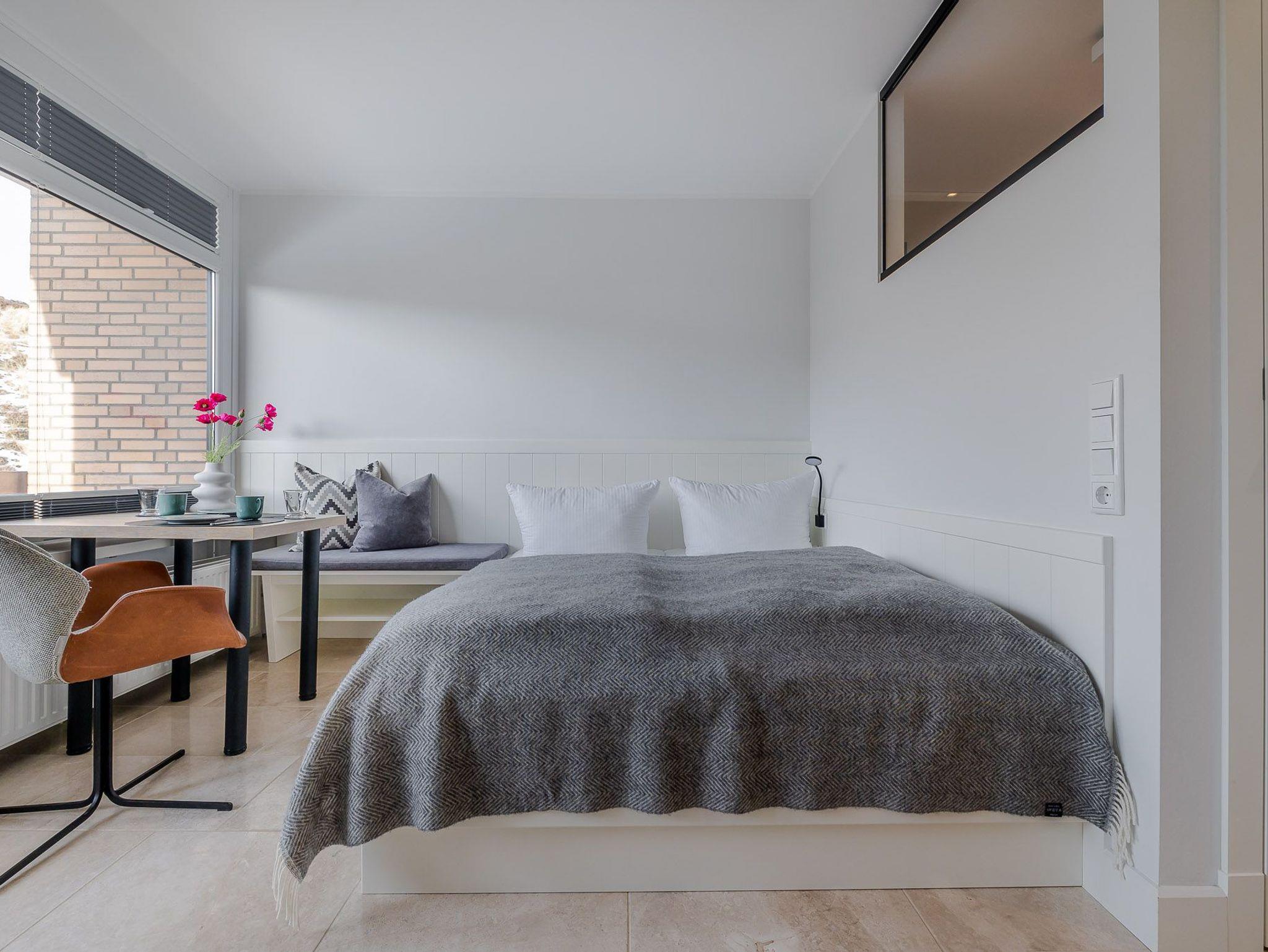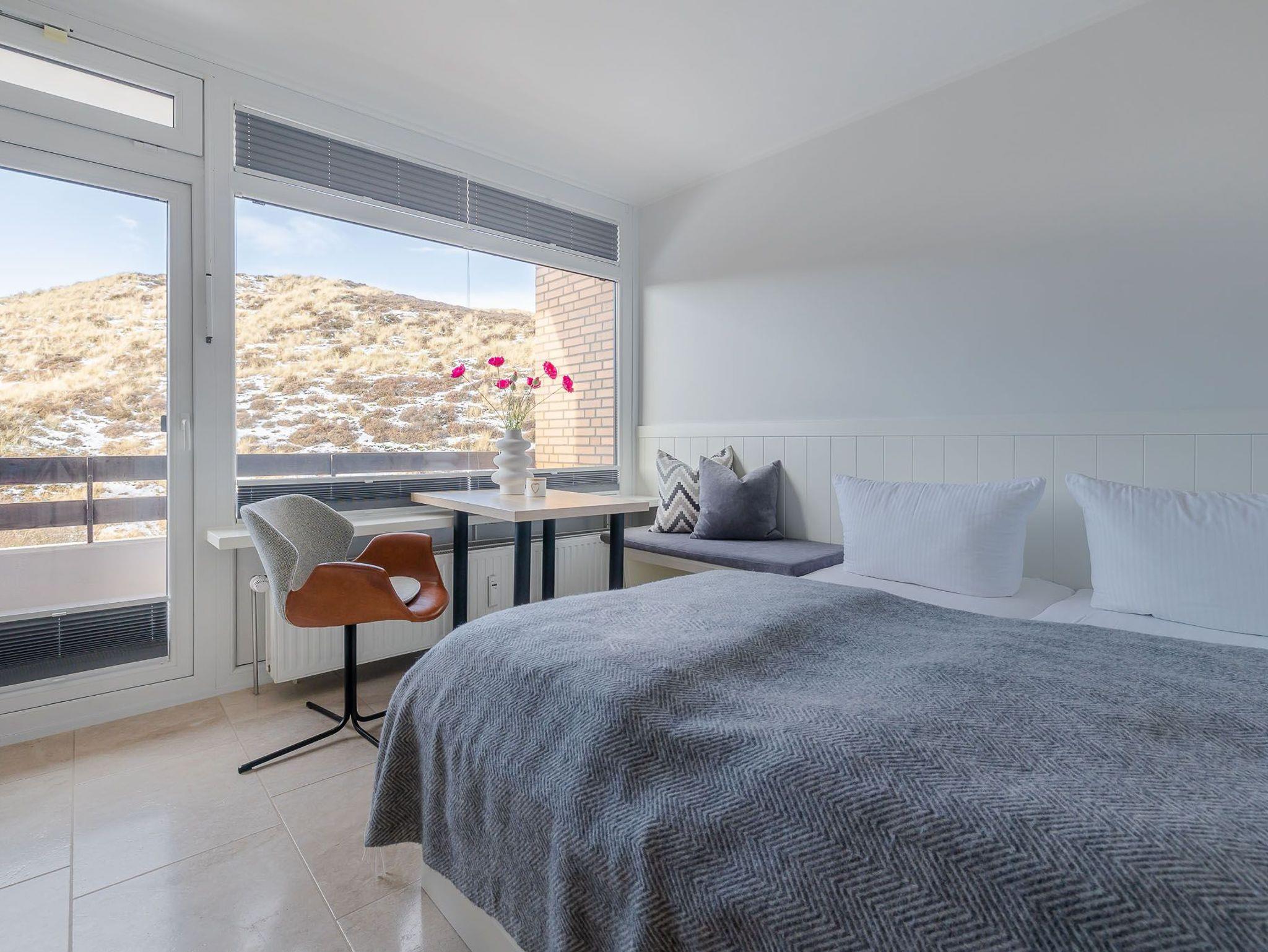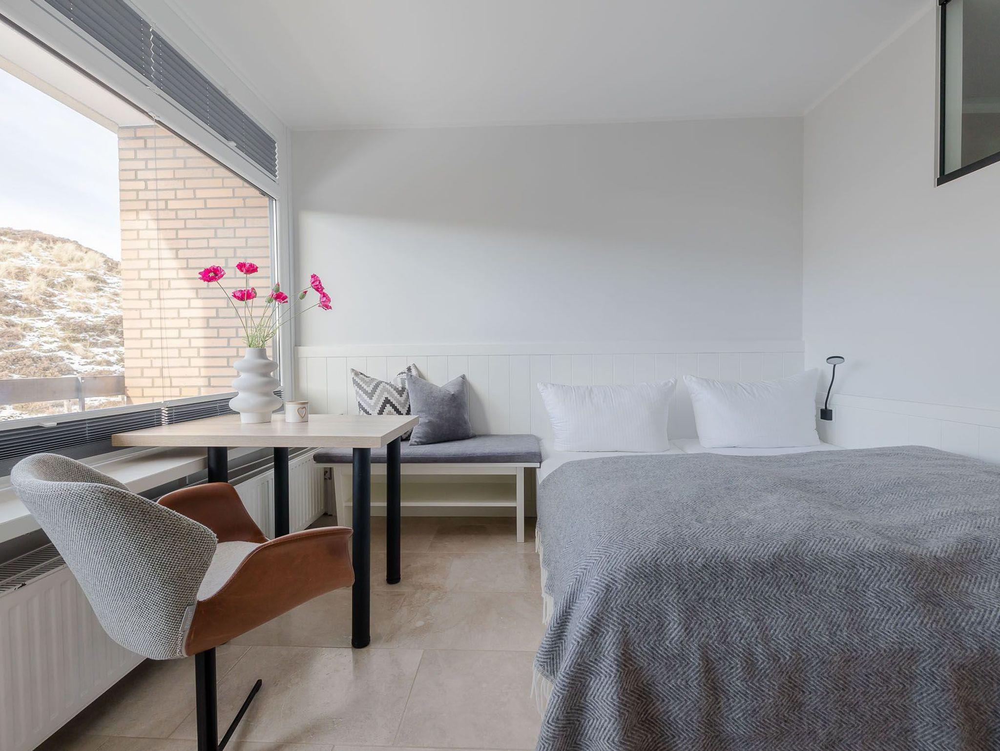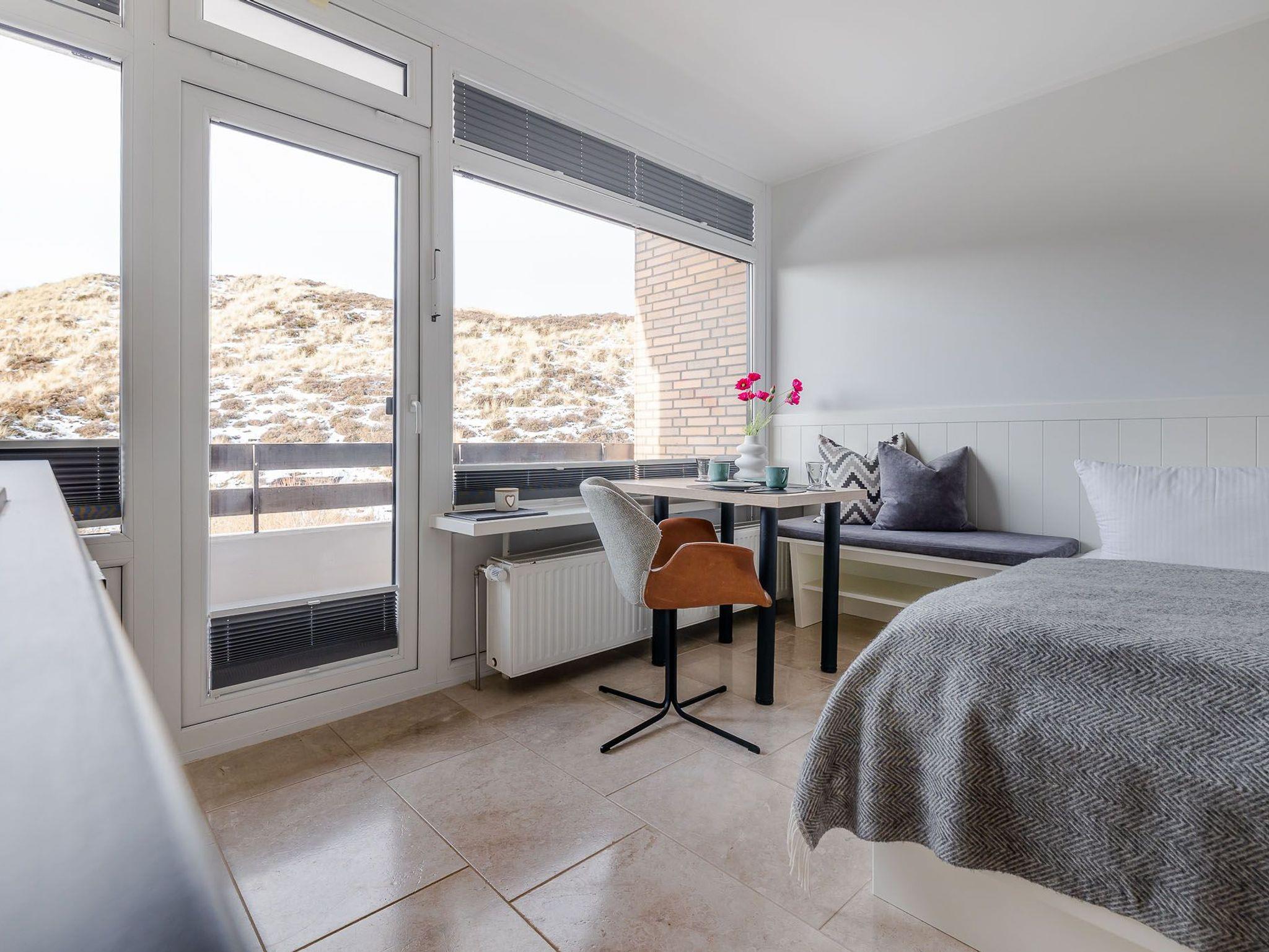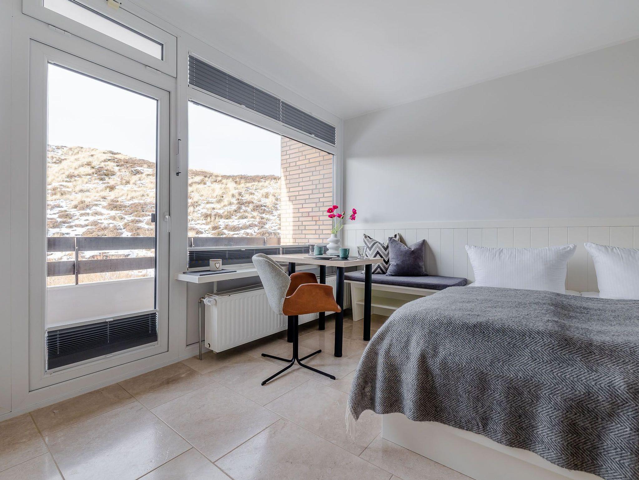 Der großzügig geschnittene Wohnraum mit modernem Interieur integriert neben einem Arbeitstisch mit Sitzgelegenheit und einem Doppelbett auch eine komplett ausgestattete Küche für ausgedehnte kulinarische Abende. Dank des großen Panoramafensters mit Tür zur Terrasse ist das gesamte Zimmer lichtdurchflutet und sorgt allzeit für eine behagliche Stimmung. Und das Schönste: Direkt dahinter beginnen die Dünen, die sich von hier bis zur offenen Nordsee erstrecken. Mehr Natur geht kaum.