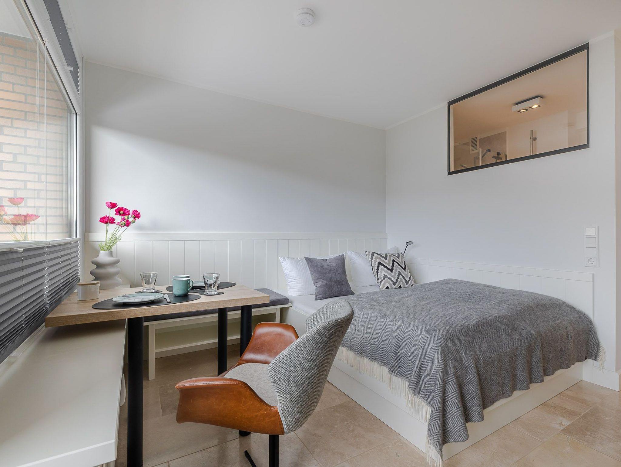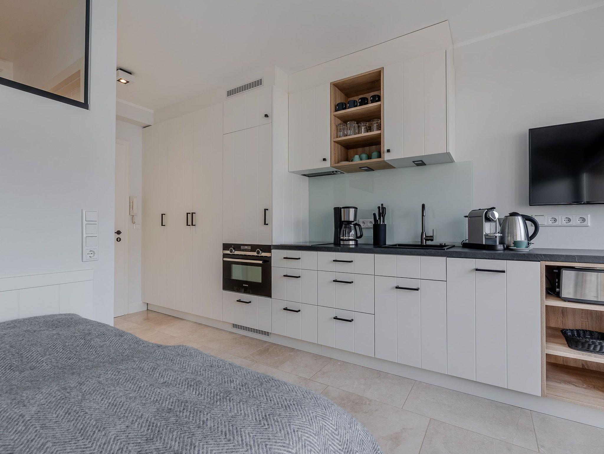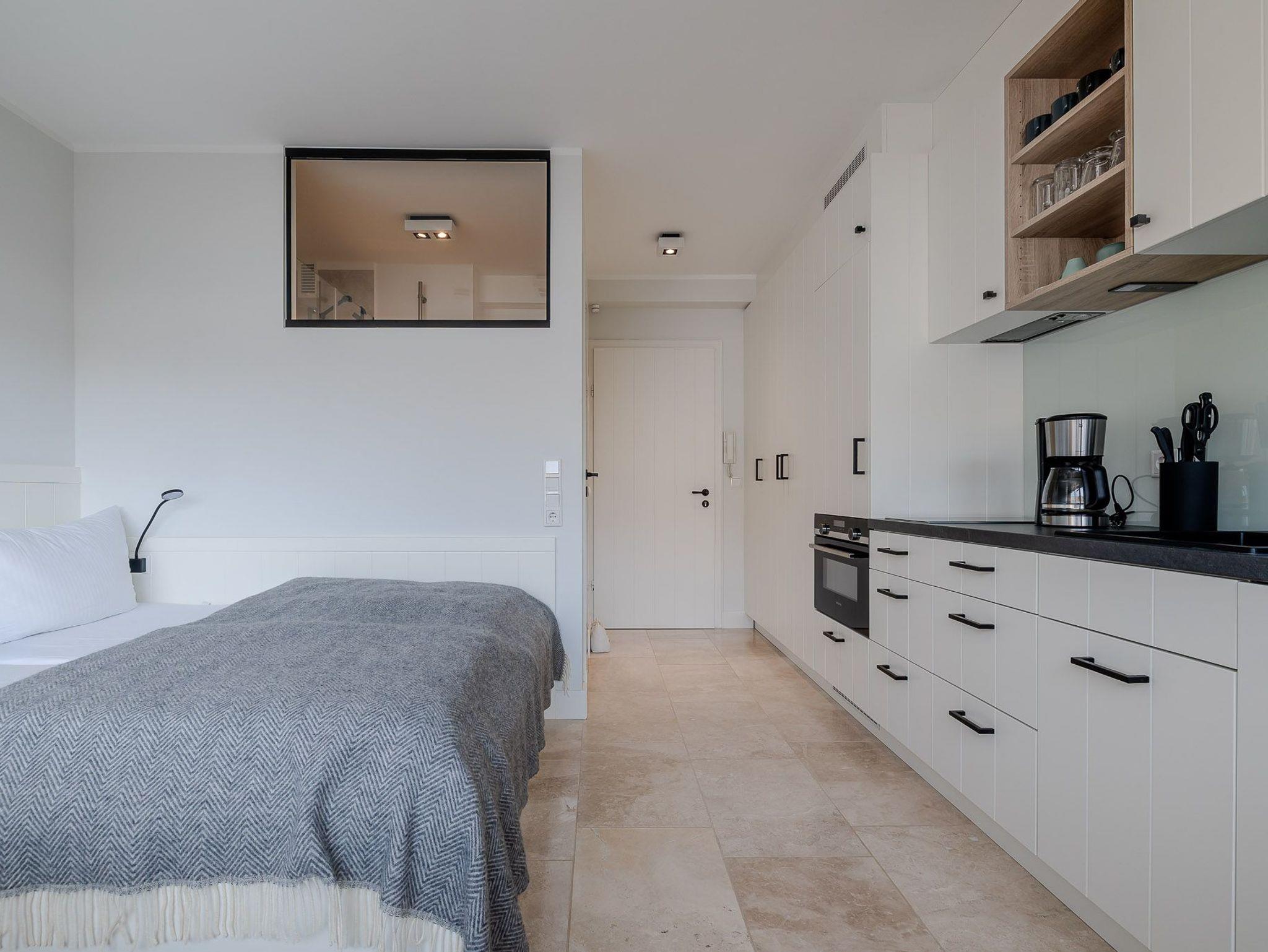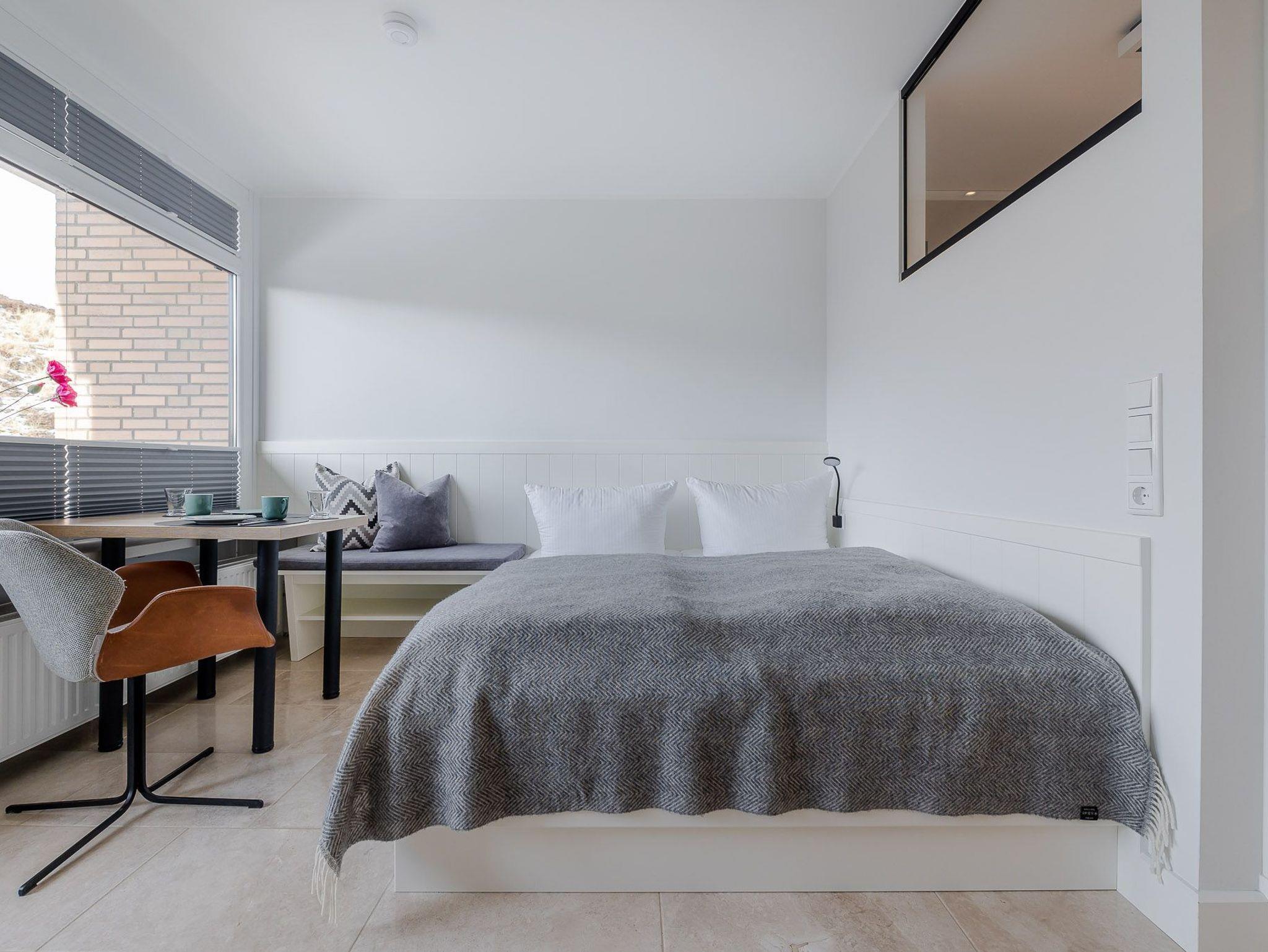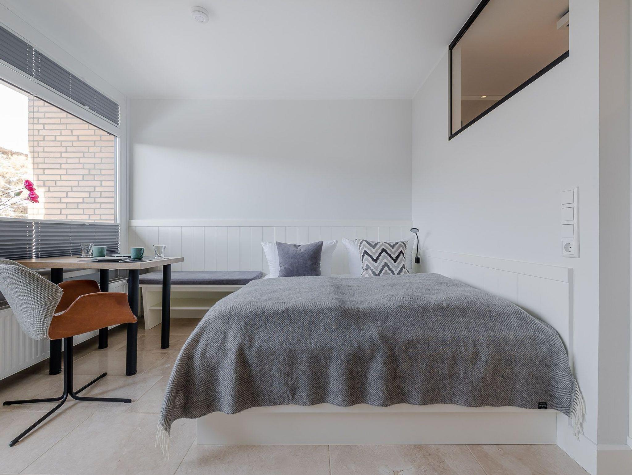 Der großzügig geschnittene Wohnraum mit modernem Interieur integriert neben einem Arbeitstisch mit Sitzgelegenheit und einem Doppelbett auch eine komplett ausgestattete Küche für ausgedehnte kulinarische Abende. Dank des großen Panoramafensters mit Tür zur Terrasse ist das gesamte Zimmer lichtdurchflutet und sorgt allzeit für eine behagliche Stimmung. Und das Schönste: Direkt dahinter beginnen die Dünen, die sich von hier bis zur offenen Nordsee erstrecken. Mehr Natur geht kaum.