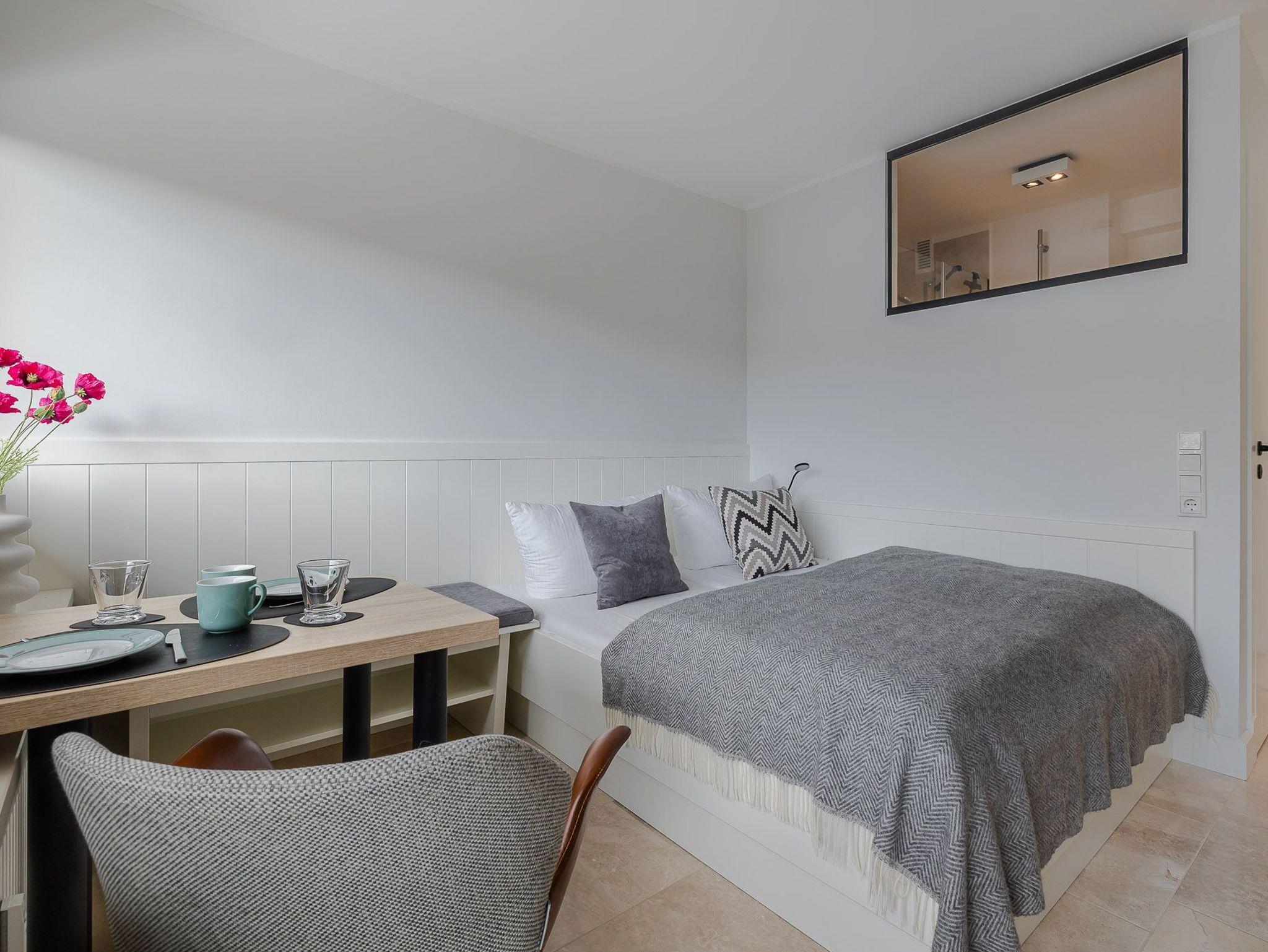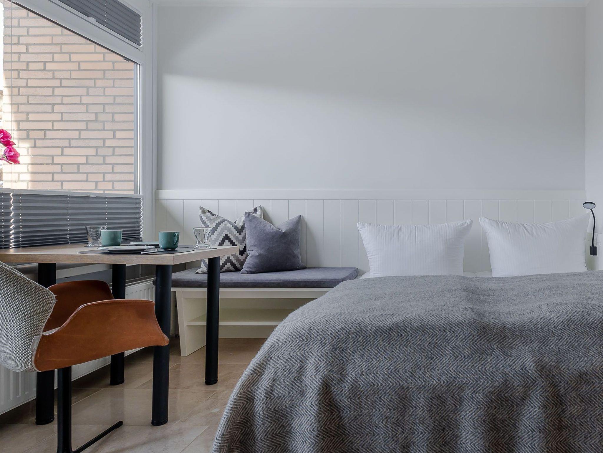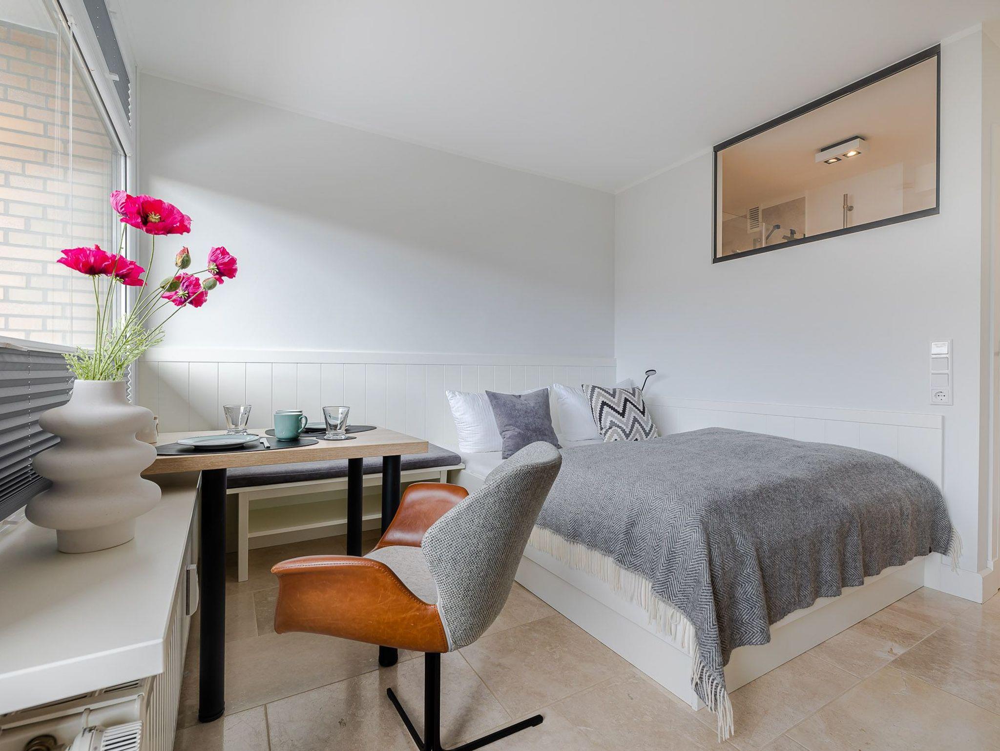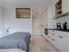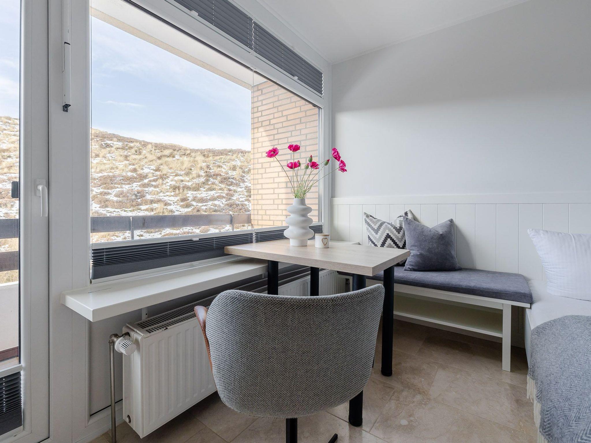 Der großzügig geschnittene Wohnraum mit modernem Interieur integriert neben einem Arbeitstisch mit Sitzgelegenheit und einem Doppelbett auch eine komplett ausgestattete Küche für ausgedehnte kulinarische Abende. Dank des großen Panoramafensters mit Tür zur Terrasse ist das gesamte Zimmer lichtdurchflutet und sorgt allzeit für eine behagliche Stimmung. Und das Schönste: Direkt dahinter beginnen die Dünen, die sich von hier bis zur offenen Nordsee erstrecken. Mehr Natur geht kaum.
