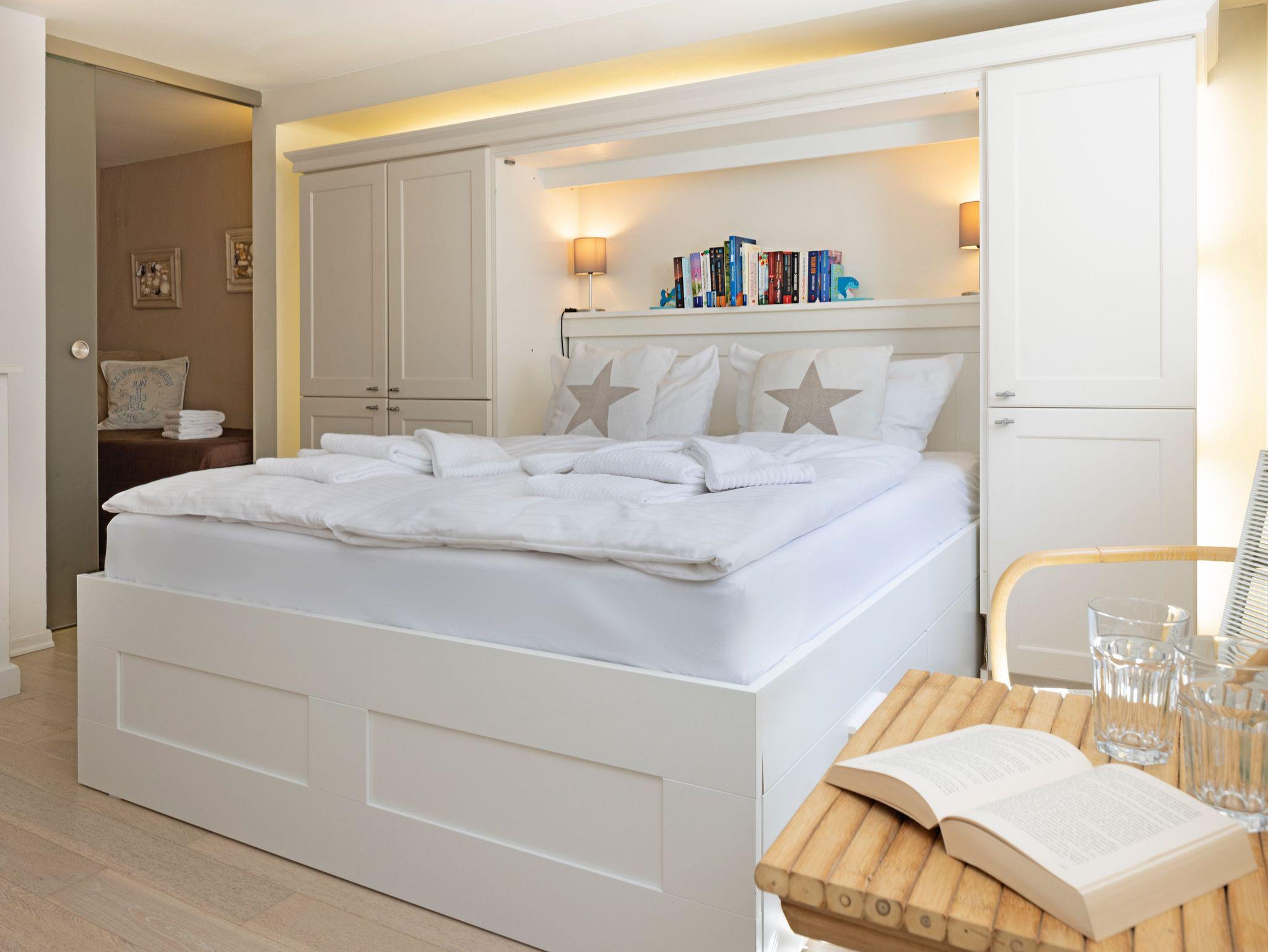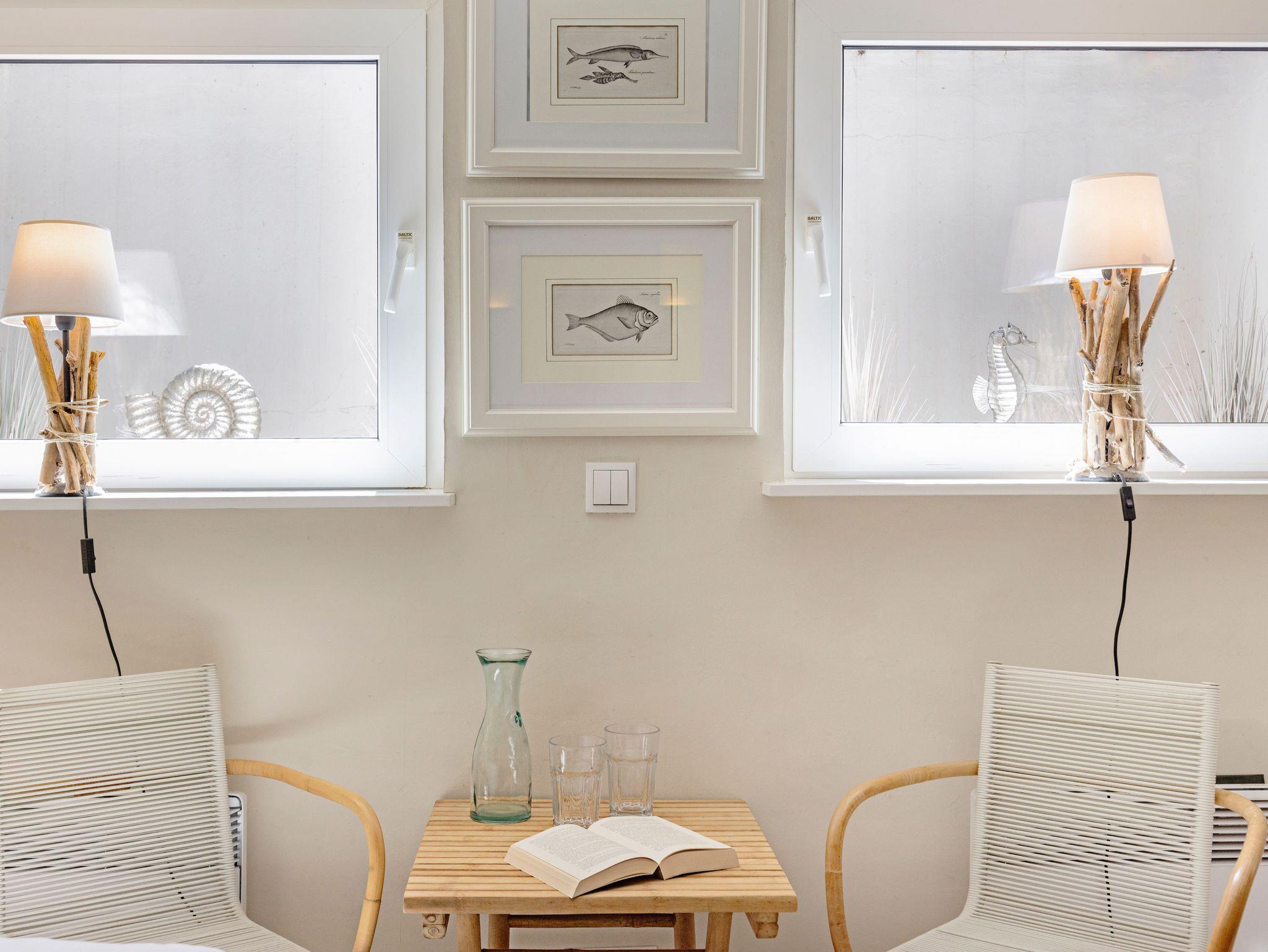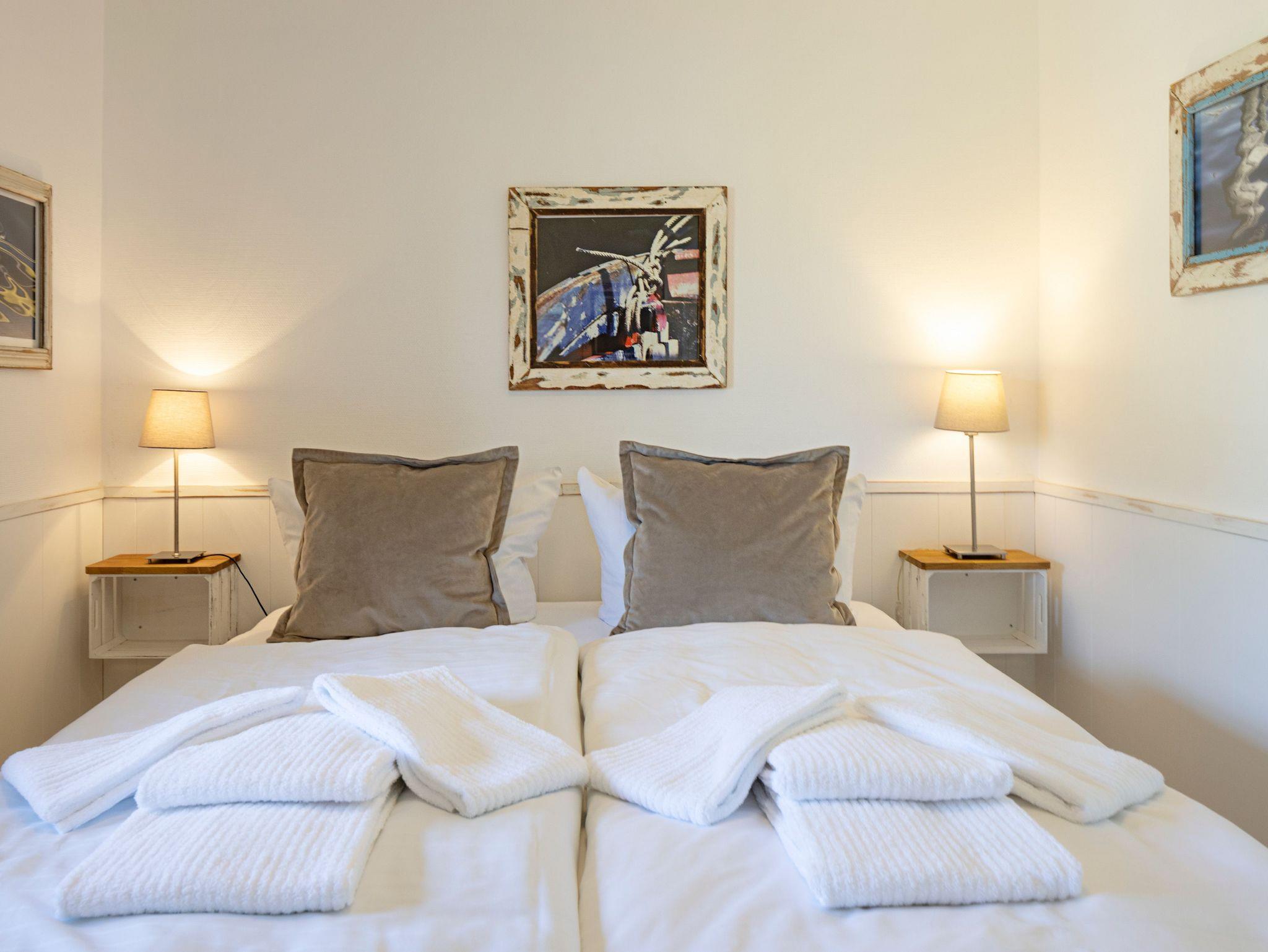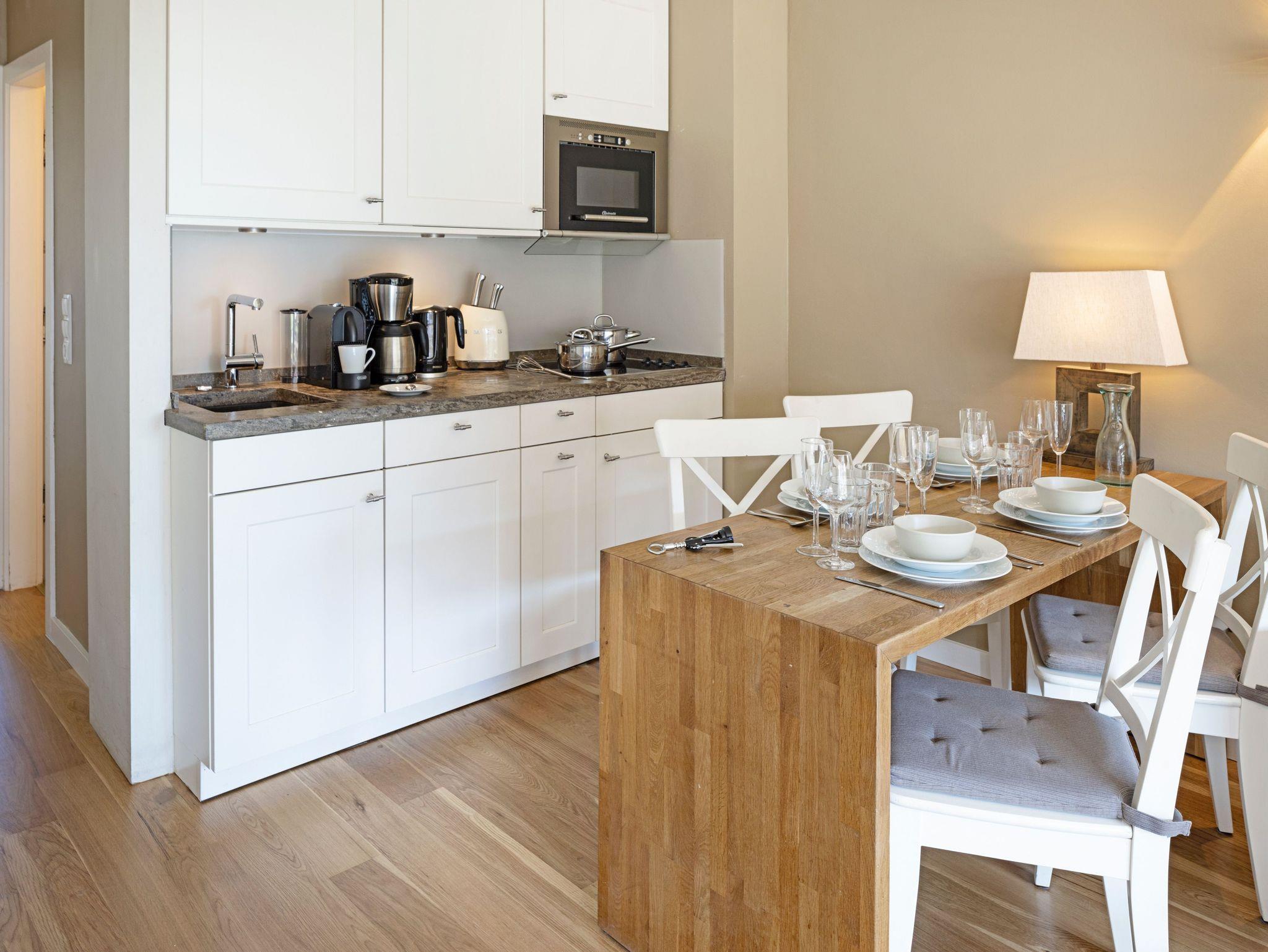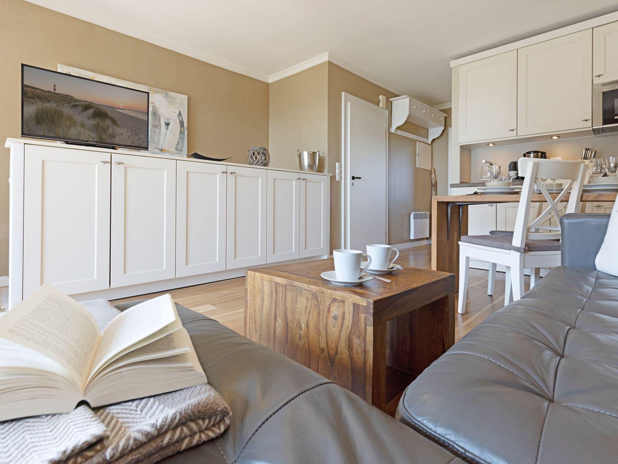 Die Wohnung hat ein separates Schlafzimmer mit Doppelbett, ein Wohnzimmer mit Siematic-Küchenzeile und ein Bad mit Badewanne im Erdgeschoss. Die Küche verfügt über einen Geschirrspüler, eine Mikrowelle und einen separaten Backofen. Über eine offene Landhaustreppe erreicht man das zweite Schlafzimmer mit Doppelbett im Souterrain. Dort befindet sich auch die Sauna mit einem kleinem Vorraum und Ruheliege, sowie ein zweites bisazzagefliestes Badezimmer mit Dusche.