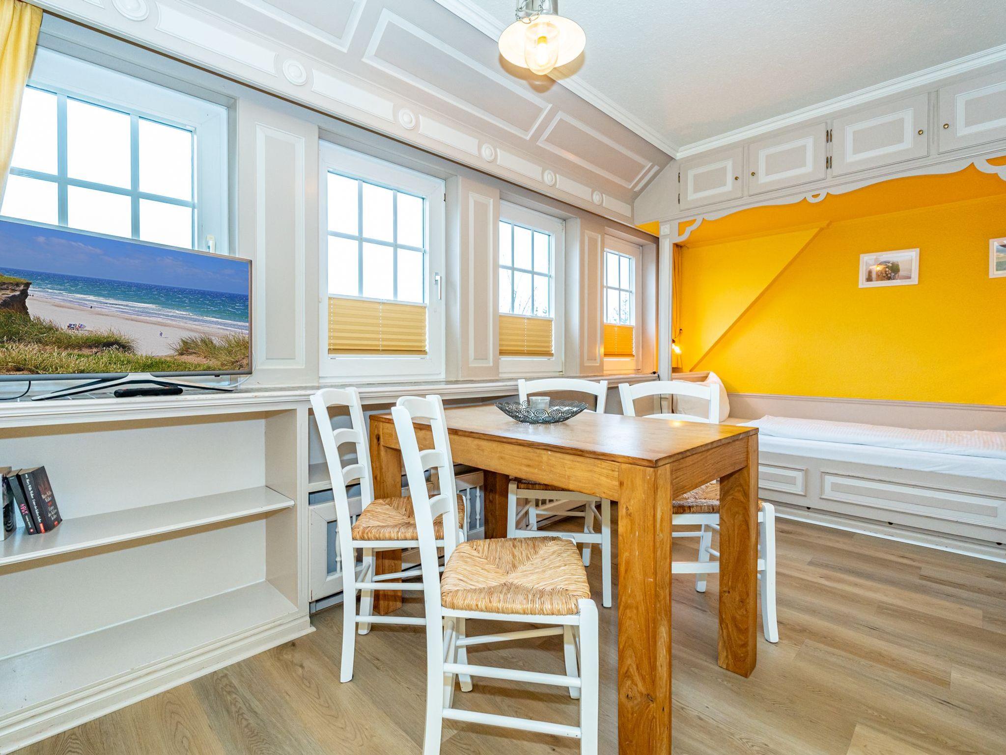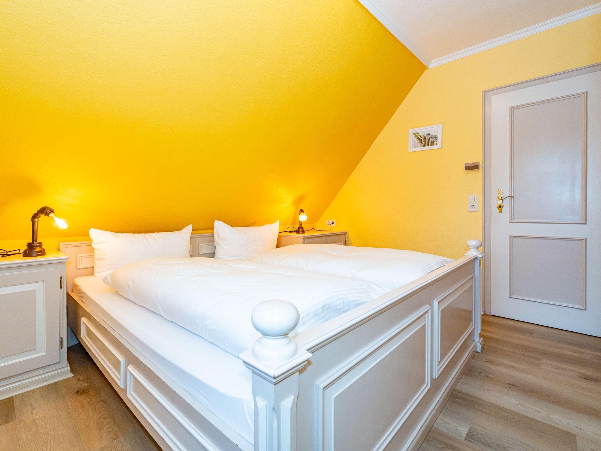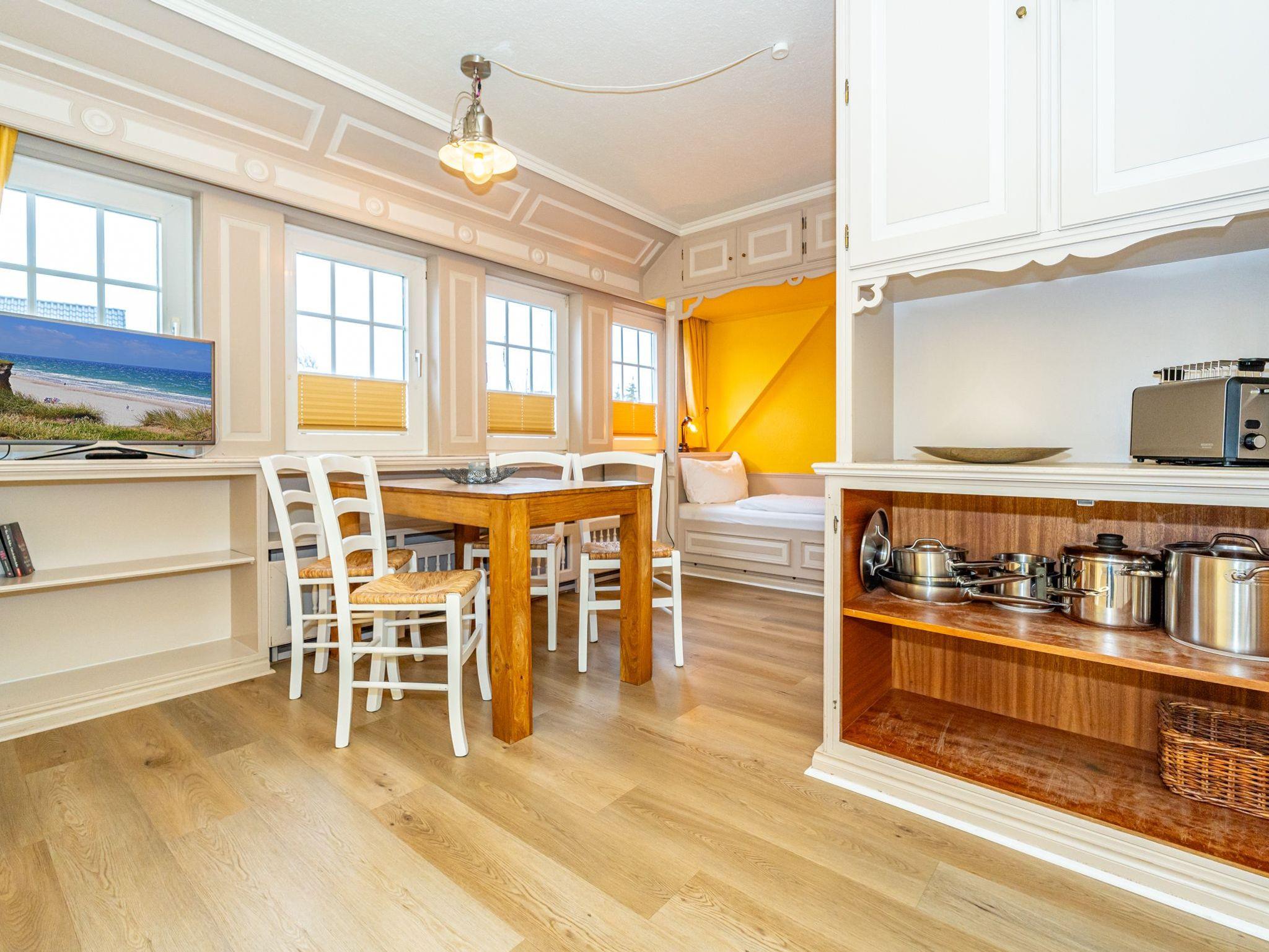 Das fünfte Apartment liegt im 1. Obergeschoss des Hauses und bietet auf 50 Quadratmeter Platz für 4 Personen. Im Wohn- und Essbereich befinden sich zwei gemütliche Alkovenbetten. Das abgetrennte Schlafzimmer verfügt über ein Doppelbett. Die separate Küche grenzt an den Wohnbereich. Bequeme Sitzmöglichkeiten runden das gemütliche Ambiente ab. Das Badezimmer ist ausgestattet mit Dusche, WC und Waschbecken.