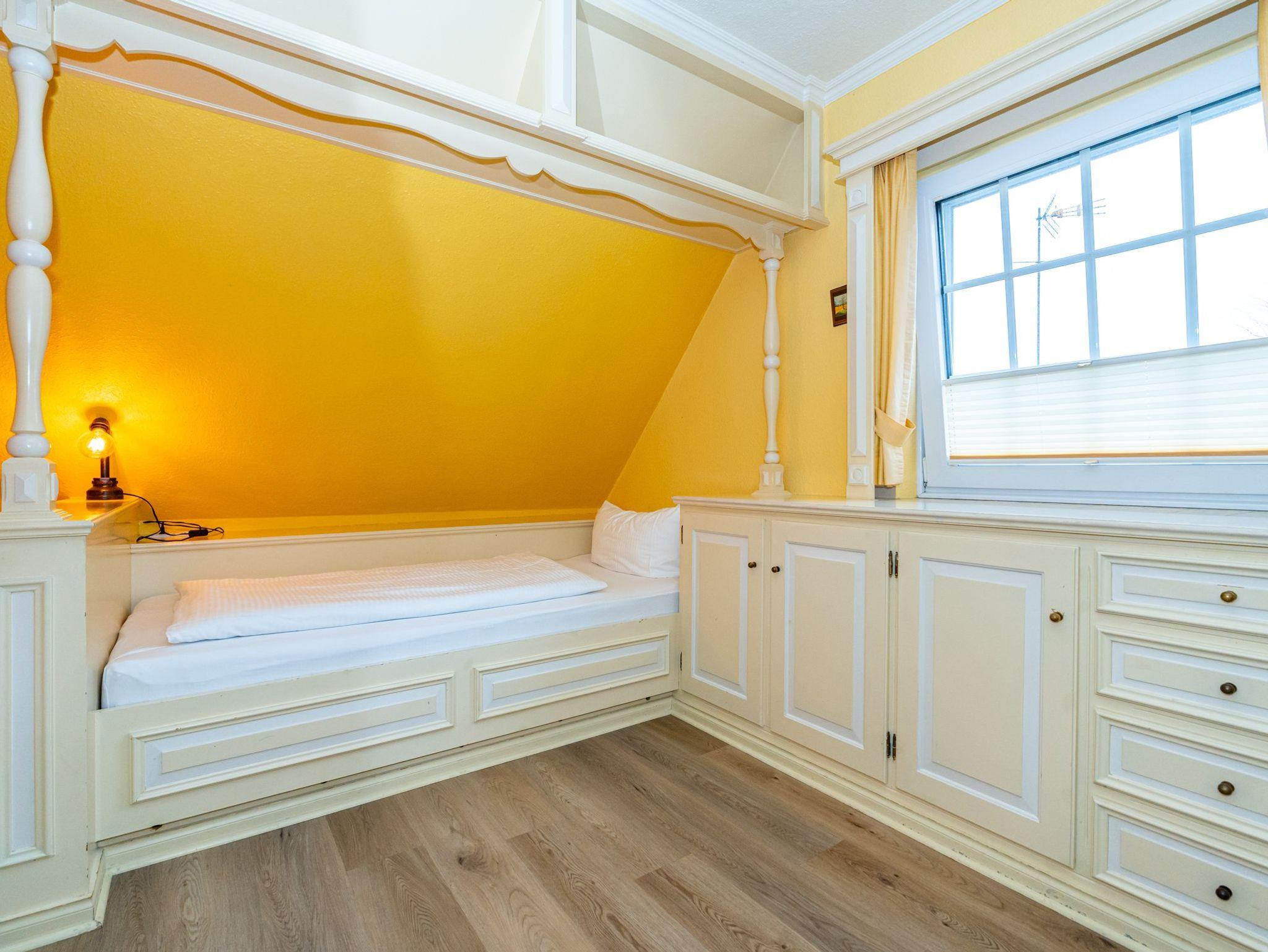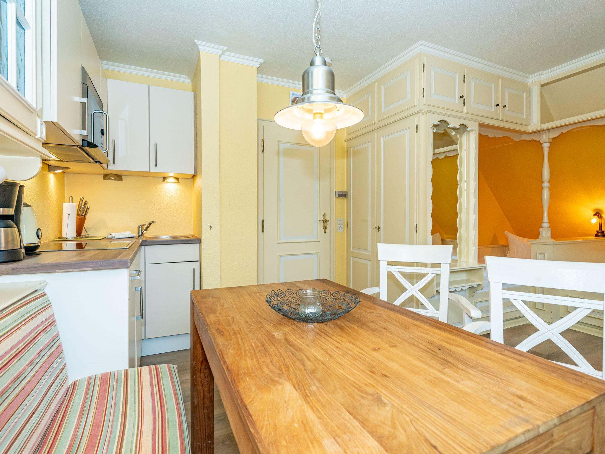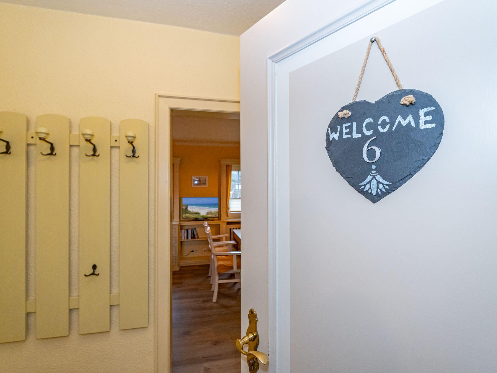 Das Apartment mit der Nummer sechs ist im 1. Obergeschoss zu finden und bietet auf 30 Quadratmeter Platz für 2 Personen. Im offen gestalteten Wohn- und Essbereich stehen 2 gemütliche Alkovenbetten. Das Bad ist ausgestattet mit Dusche, WC und Waschbecken.