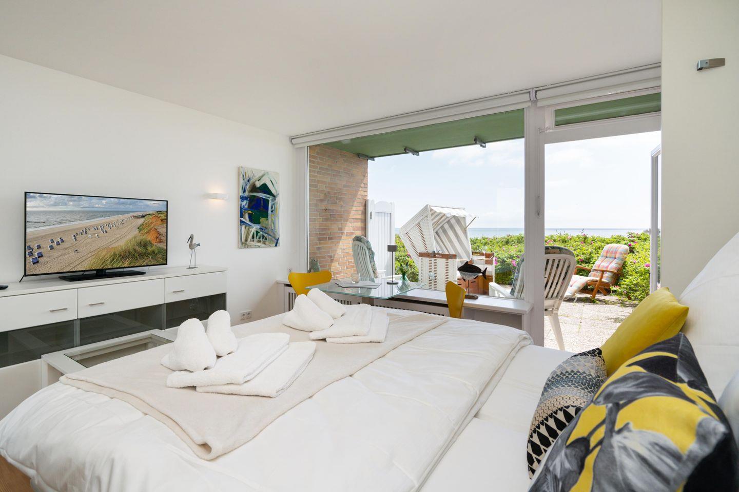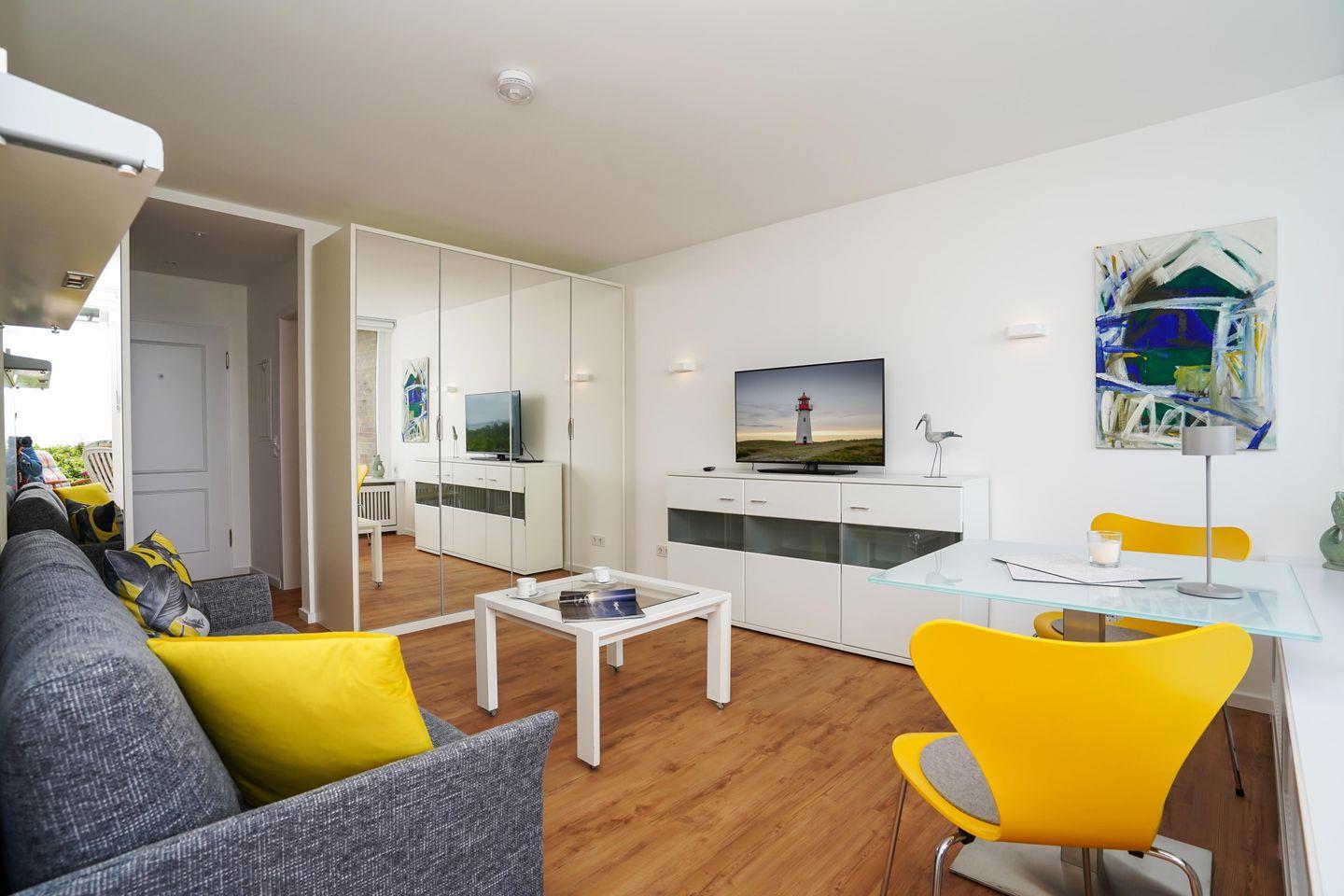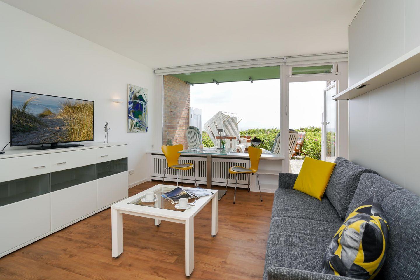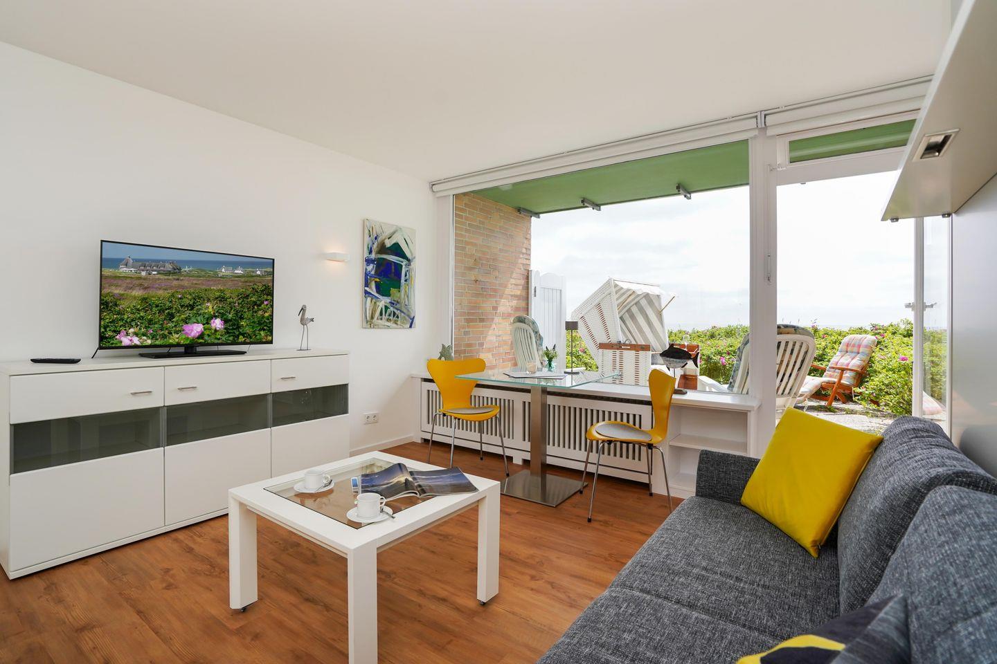Das moderne 1-Zimmer App. "Strandsonne" für bis zu 2 Personen zeichnet sich durch seine direkte Strandlage sowie einen traumhaften Panorama-Meerblick über das Lister Watt aus. Der Wohn-/Schlafbereich inkl. ausklappbaren Schlafsofa sowie Essecke bietet Ihnen eine Kombination aus hochwertiger Ausstattung und höchstem Komfort. Genießen Sie den einzigartigen Blick sowie die Ruhe von der angrenzenden Frühstücksterrasse. Die kleine Küchenzeile samt Geschirrspüler ist voll ausgestattet. Das Badezimmer verfügt über eine Dusche. WLAN steht Ihnen kostenfrei zur Verfügung. Für Ihren PKW steht Ihnen eine Garage zur Verfügung. Haustiere sind erlaubt. Der Fahrstuhl des Apartmenthauses ist nur über Treppenstufen erreichbar.
