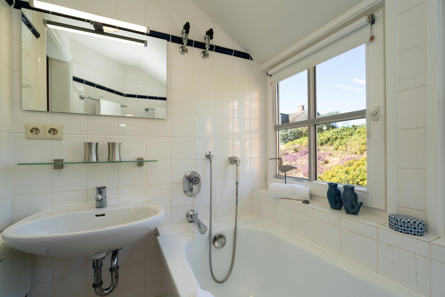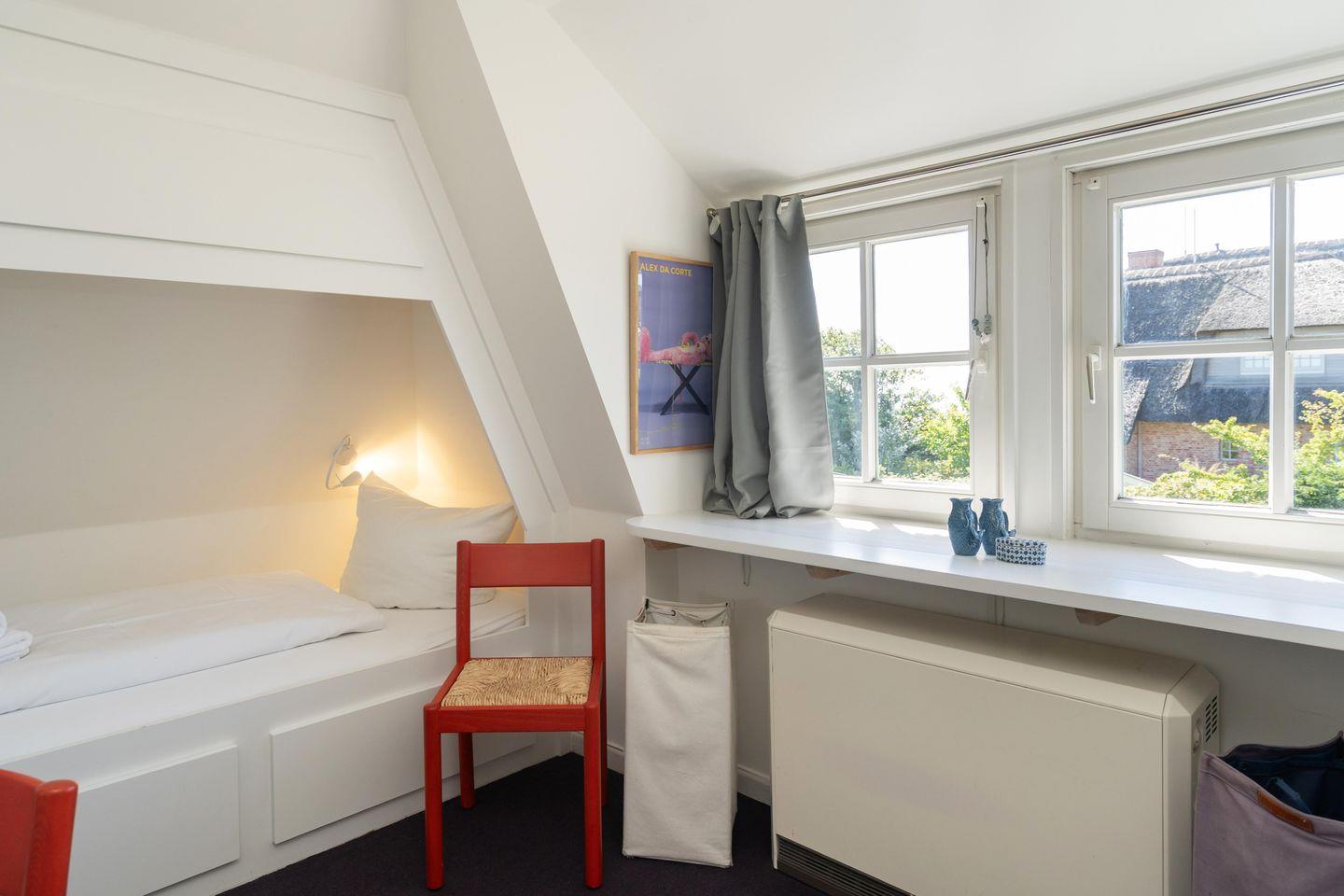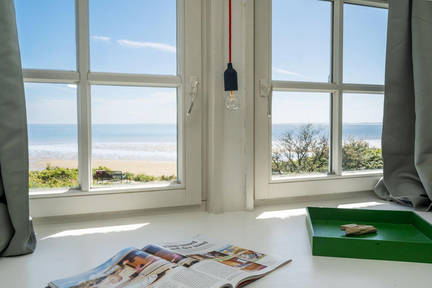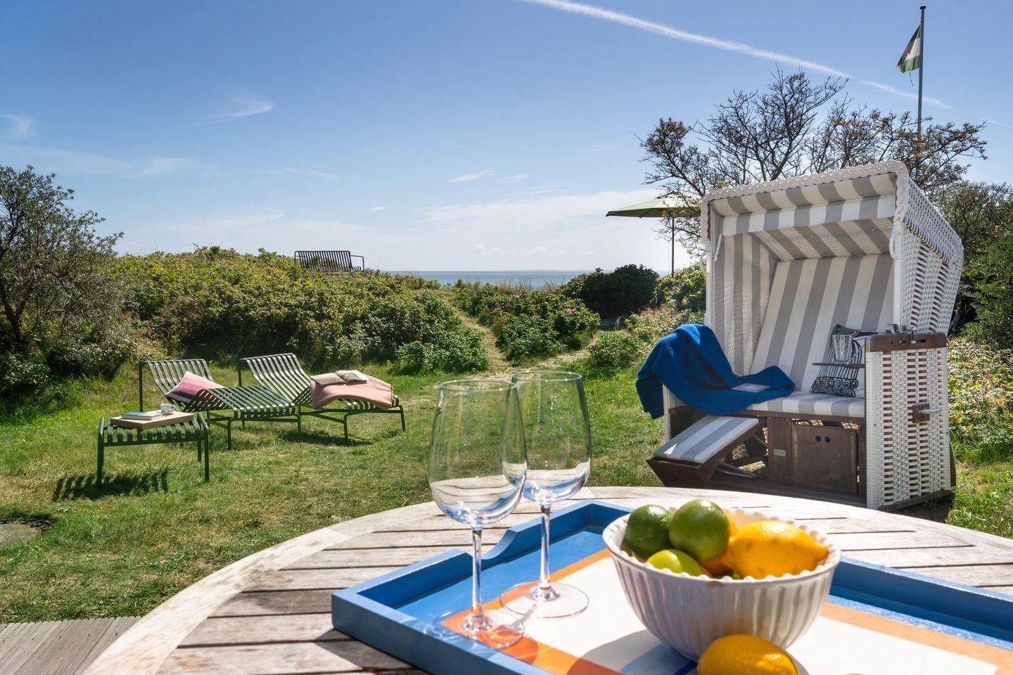 Strandhütte unter Reet. Diese freistehende Traumhaus an der Lister Wasserkante bietet Platz für bis zu 4 Personen und besticht nicht nur durch seinen einzigartigen Meerblick, sondern auch durch seine ausgefallene Inneneinrichtung. Der lichtdurchflutete Wohnbereich mit offener Küche bietet viel Platz zum gemeinsamen Kochen, Essen und Verweilen. Auf der angrenzenden Terrasse samt Gartenmöbeln und Strandkorb lassen sich viele Sonnenstunden verbringen. An kalten Tagen sorgt der Kaminofen im Wohnbereich für warme Temperaturen. Sowohl im Erdgeschoss als auch im Obergeschoss finden Sie ein Badezimmer - eins mit Dusche, eins mit Badewanne. Ansonsten befindet sich ein Doppelschlafzimmer sowie ein Schlafzimmer mit zwei Einzelbetten im Obergeschoss. Die Einbauschränke dort bieten genügend Stauraum für einen Sylturlaub. Auf dem naturbelassenen Grundstück befindet sich in einem separaten Raum die eigene Sauna. WLAN und zugehörige PKW-Stellplätze sind vorhanden. In der Garage stehen Ihnen eine Waschmaschine sowie ein Wäschetrockner zur Verfügung. Diese bietet auch genügend Abstellmöglichkeit für Fahrräder. Haustiere sind willkommen.