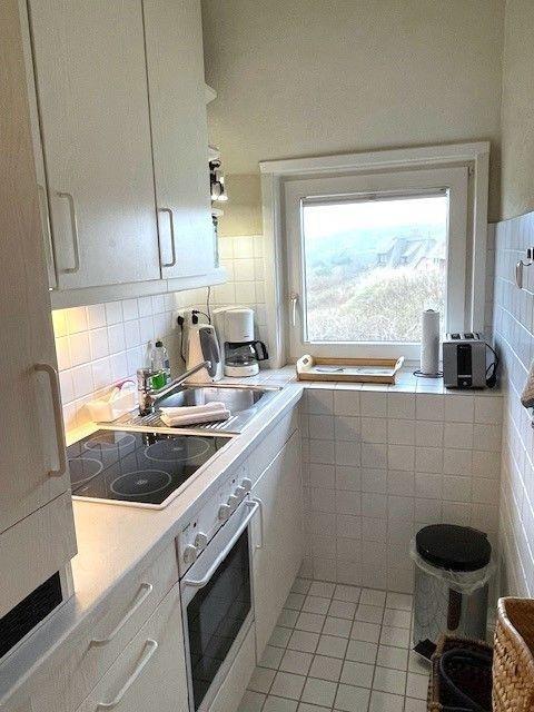Die kleine Küche ist mit einem Ceranfeld, einem Backofen, einem Geschirrspüler und einer Filterkaffeemaschine eingerichtet.