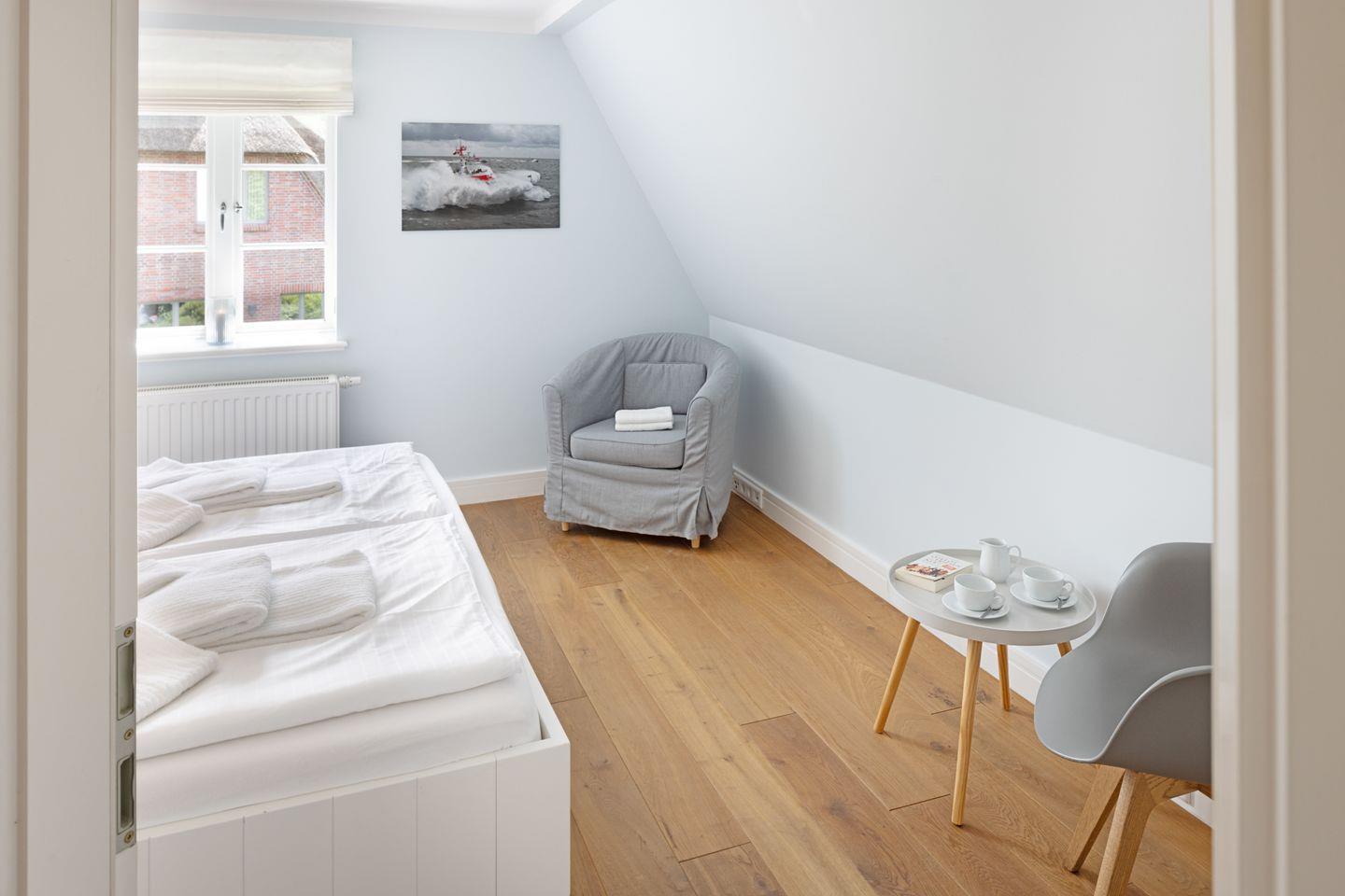 Nordisch moderne Behaglichkeit erwartet sie auch in den geräumigen Schlafzimmern und Bädern im Obergeschoss mit Blick auf die reetgedeckte Nachbarschaft. Zwei Schlafzimmer verfügen über Smart TVs. Der Saunabereich im Untergeschoß lädt sie zum Erholen ein.
