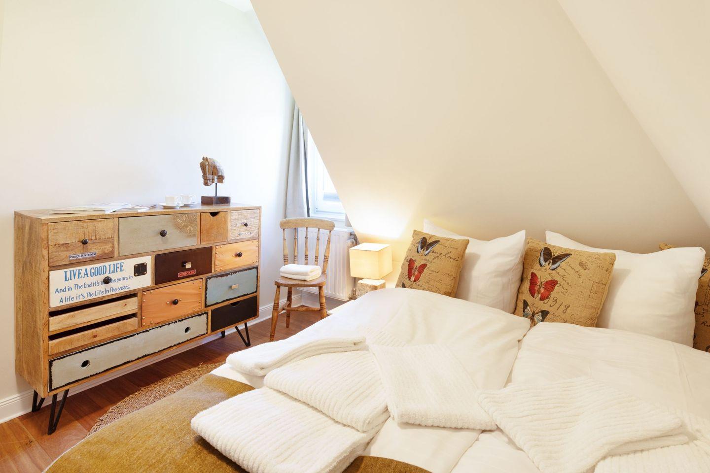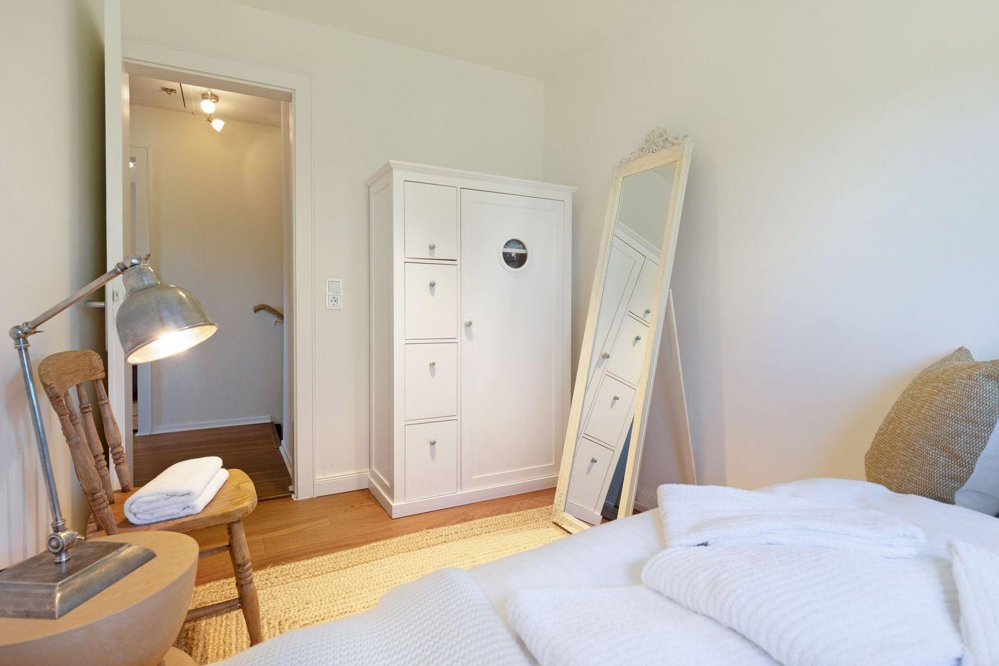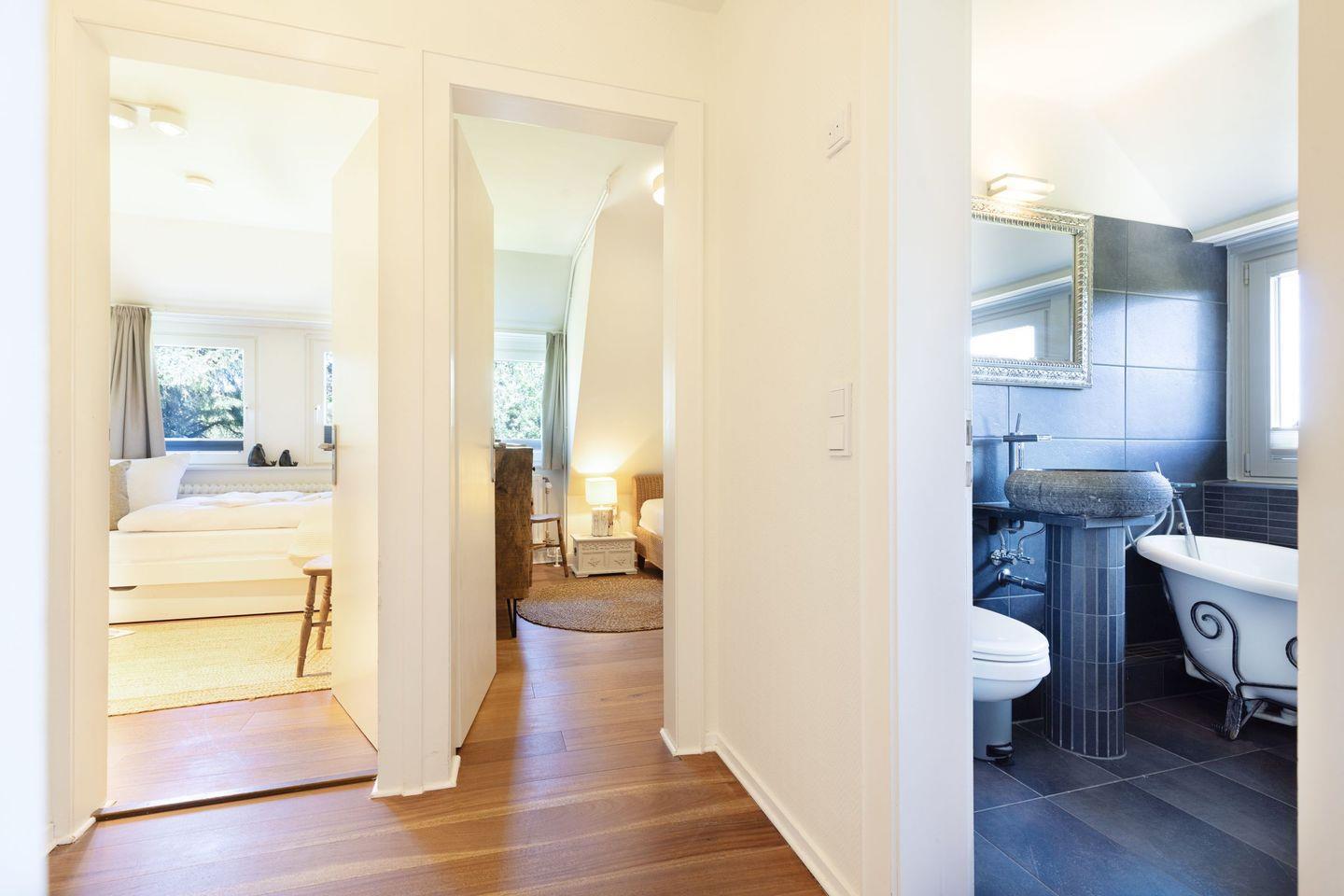 In der oberen Etage befinden sich zwei Schlafzimmer mit Doppelbetten und ein Zimmer mit einem Einzelbett sowie ein Wannenbad.