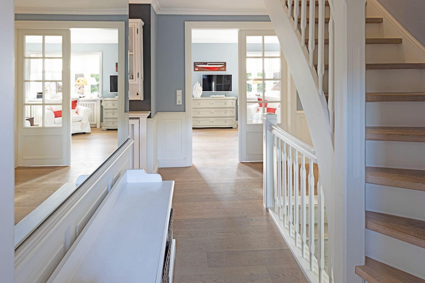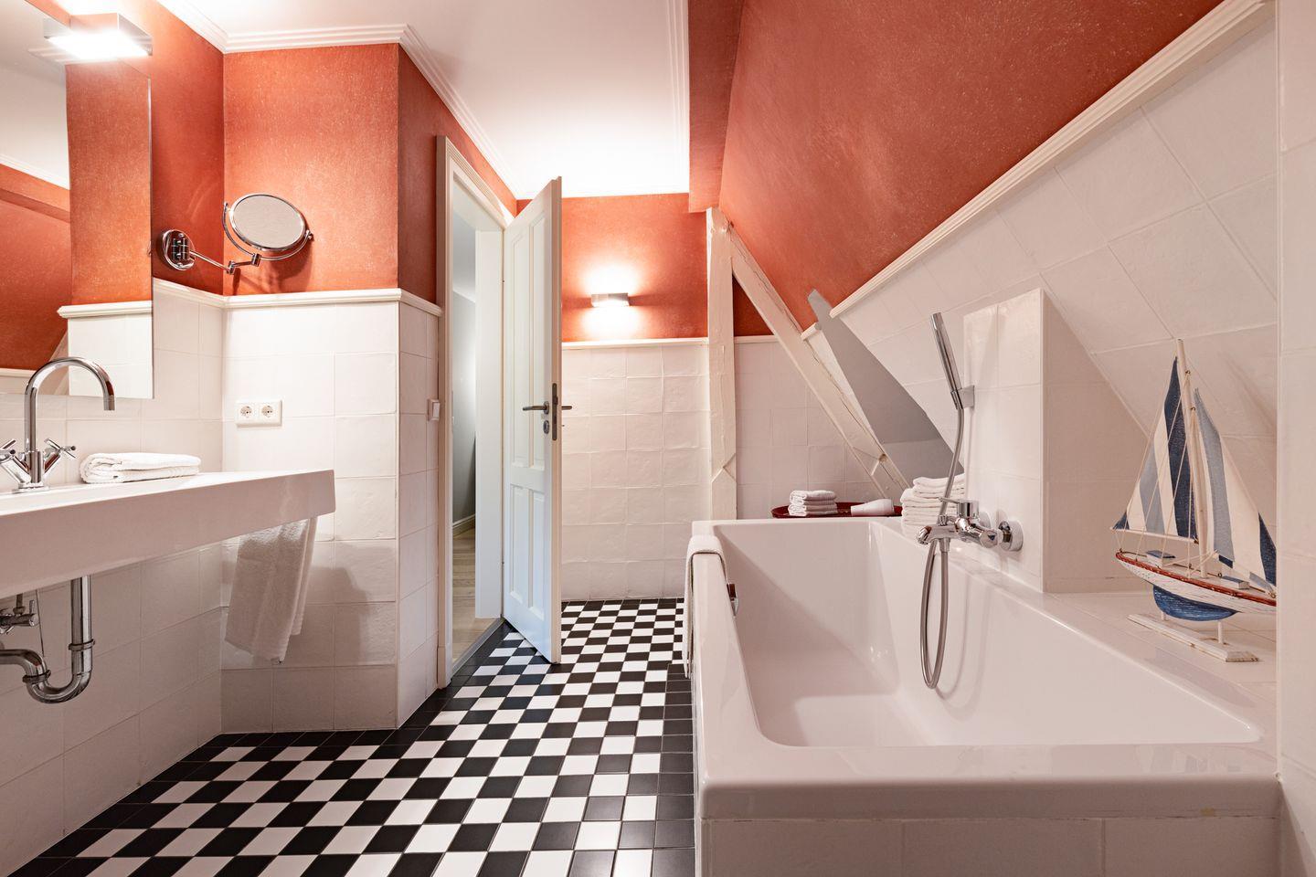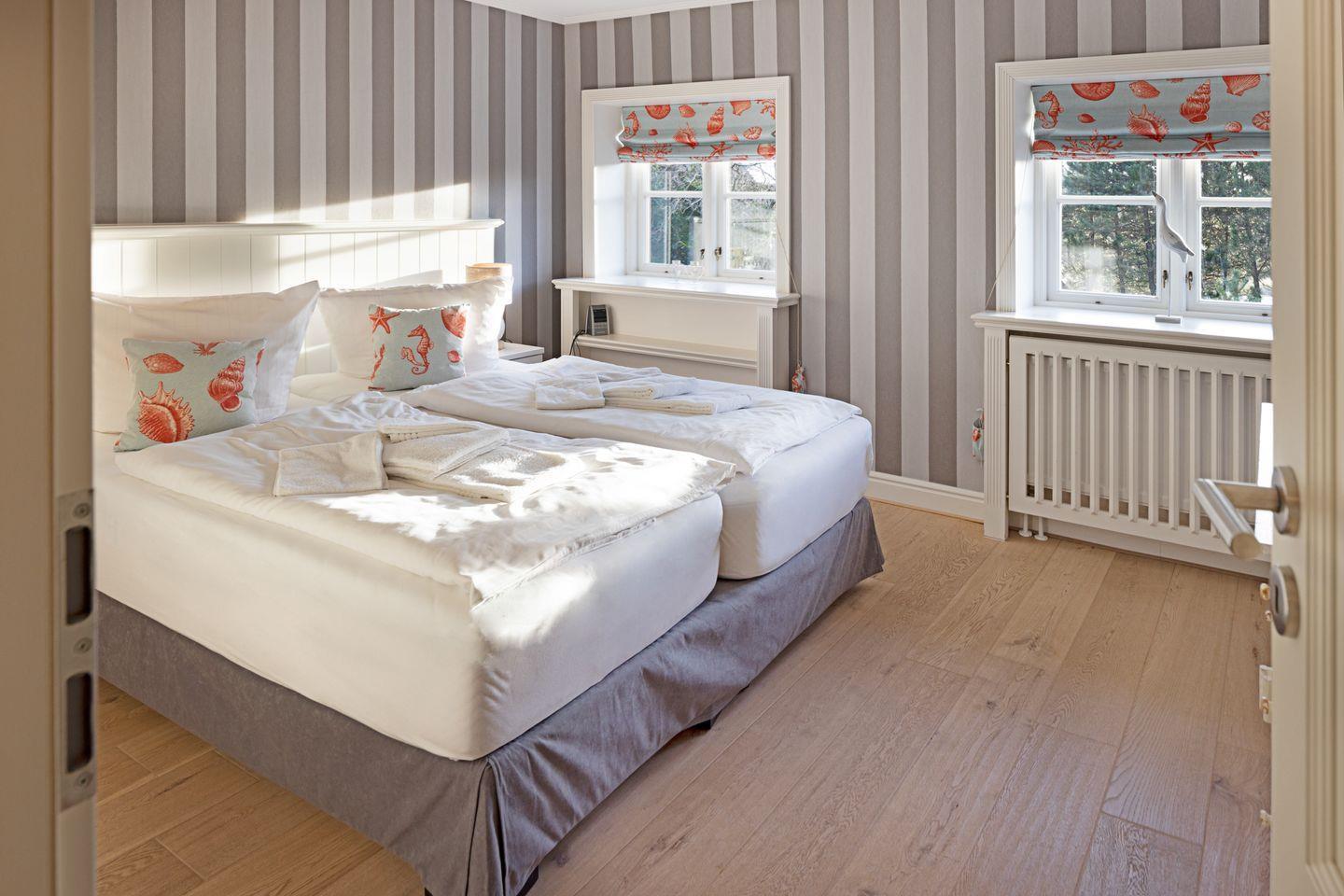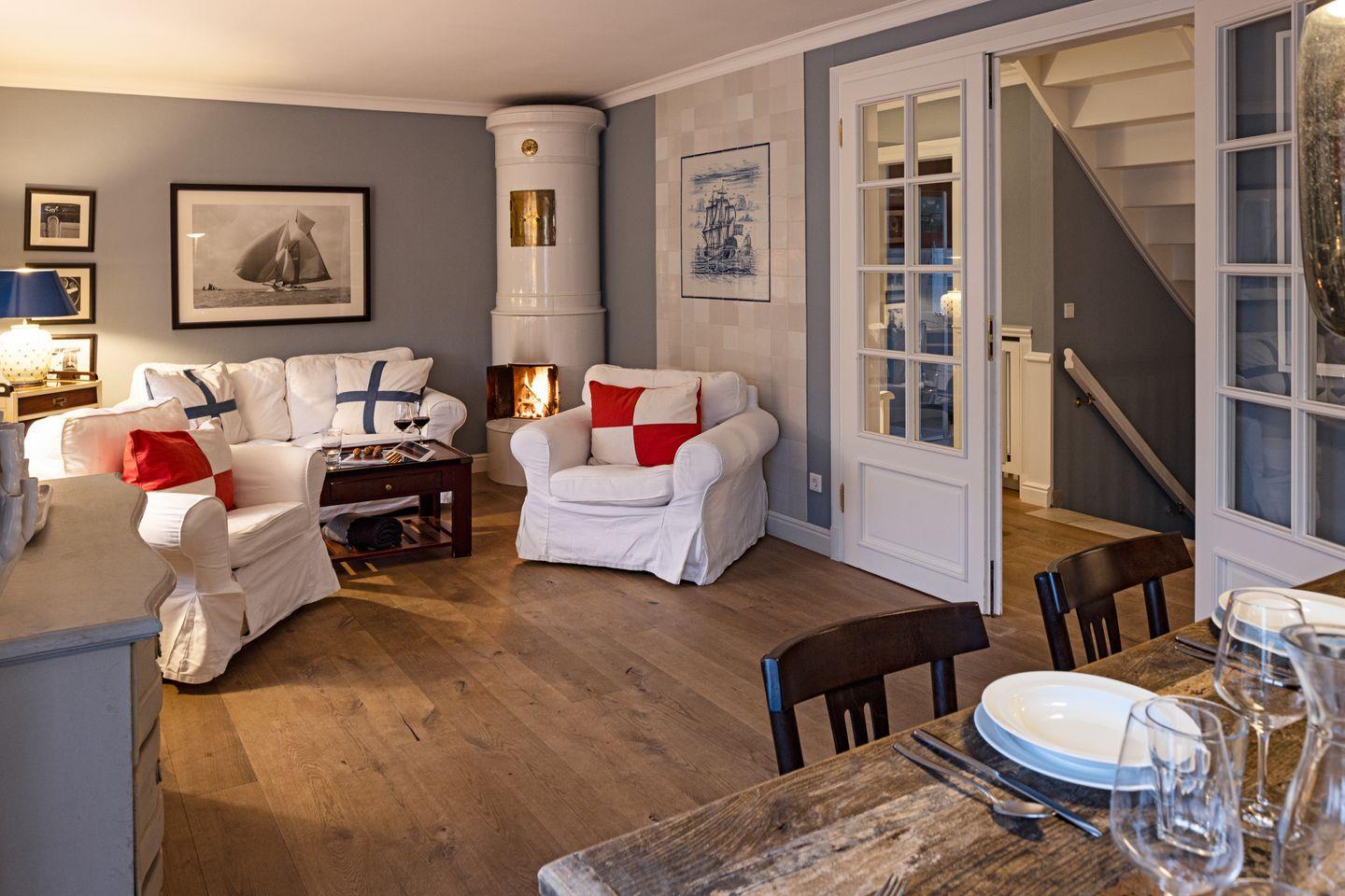 Ihr Haus "Kapitänshaus" verfügt auf 160 m² über zwei Badezimmer und im 1. Stock über zwei Schlafzimmer mit Doppelbetten.