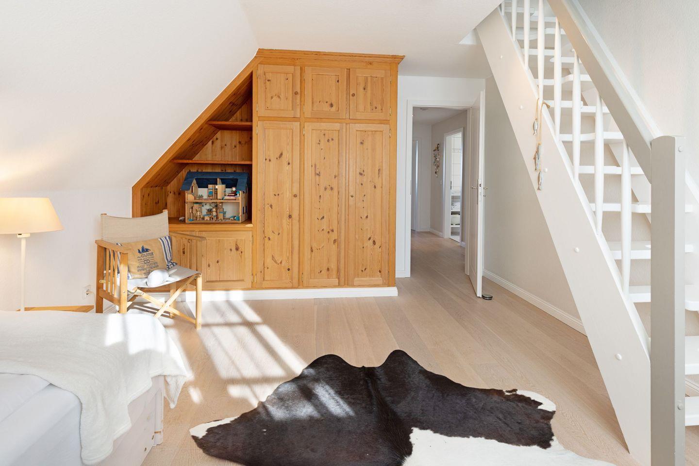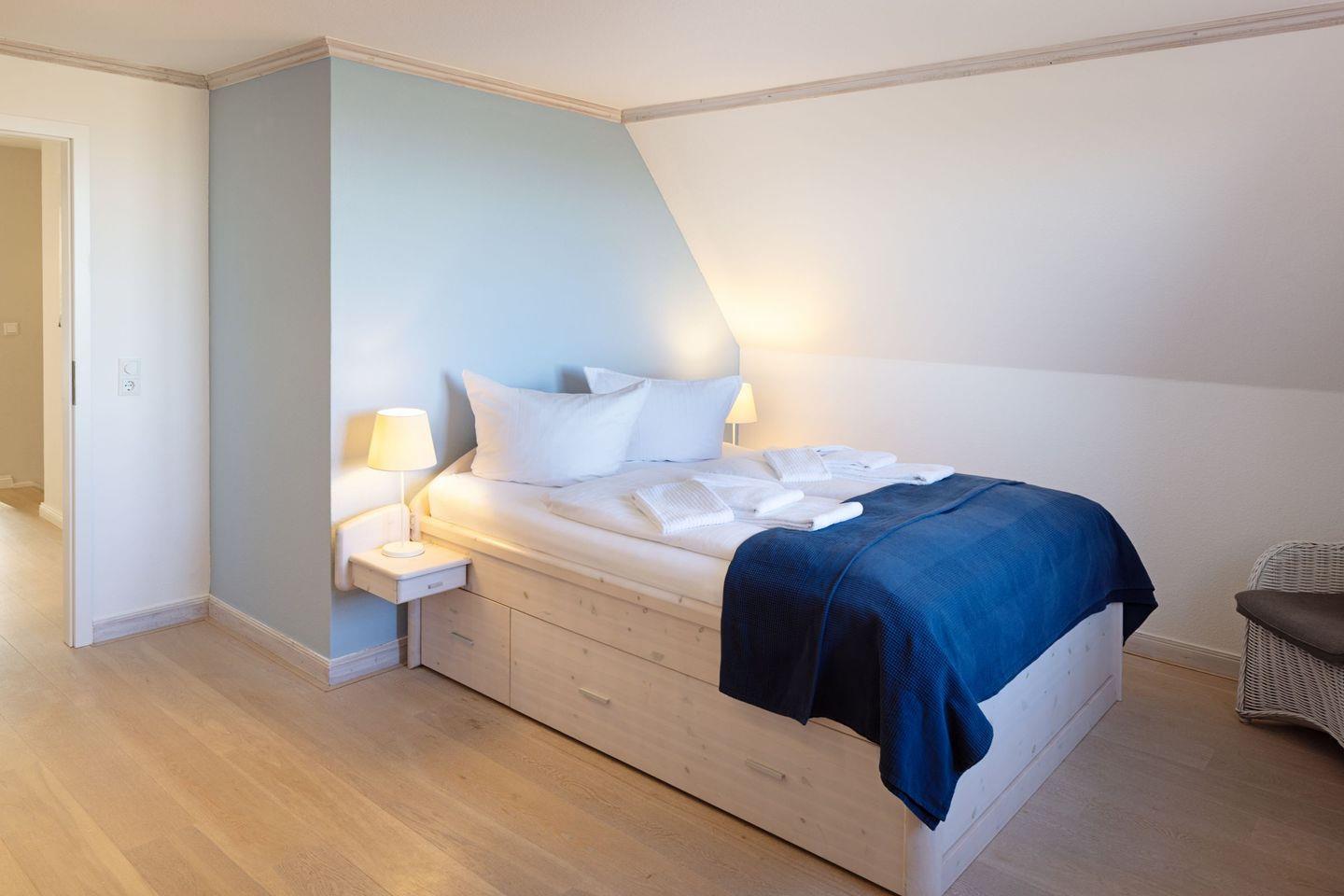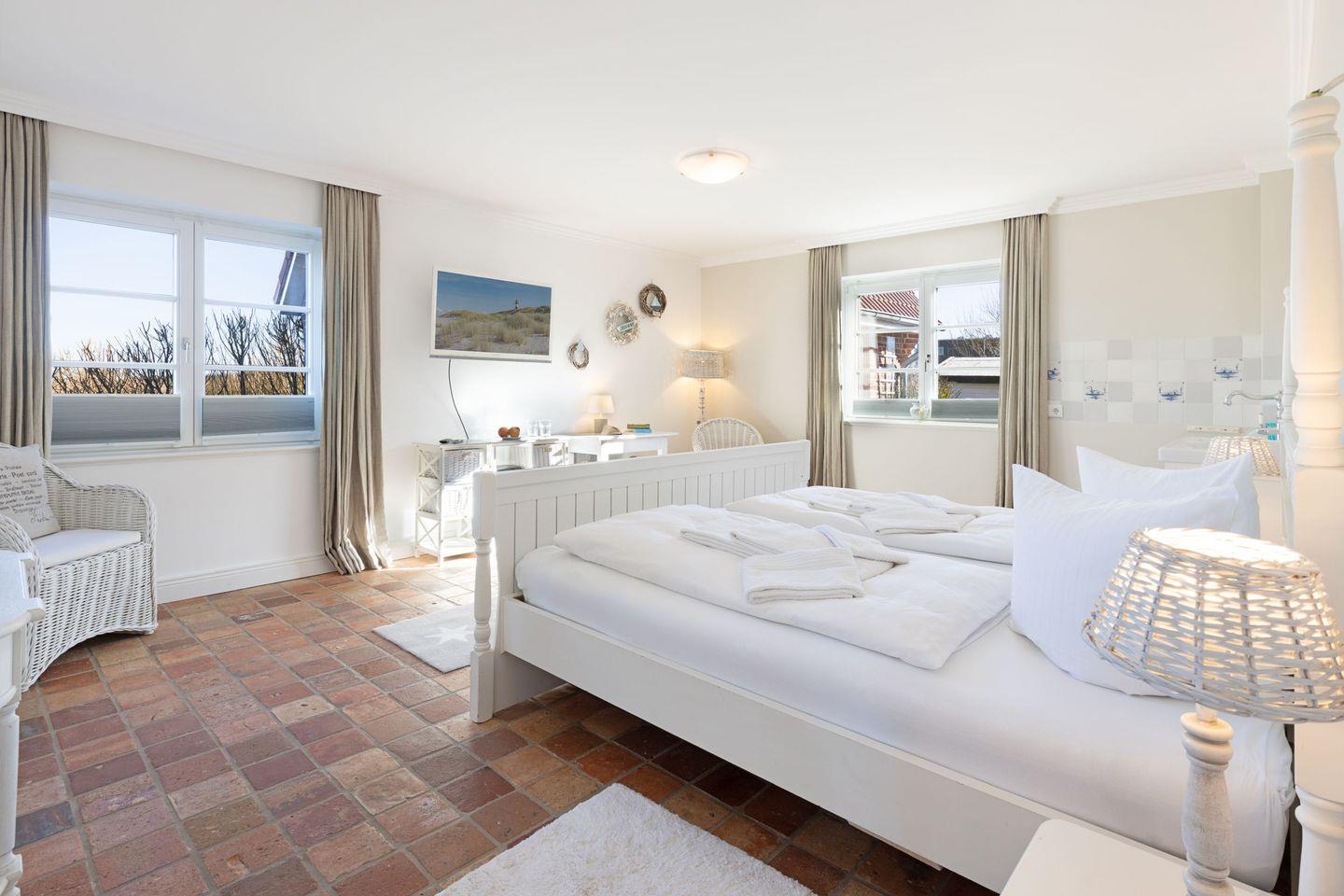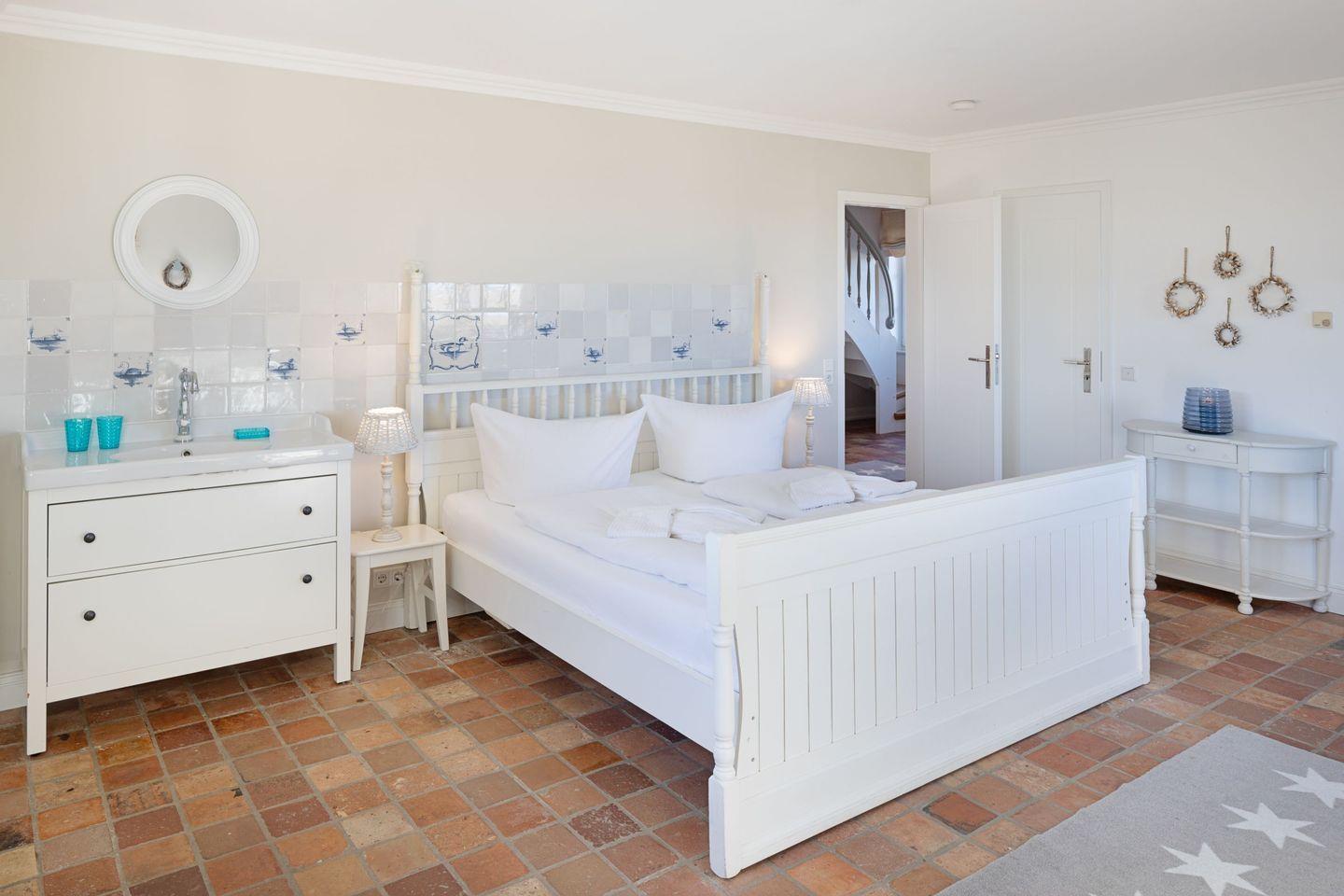 Ein Schlafzimmer mit Doppelbett plus Duschbad befindet sich im Erdgeschoss. Die weiteren Schlafzimmer sind im 1.Stock.