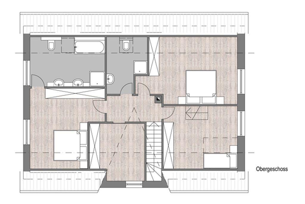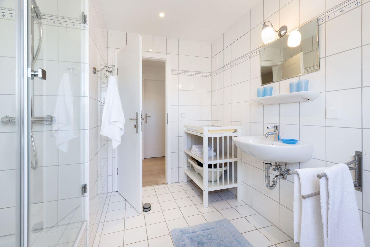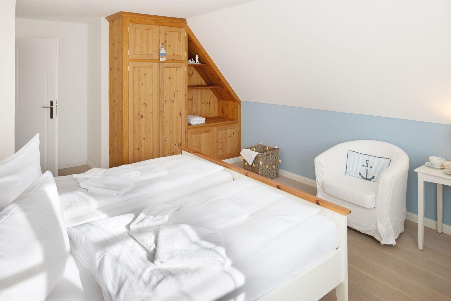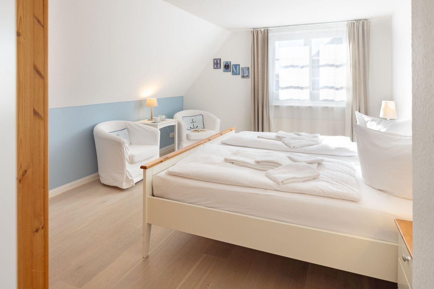 Ein Schlafzimmer mit Doppelbett plus Duschbad befindet sich im Erdgeschoss. Die weiteren Schlafzimmer sind im 1.Stock.