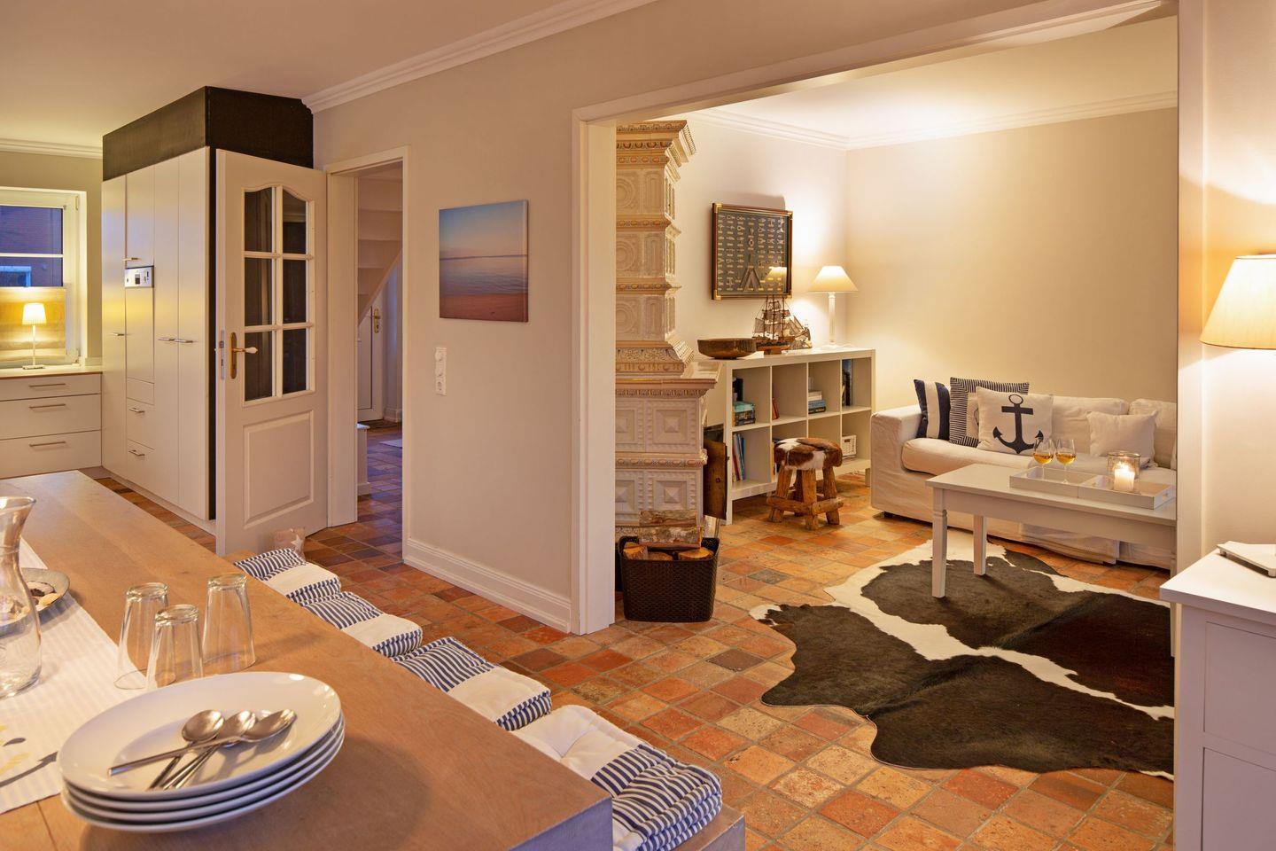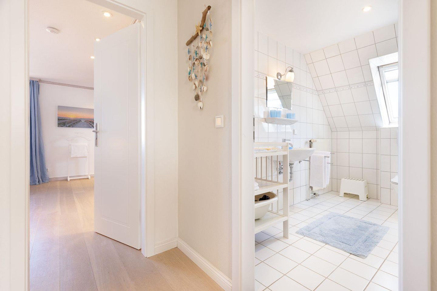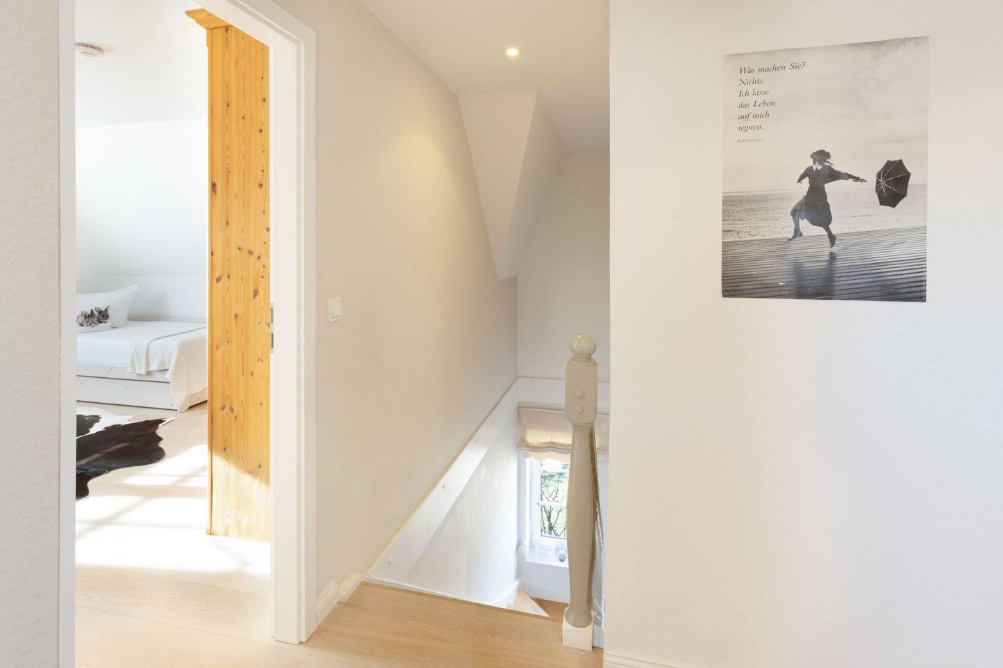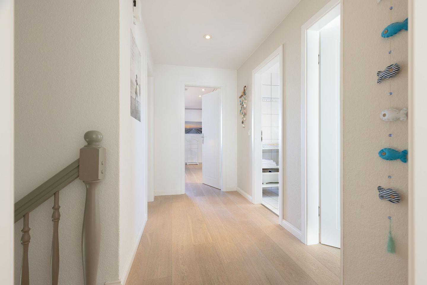 Im Flur im 1. Stock befindet sich ein weiteres Bad. Ein lauschiger Garten ermöglicht Spiel und Spaß. Hier können Sie Ihre Seele baumeln lassen. Das Haus bietet Platz für bis zu acht Personen (180 m²) und ist ideal für Gäste mit gehobenen Ansprüchen. Die Wohnküche bietet viel Platz um in großer oder kleiner Runde beisammen zu sitzen. Gemütliche Stunden zum Entspannen verspricht das bezaubernde Kaminzimmer (Mylin Kamin).