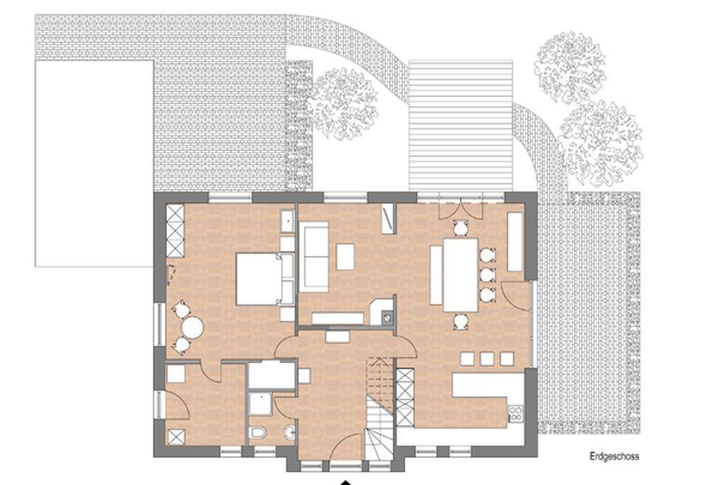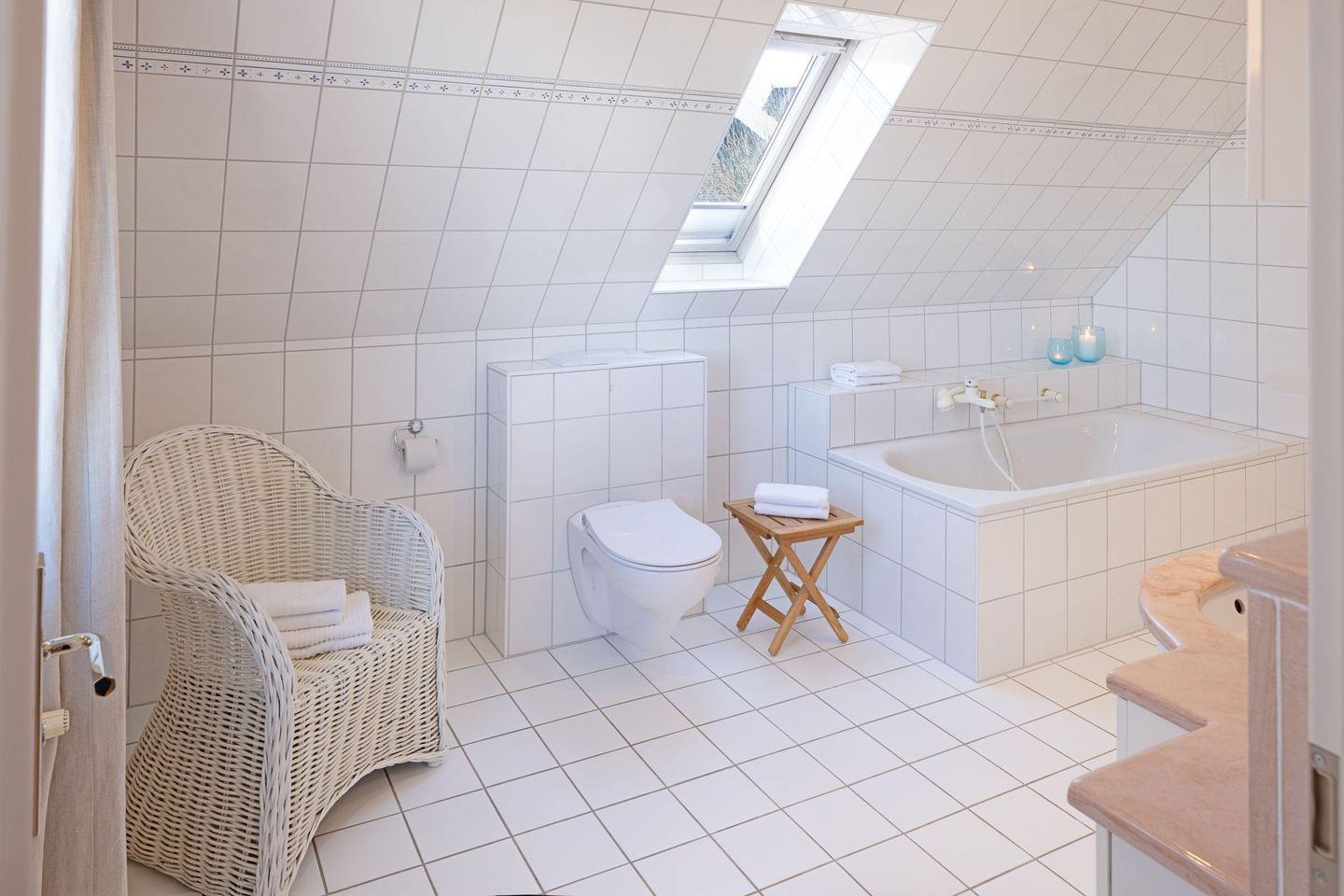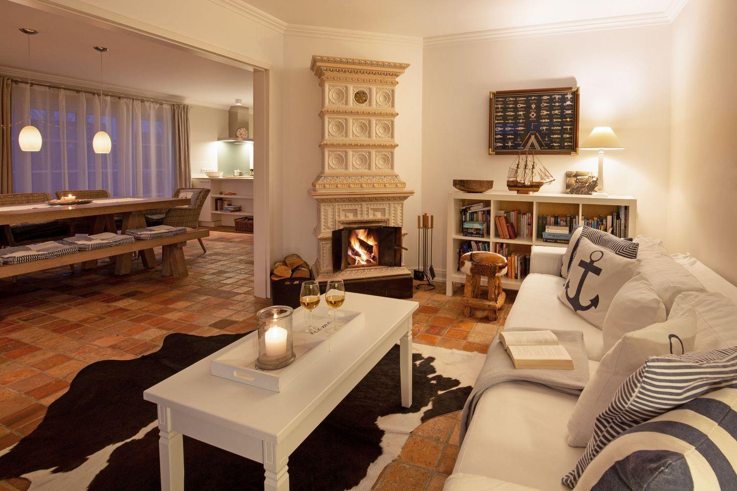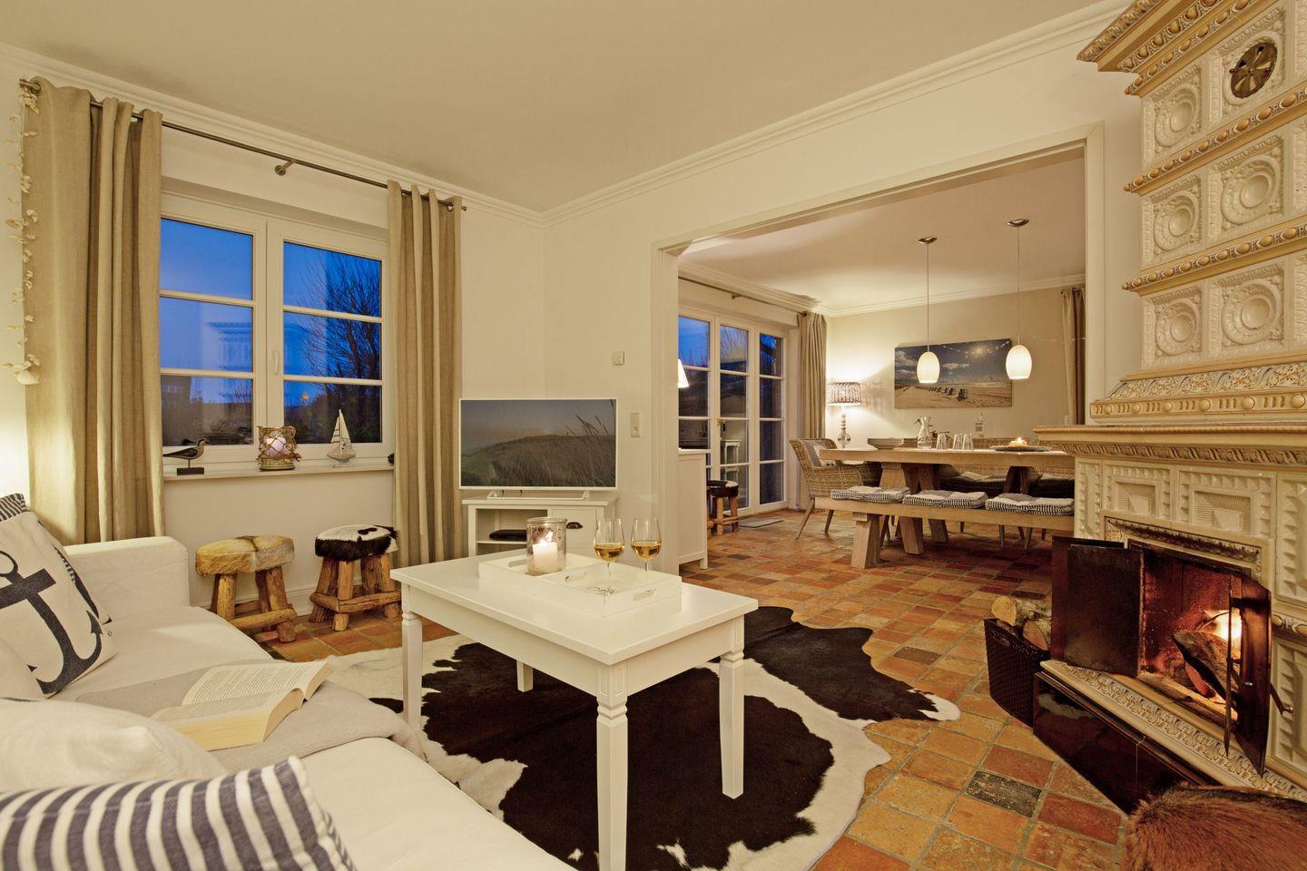 Im Flur im 1. Stock befindet sich ein weiteres Bad. Ein lauschiger Garten ermöglicht Spiel und Spaß. Hier können Sie Ihre Seele baumeln lassen. Das Haus bietet Platz für bis zu acht Personen (180 m²) und ist ideal für Gäste mit gehobenen Ansprüchen. Die Wohnküche bietet viel Platz um in großer oder kleiner Runde beisammen zu sitzen. Gemütliche Stunden zum Entspannen verspricht das bezaubernde Kaminzimmer (Mylin Kamin).