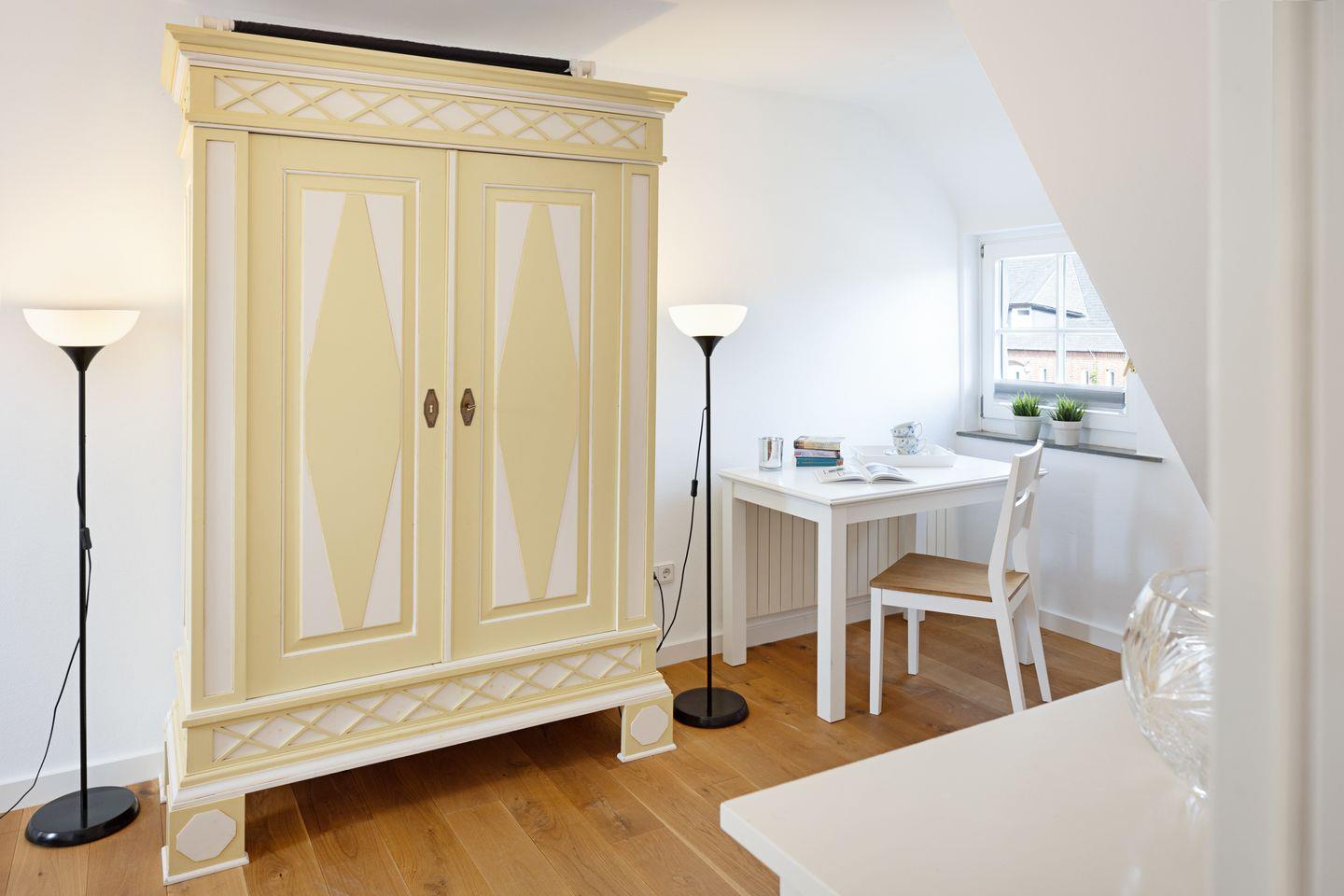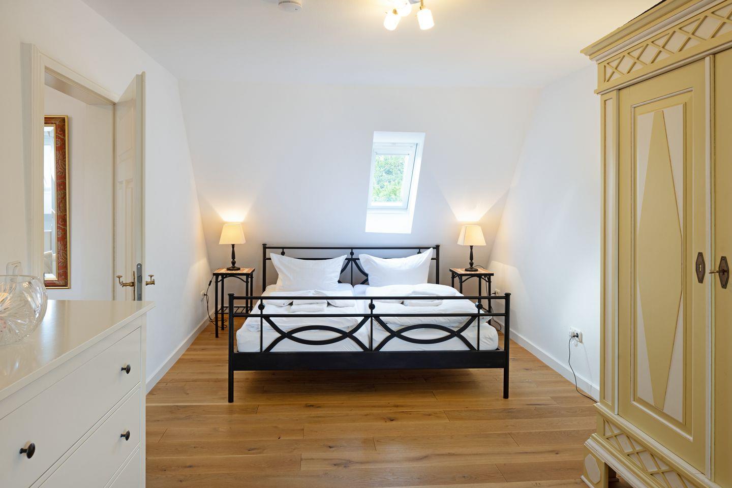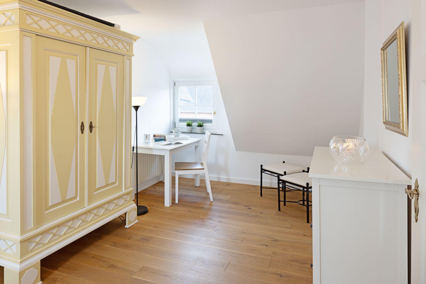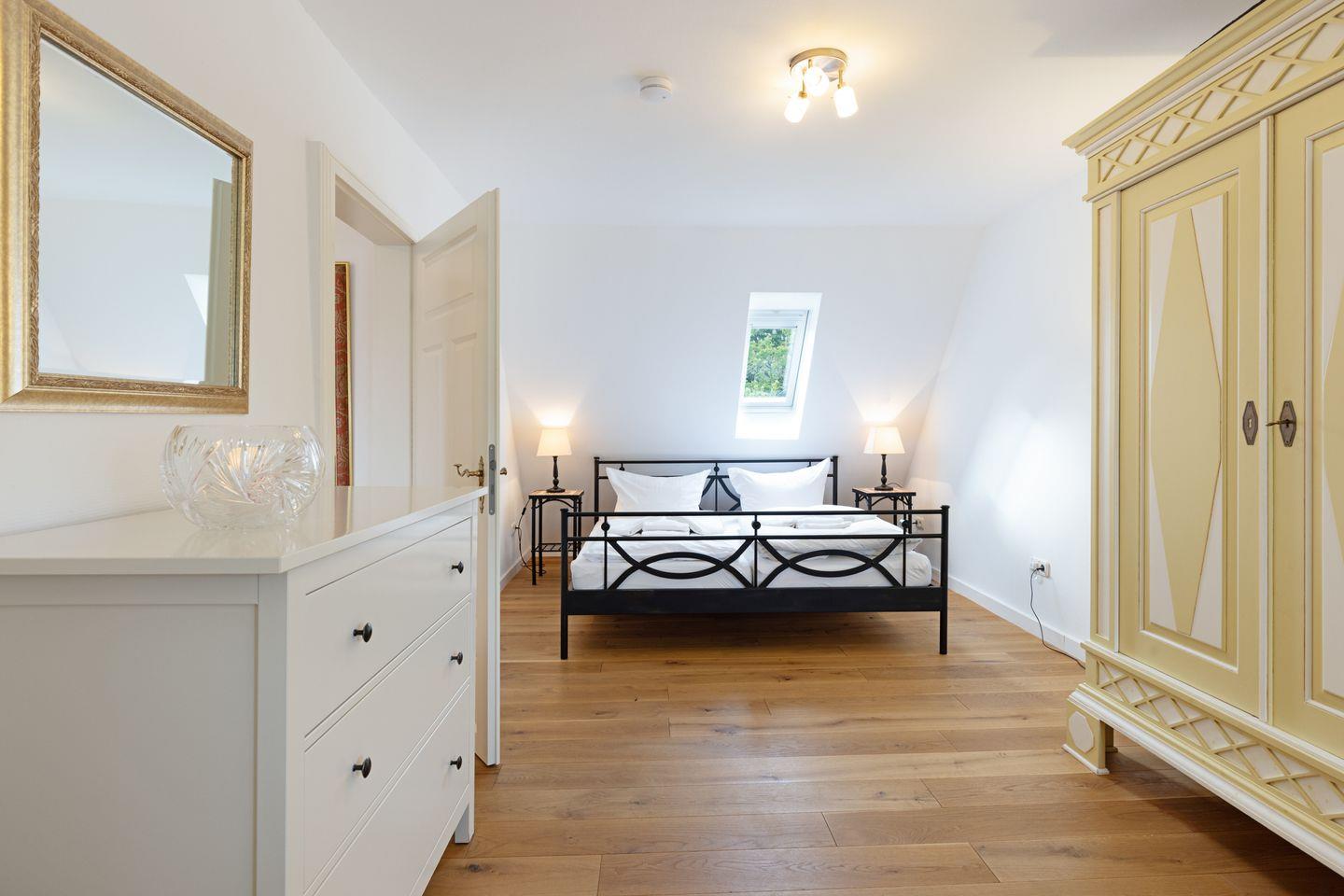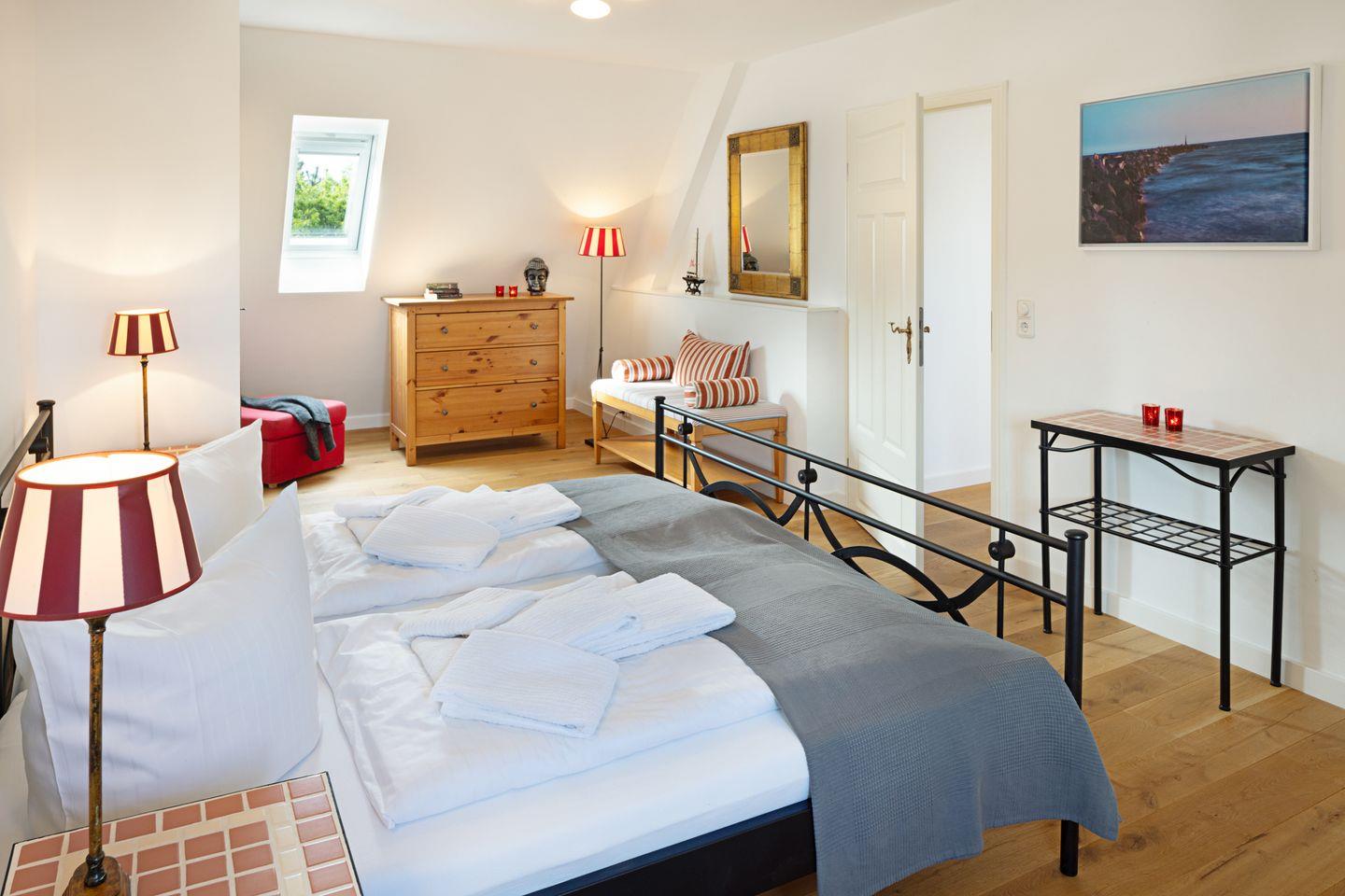 Es verfügt im 1. Stock über zwei Schlafzimmer mit Doppelbetten und Bad mit Wanne und im EG ein Schlafzimmer mit Etagenbett