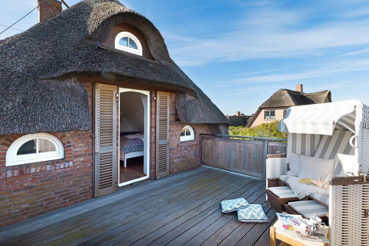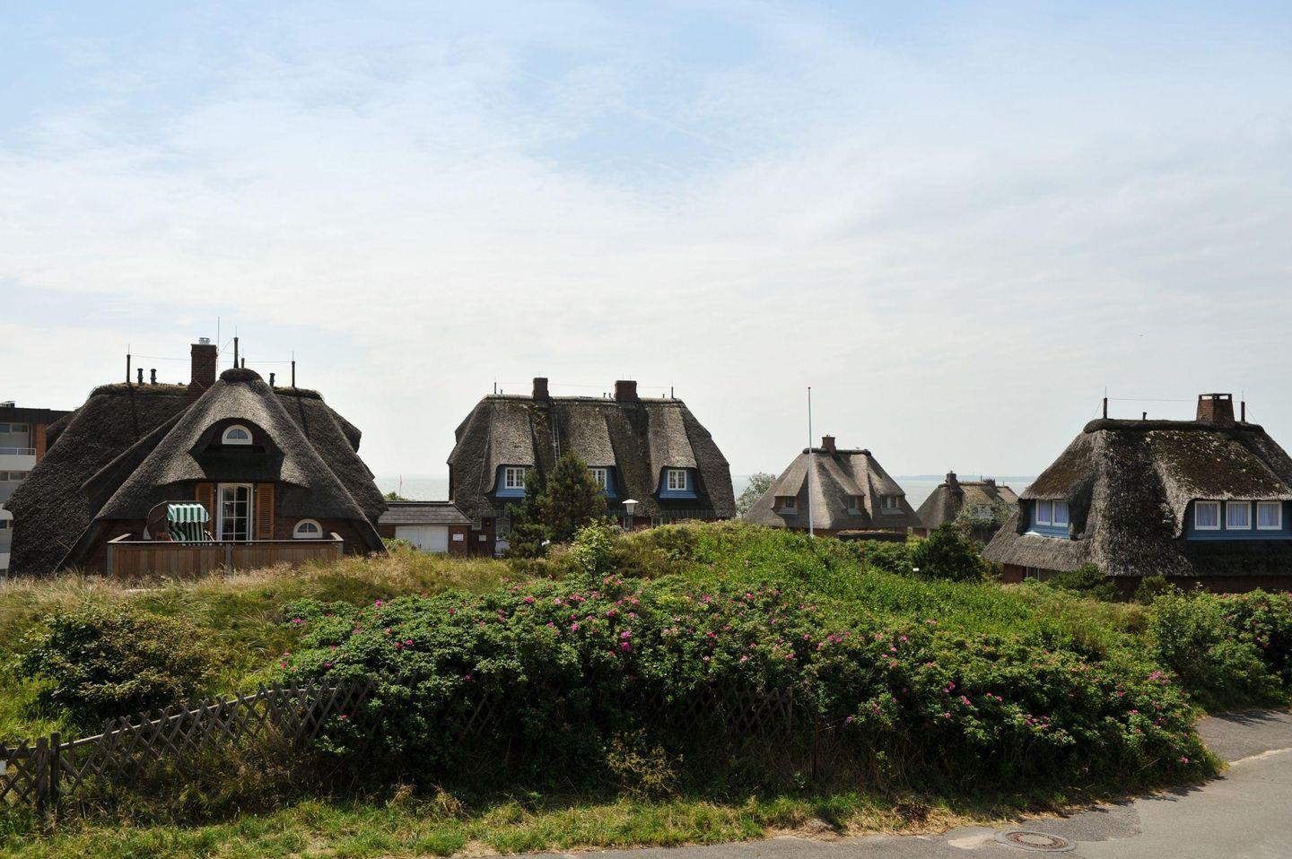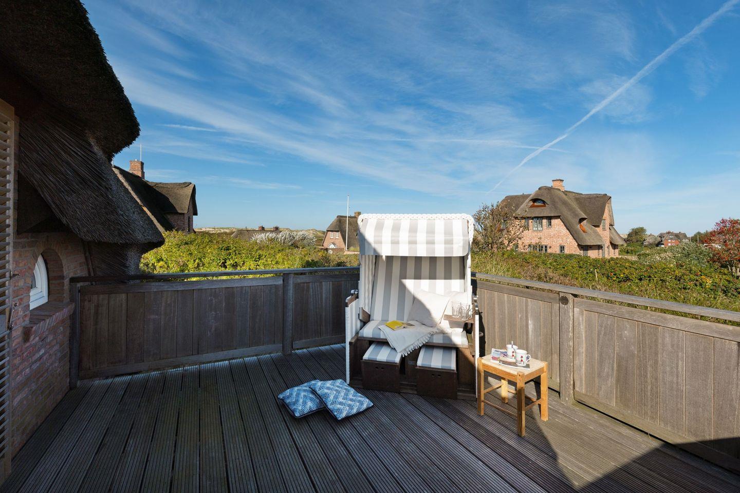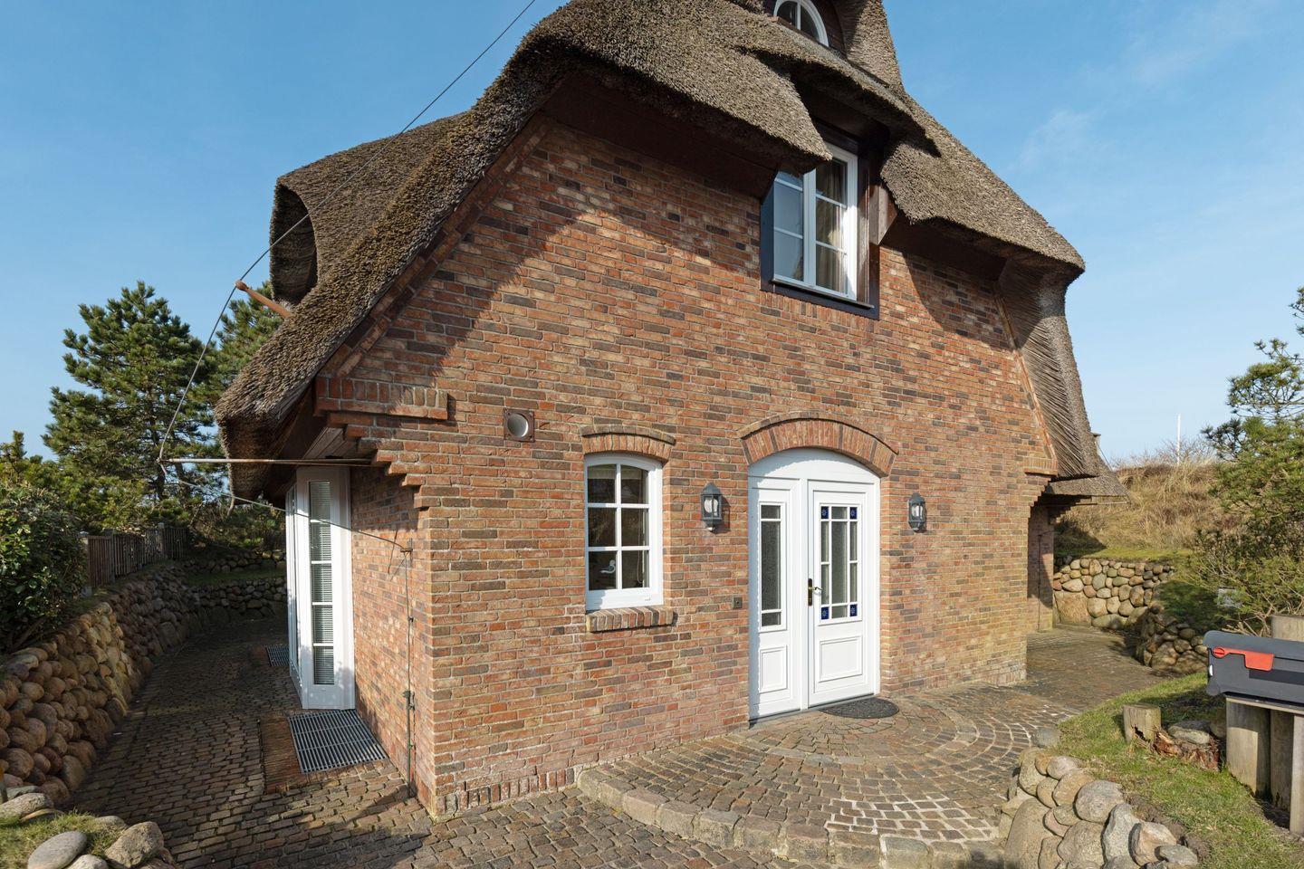Exklusives freistehendes Haus unter Reet für bis zu sechs Personen mit Doppelgarage in sonnenverwöhnter Lage mit Meerblick 180m vom Strand entfernt.