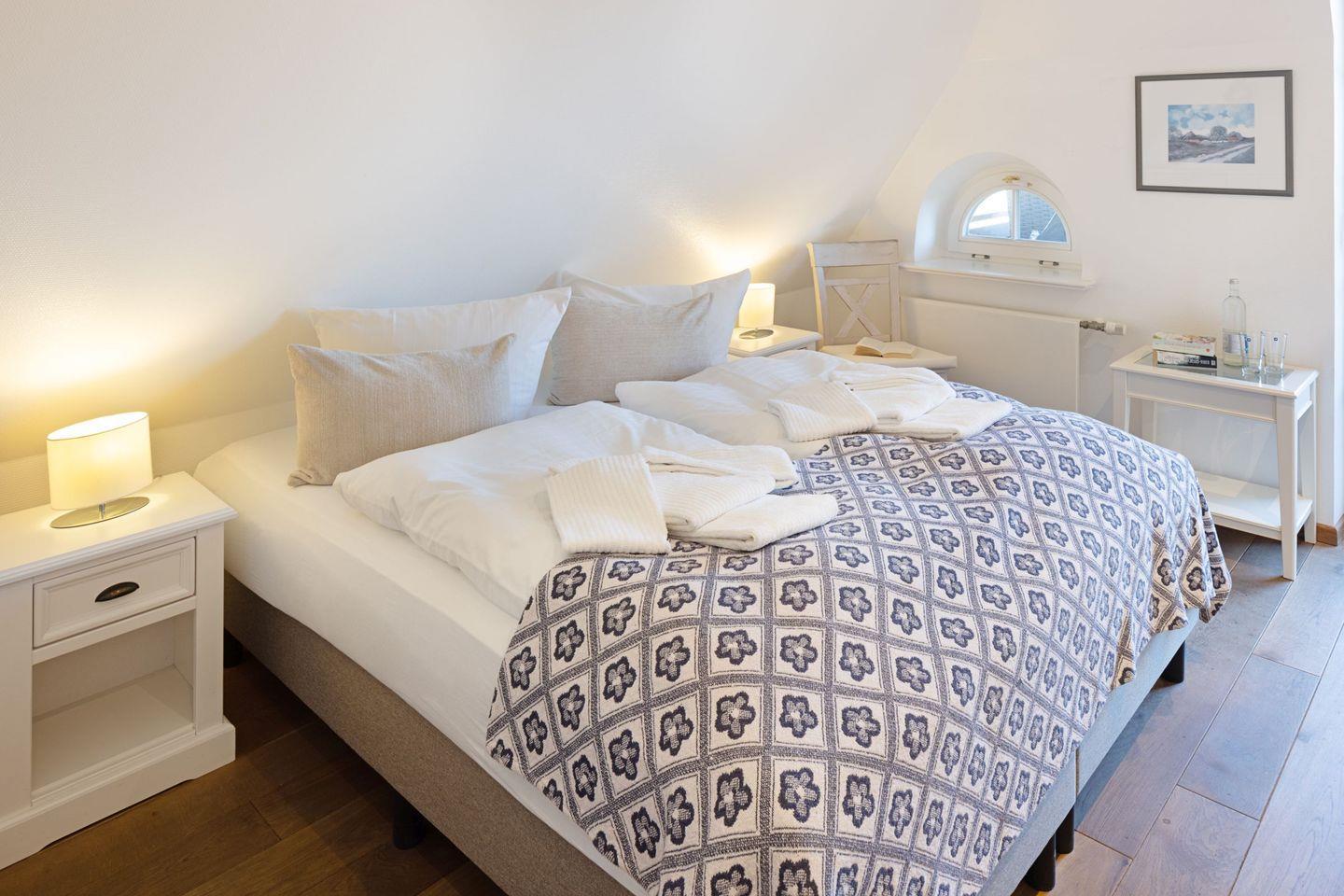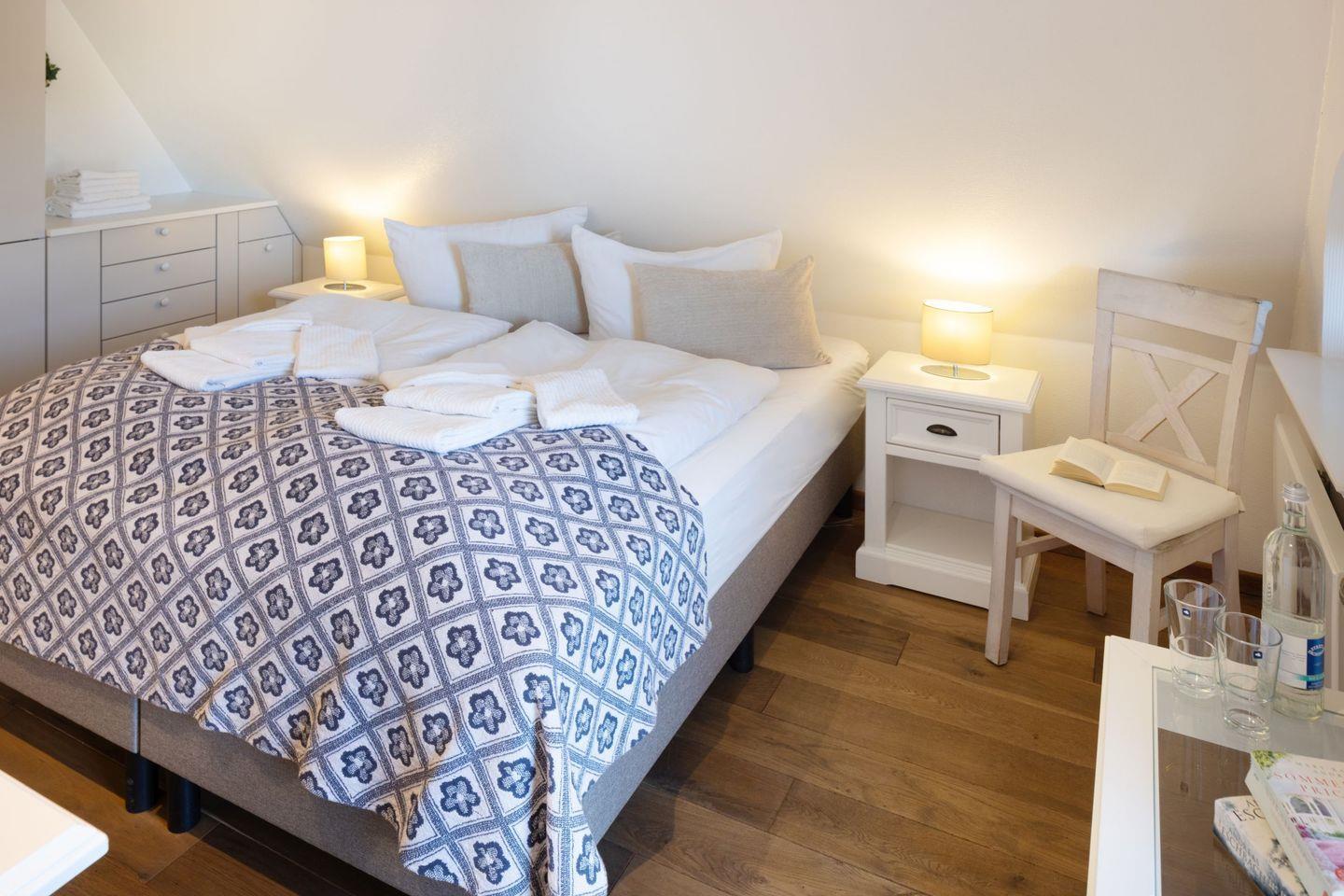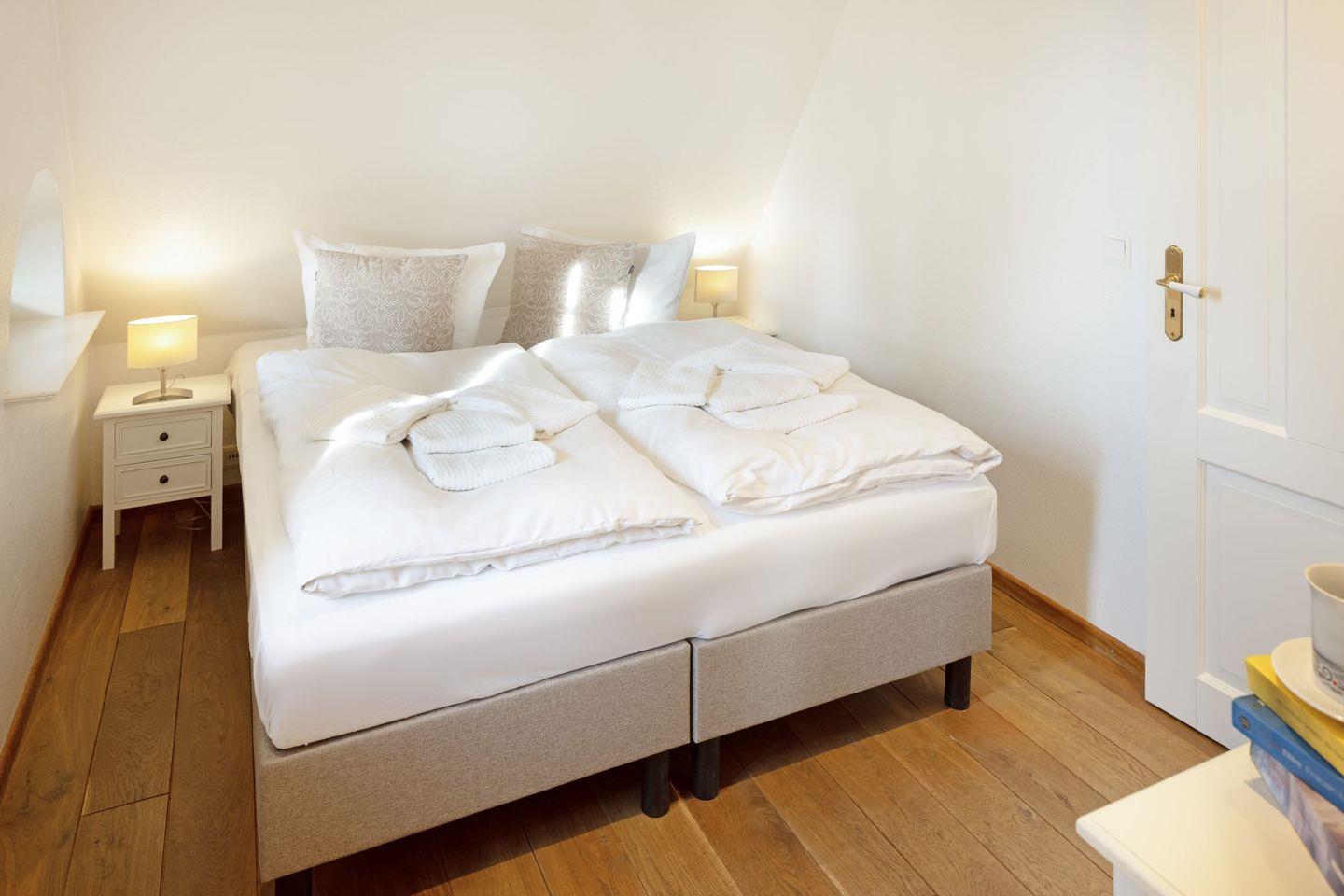 Im Obergeschoss befinden sich Ihre Schlafzimmer. Alle Schlafzimmer sind mit Bad en Suite. Das große Schlafzimmer im ersten Stock hat eine zusätzliche Sonnenterrasse mit Strandkorb.