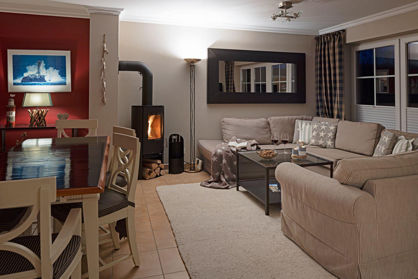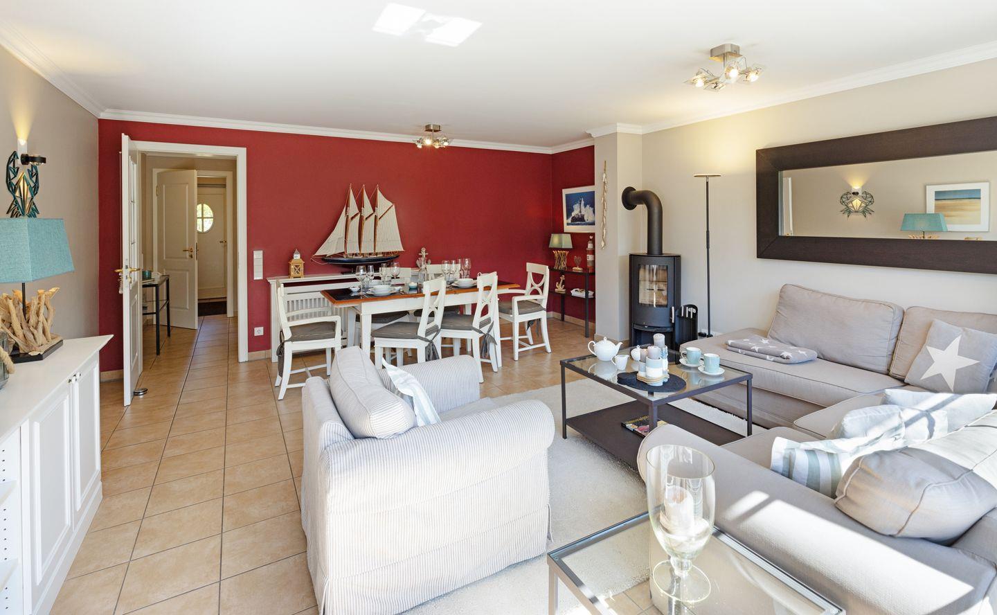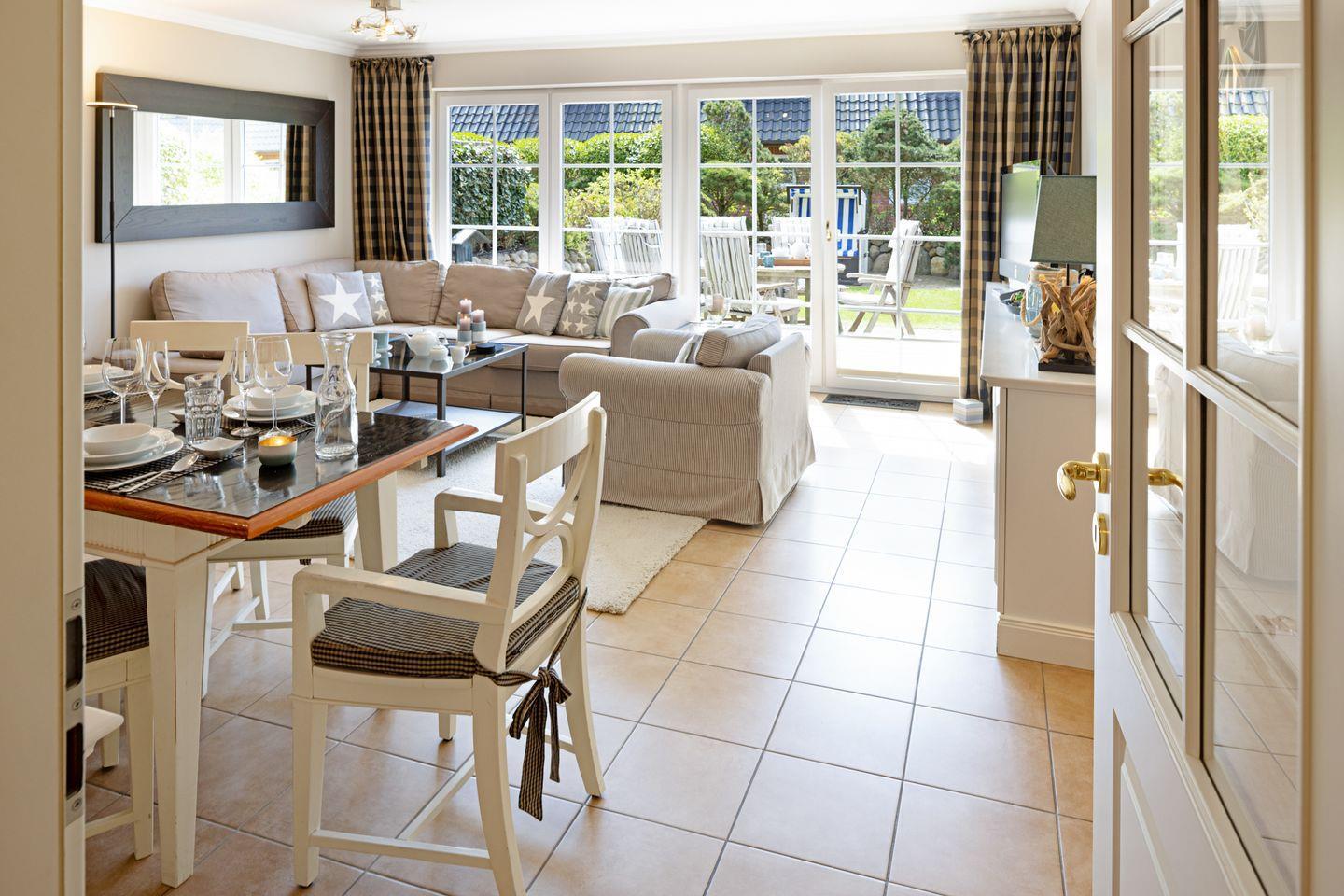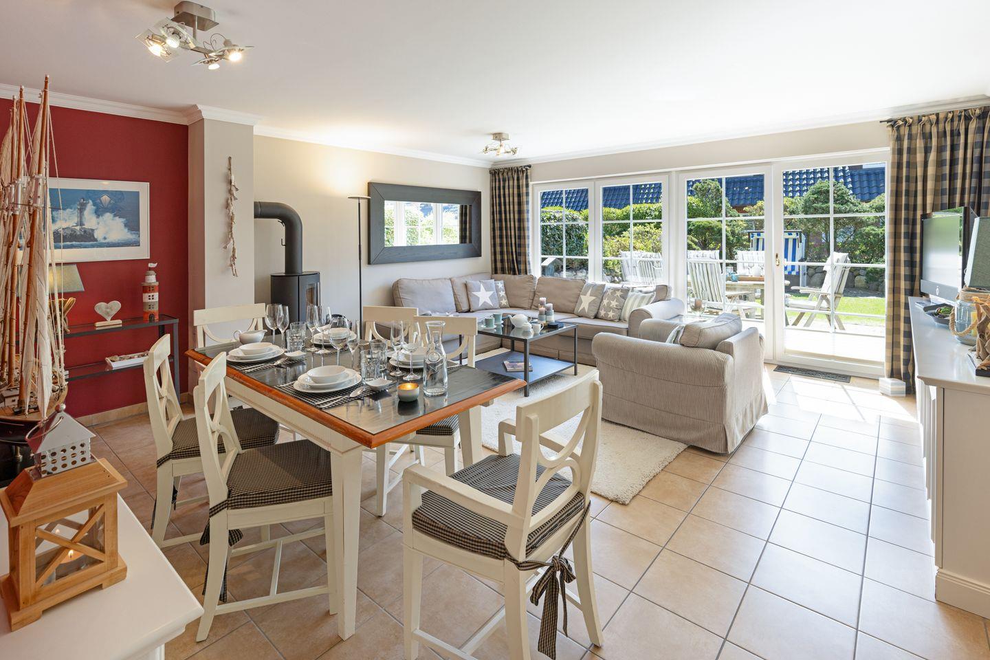 Alle Wohn- und Schlafräume verfügen über einen Fernseher. Die moderne und geschmackvoll aufeinander abgestimmte Einrichtung lädt Sie und Ihre Familie zum Erholen, Genießen und Verweilen ein. Das große Wohnzimmer mit Essbereich hat einen Terrassenzugang über die gesamte Breite Ihres Ferienhauses nach Süden.
