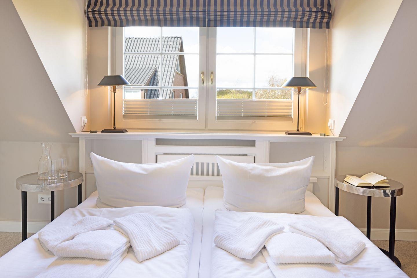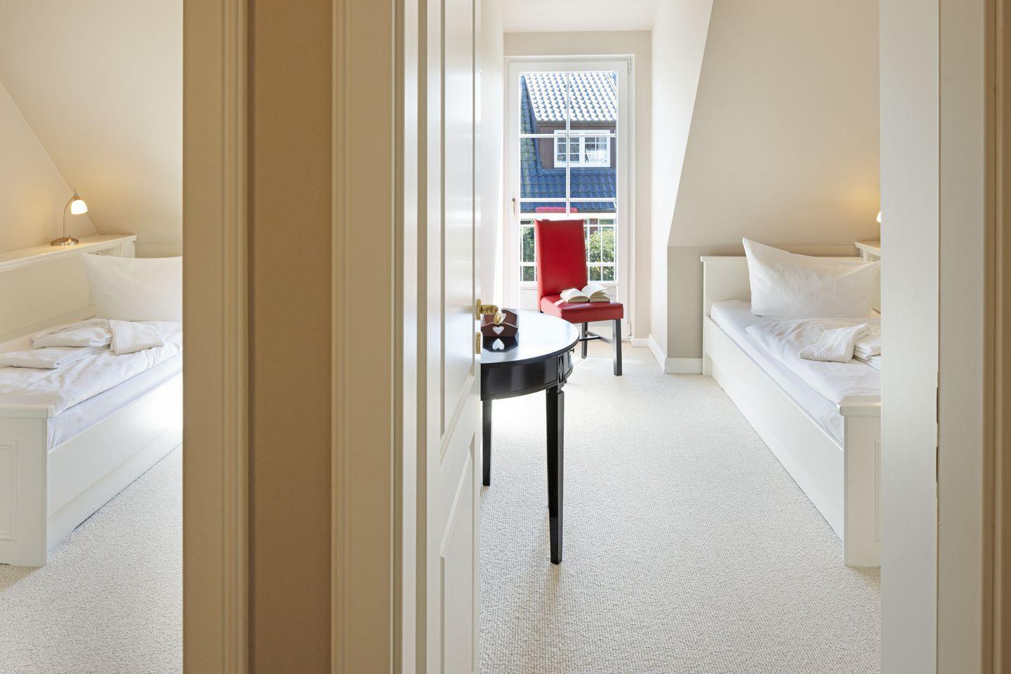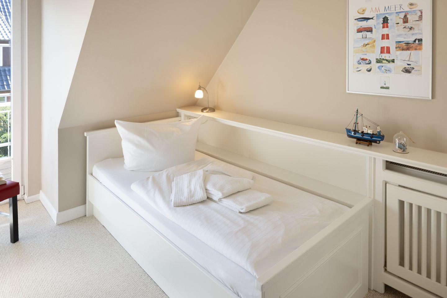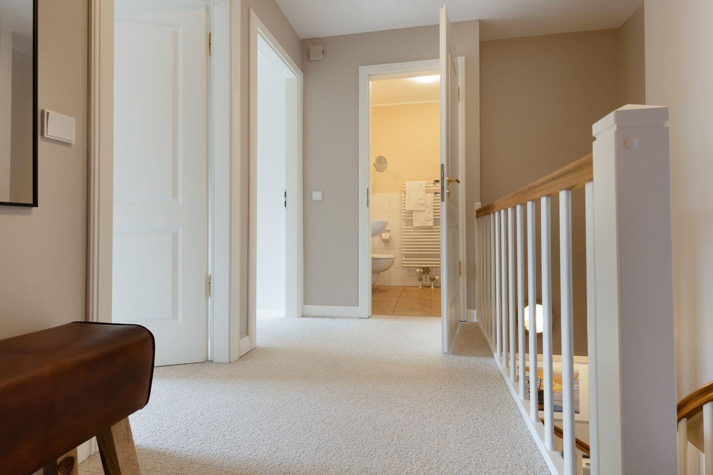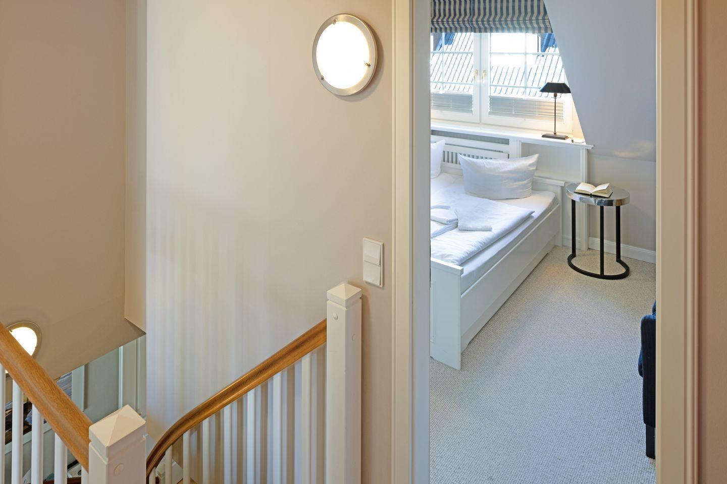 In der ersten Etage befindet sich ein Schlafzimmer mit Doppelbett, zwei Zimmer mit jeweils einem Einzelbett und ein Bad.