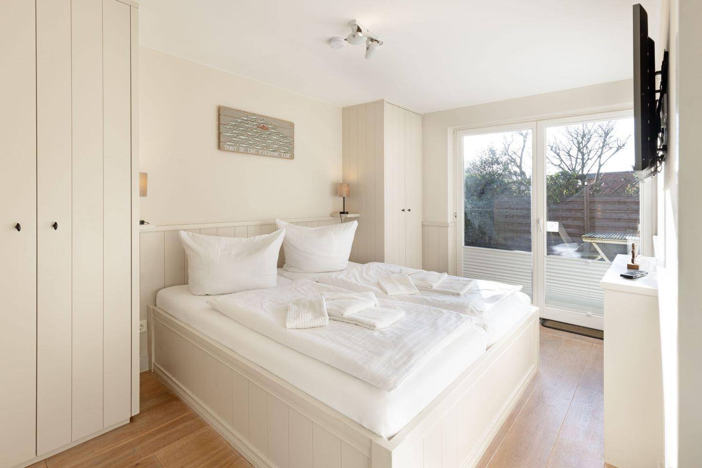 Helles und freundliches Appartement für bis zu vier Personen mit kleiner Terrasse und Strandkorb.