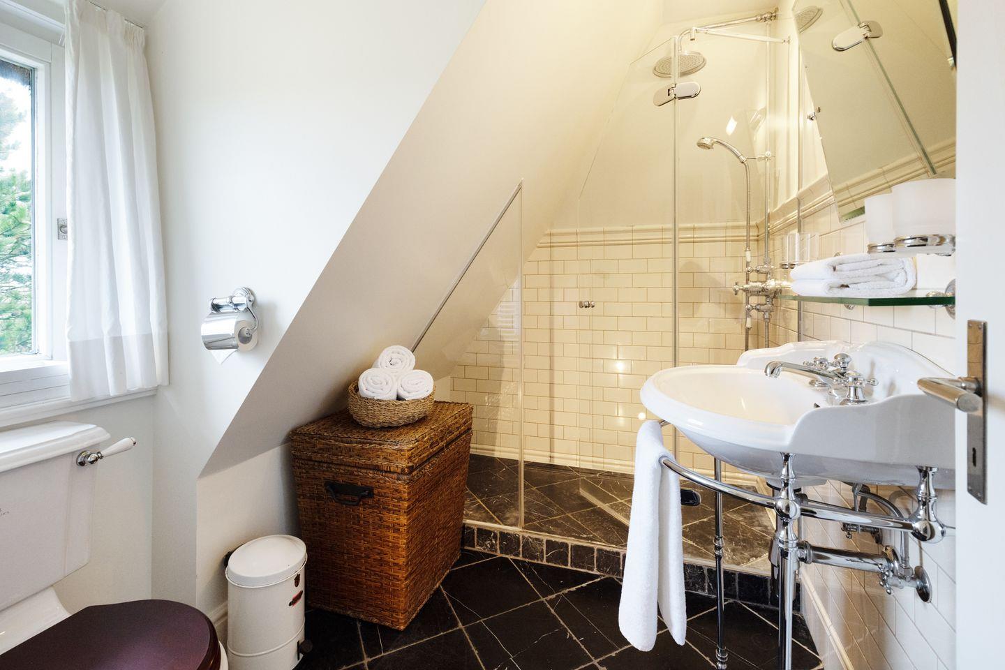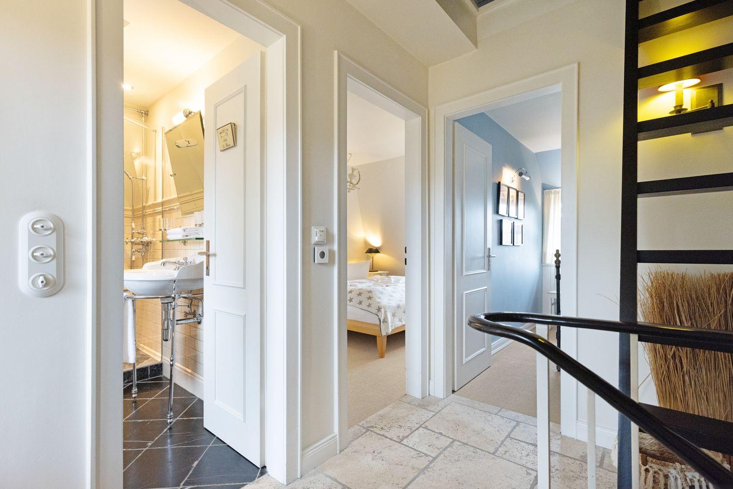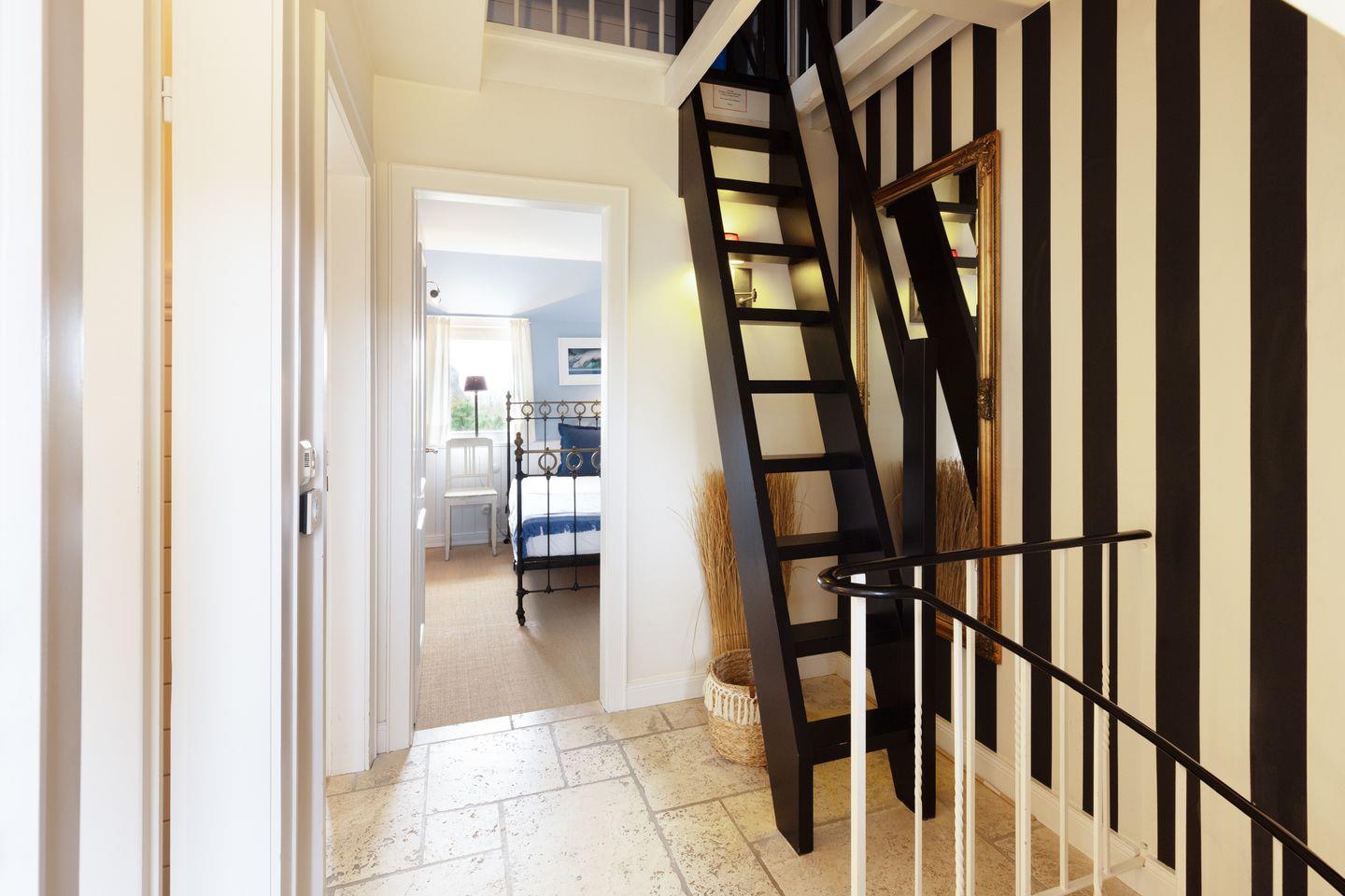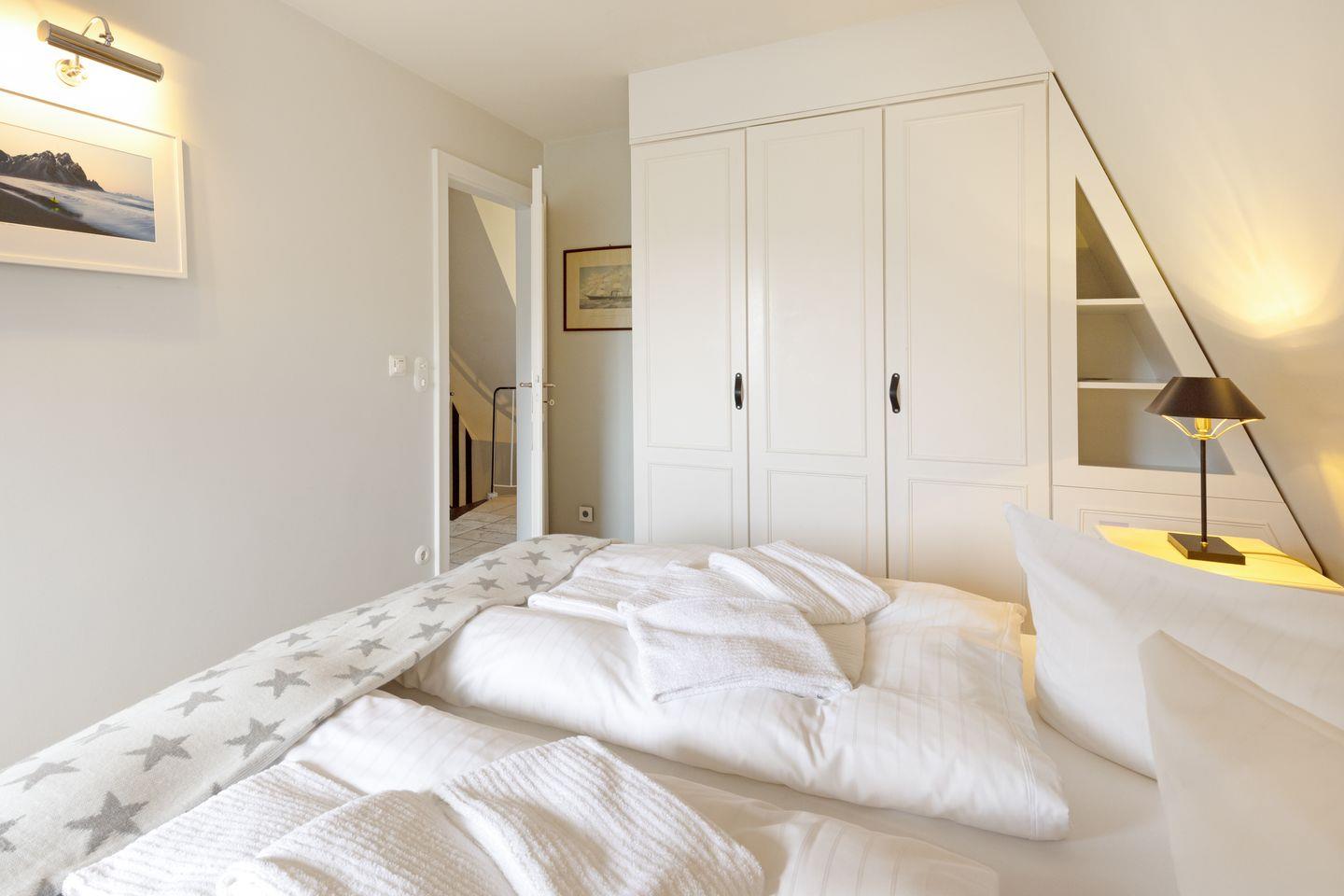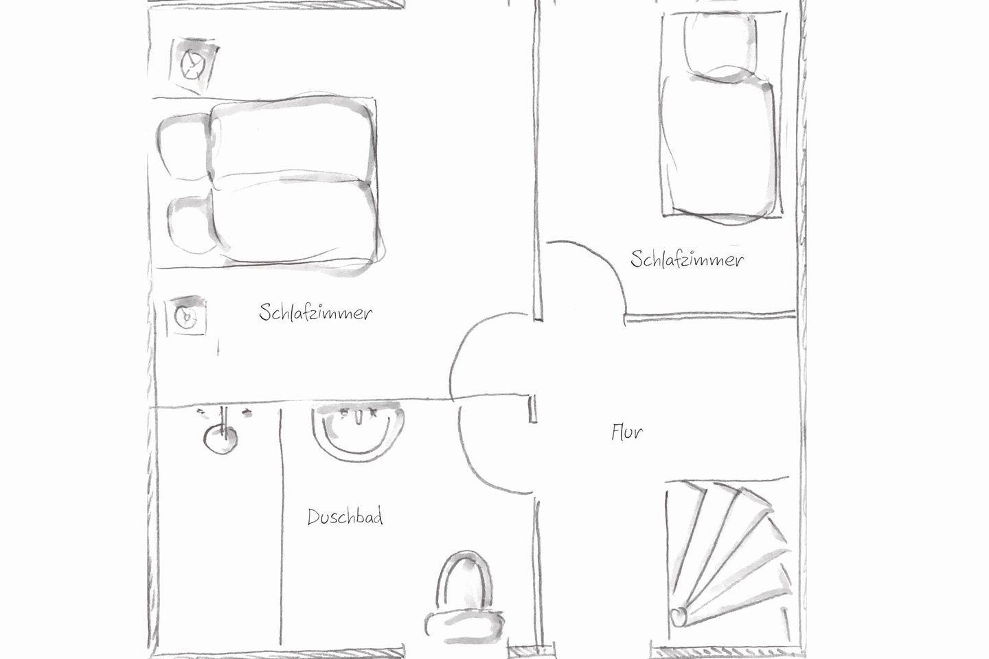 Im ersten Stock (Wendeltreppe) befinden sich zwei Schlafzimmer mit Doppelbetten und ein Bad mit Dusche. (Ein Schlafraum im Dachgeschoss, welcher über eine Leiter erreichbar ist, dient ausschließlich privaten Zwecken und steht nicht zur Vermietung zur Verfügung.)