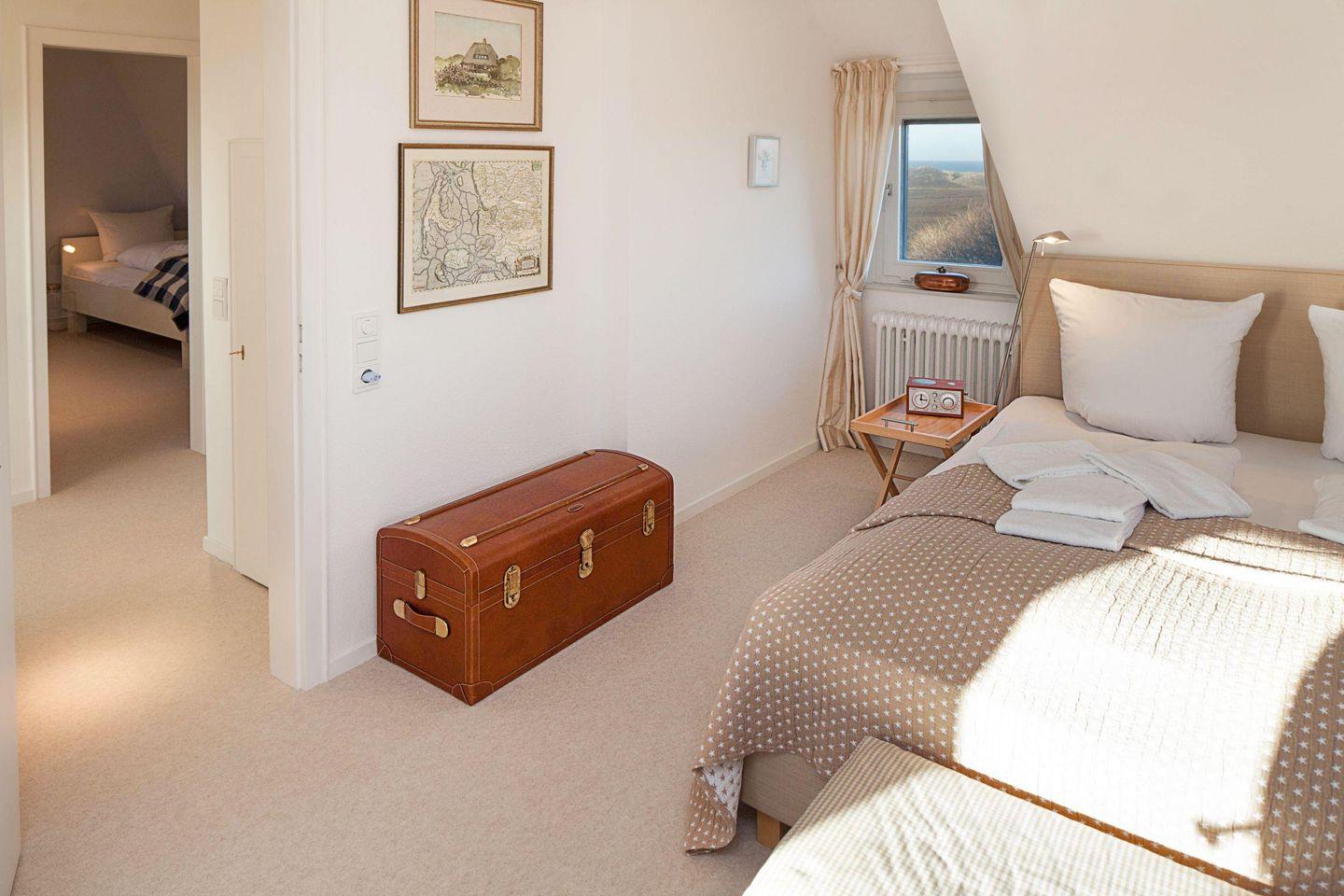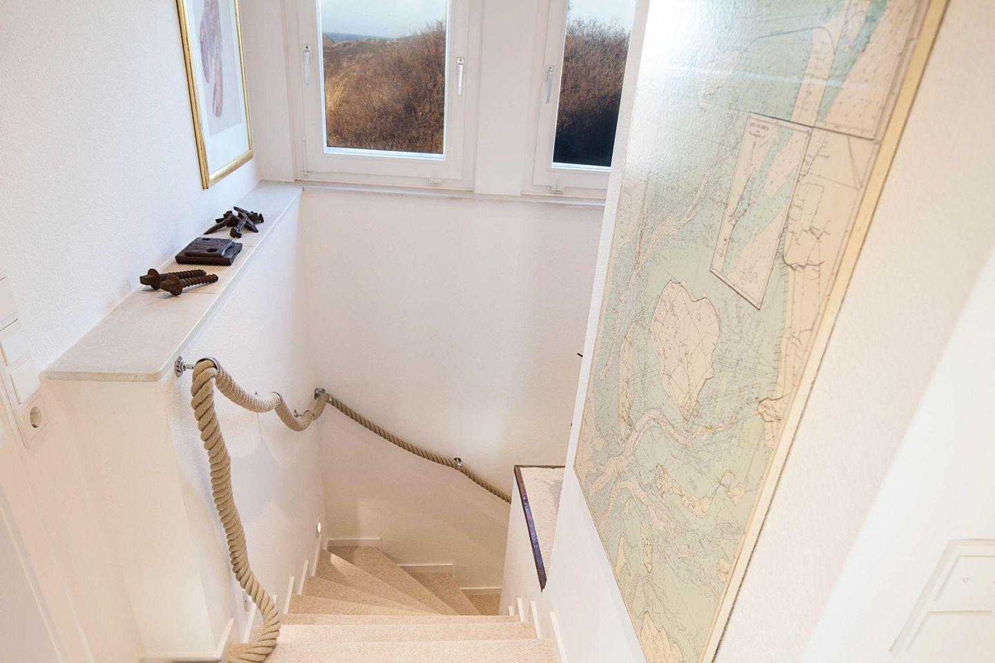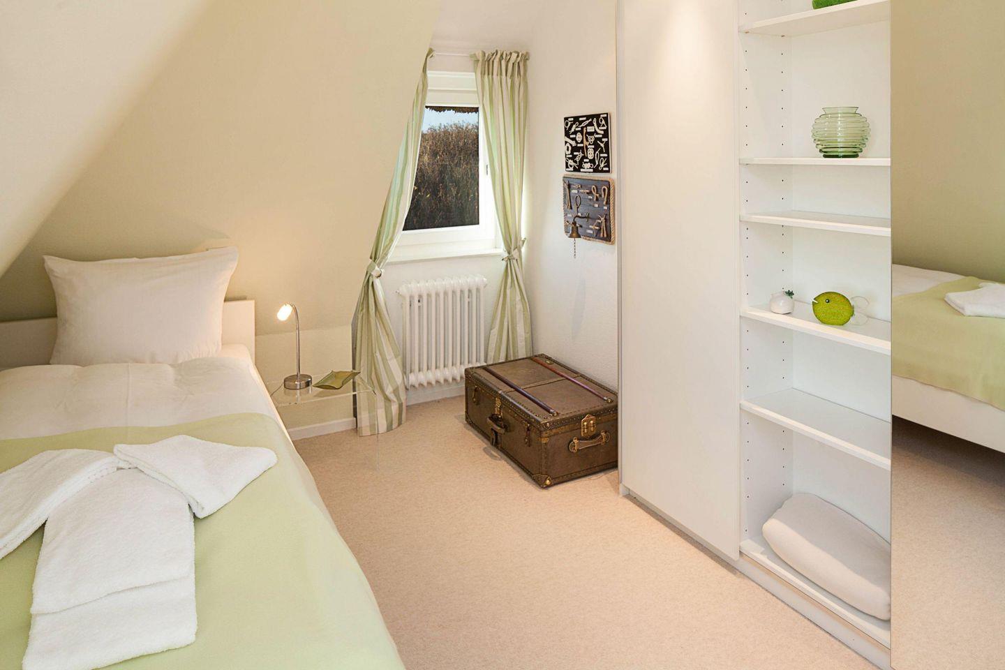 Weiße Teppiche und helle Böden, sowie die hochwertige Ausstattung warten auf Sie. In der ersten Etage befinden sich ein Schlafzimmer mit Doppelbett, zwei Schlafräume mit jeweils einem Einzelbett sowie ein Badezimmer mit Badewanne. Ein zusätzliches Gäste-WC steht im EG zur Verfügung.