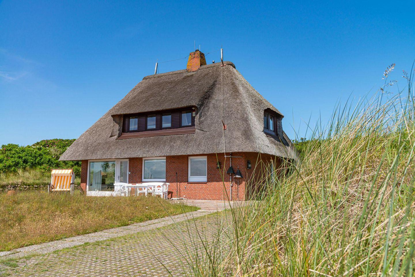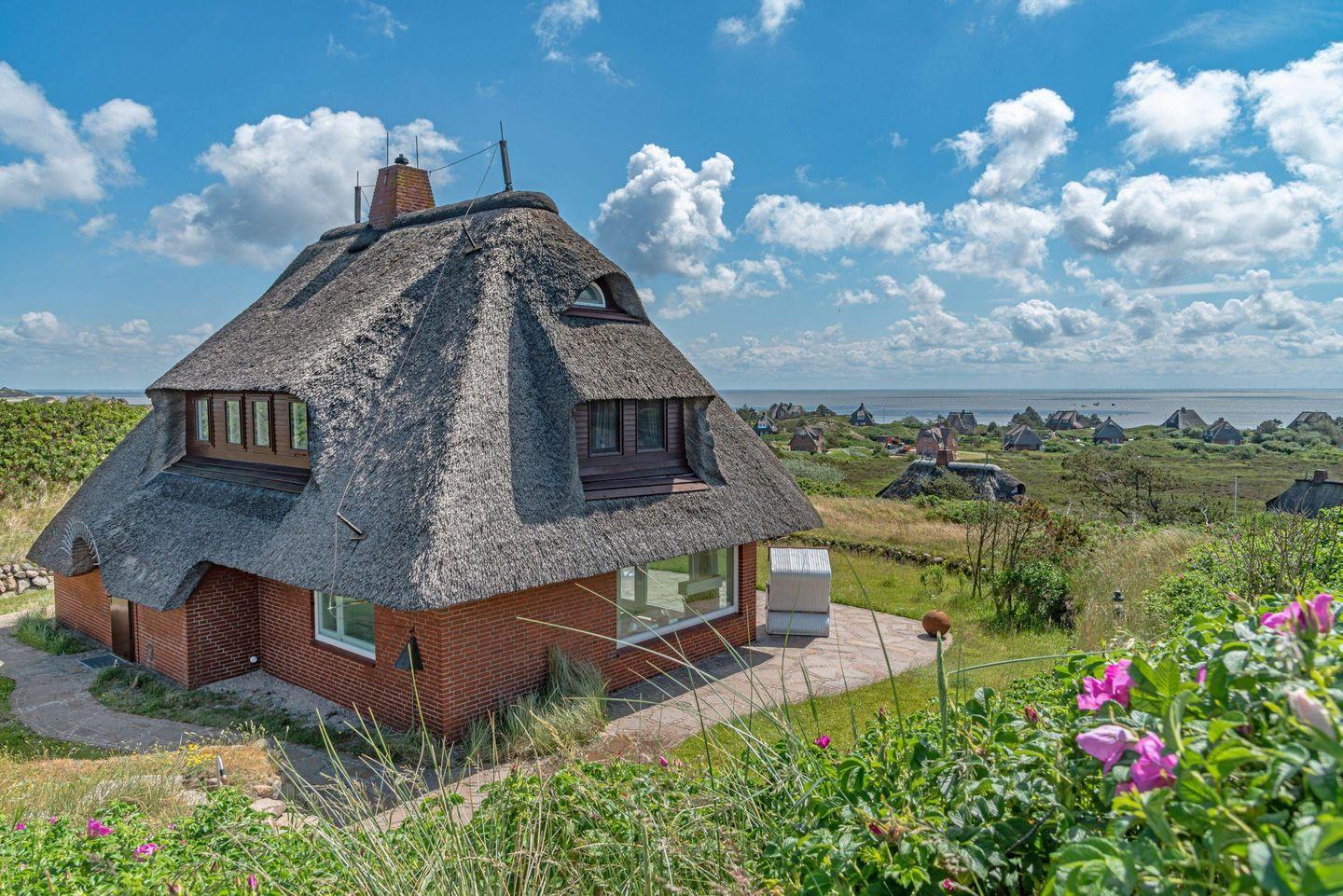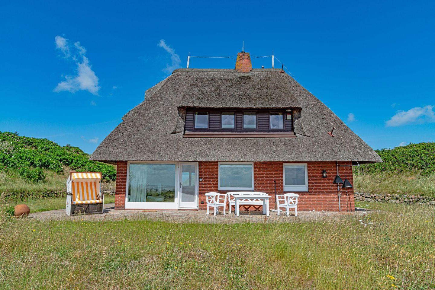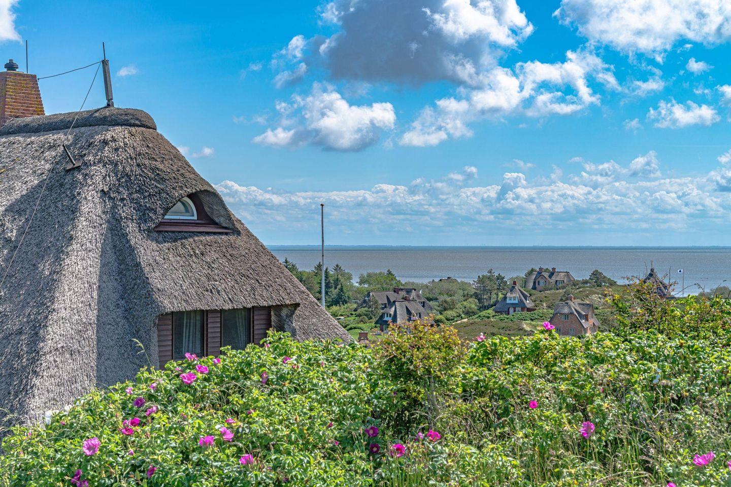 Ferienhaus unter Reet für bis zu vier Personen mit fantastischem Blick auf Wattenmeer sowie Nordsee und Rundumblick weit über die Lister Dünen- und Heidelandschaft.