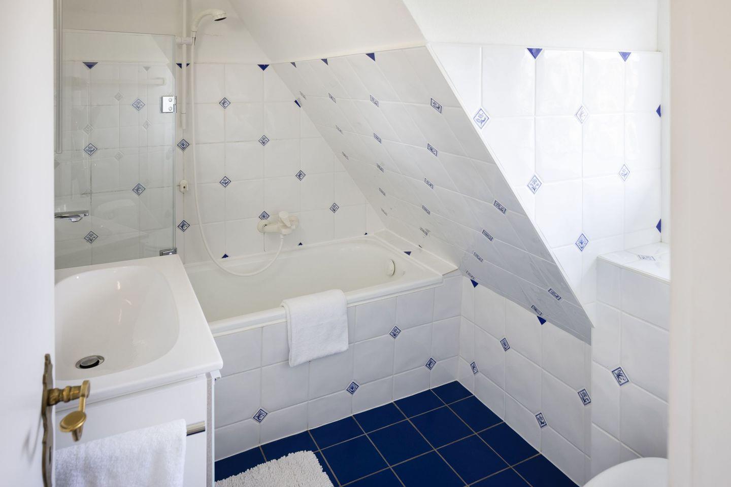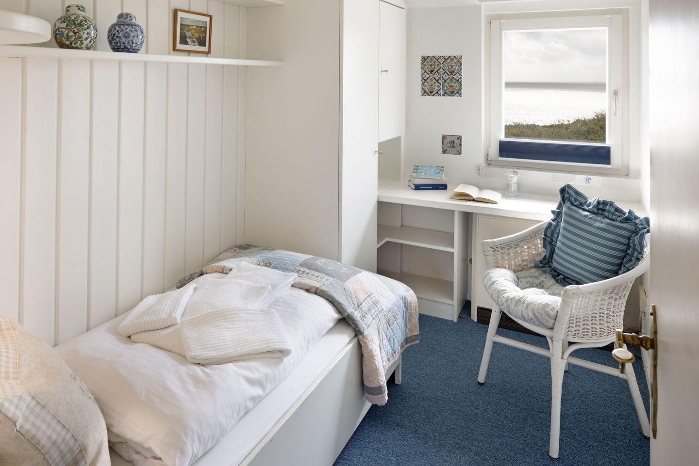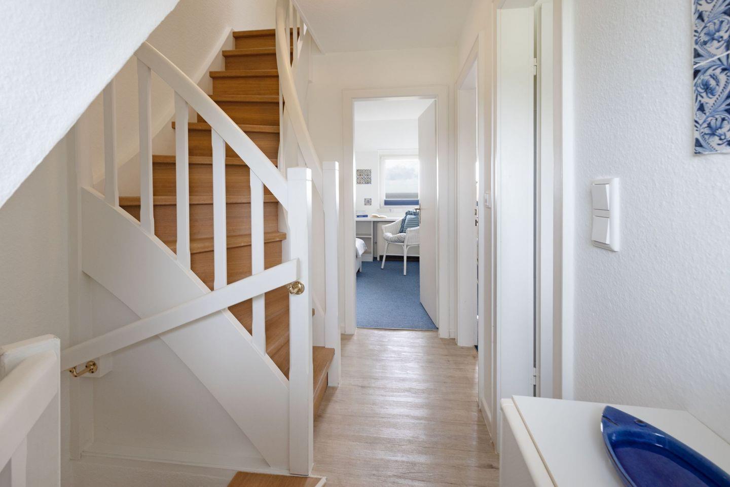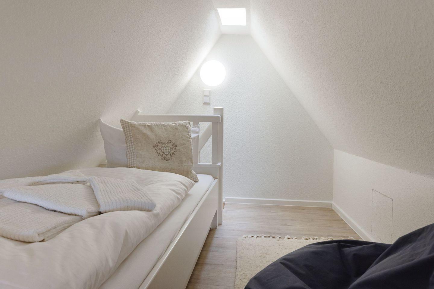Das Haus verfügt im 1. OG (Wendeltreppe) über ein Schlafzimmer mit Doppelbett und ein Schlafzimmer mit Einzelbett. Im DG (stark ansteigende Treppe) befindet sich ein weiteres Schlafzimmer mit einem Einzelbett. Das geräumige Badezimmer verfügt über eine Duschbadewanne.
