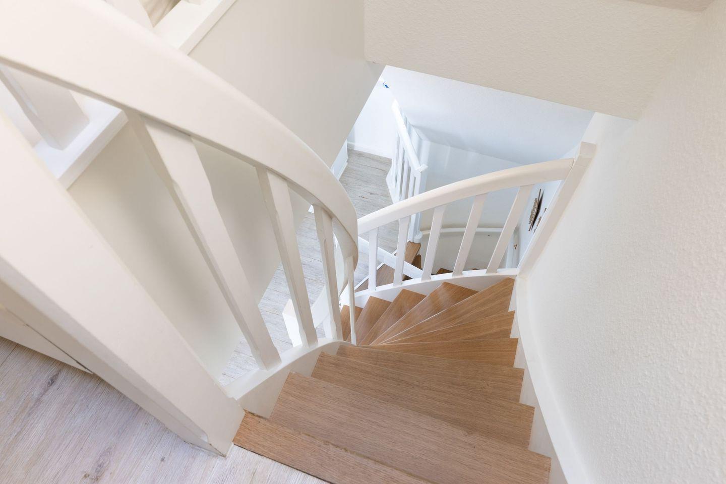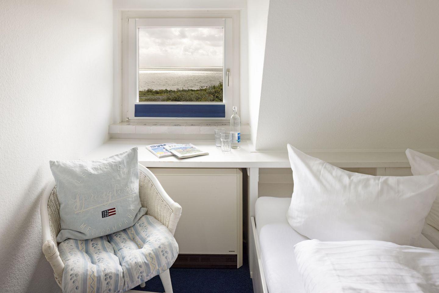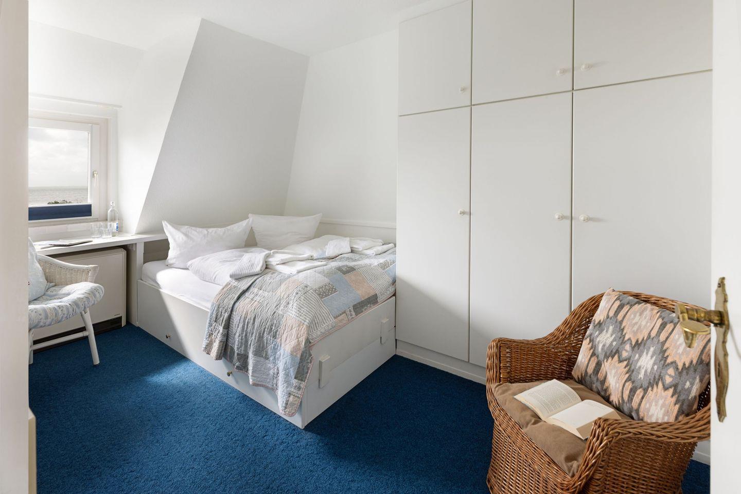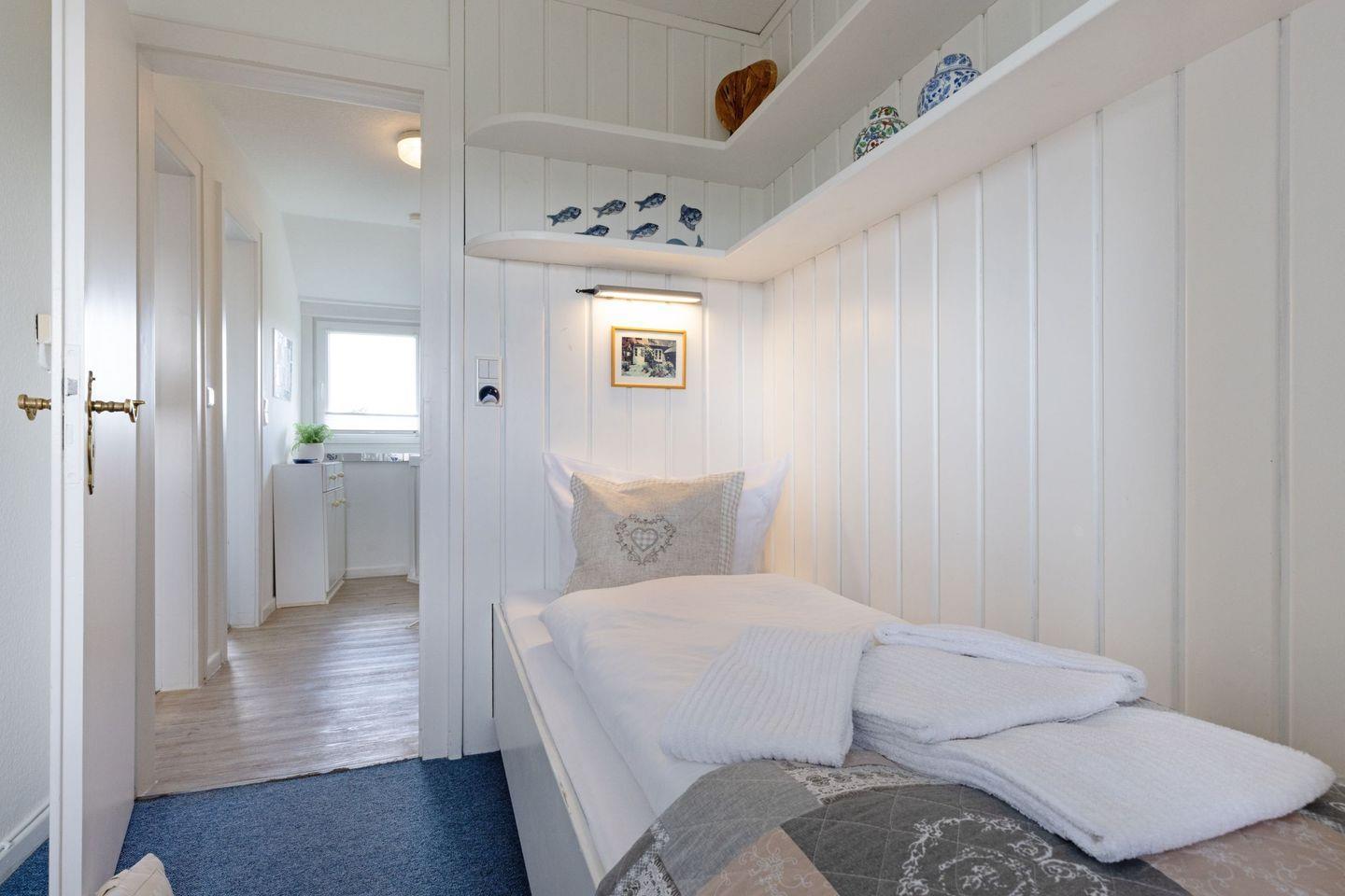 Das Haus verfügt im 1. OG (Wendeltreppe) über ein Schlafzimmer mit Doppelbett und ein Schlafzimmer mit Einzelbett. Im DG (stark ansteigende Treppe) befindet sich ein weiteres Schlafzimmer mit einem Einzelbett. Das geräumige Badezimmer verfügt über eine Duschbadewanne.