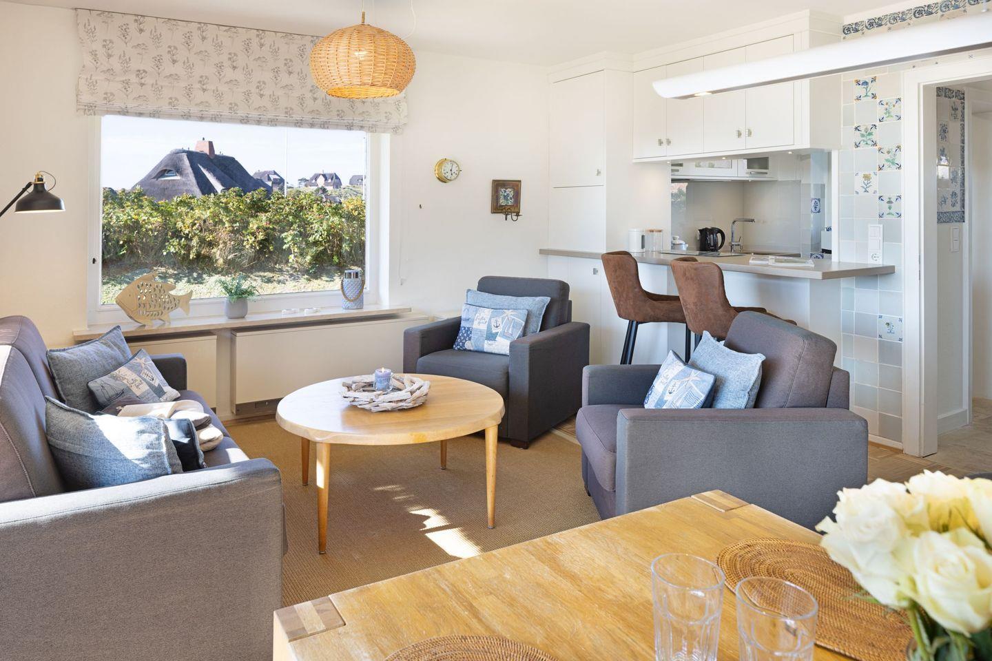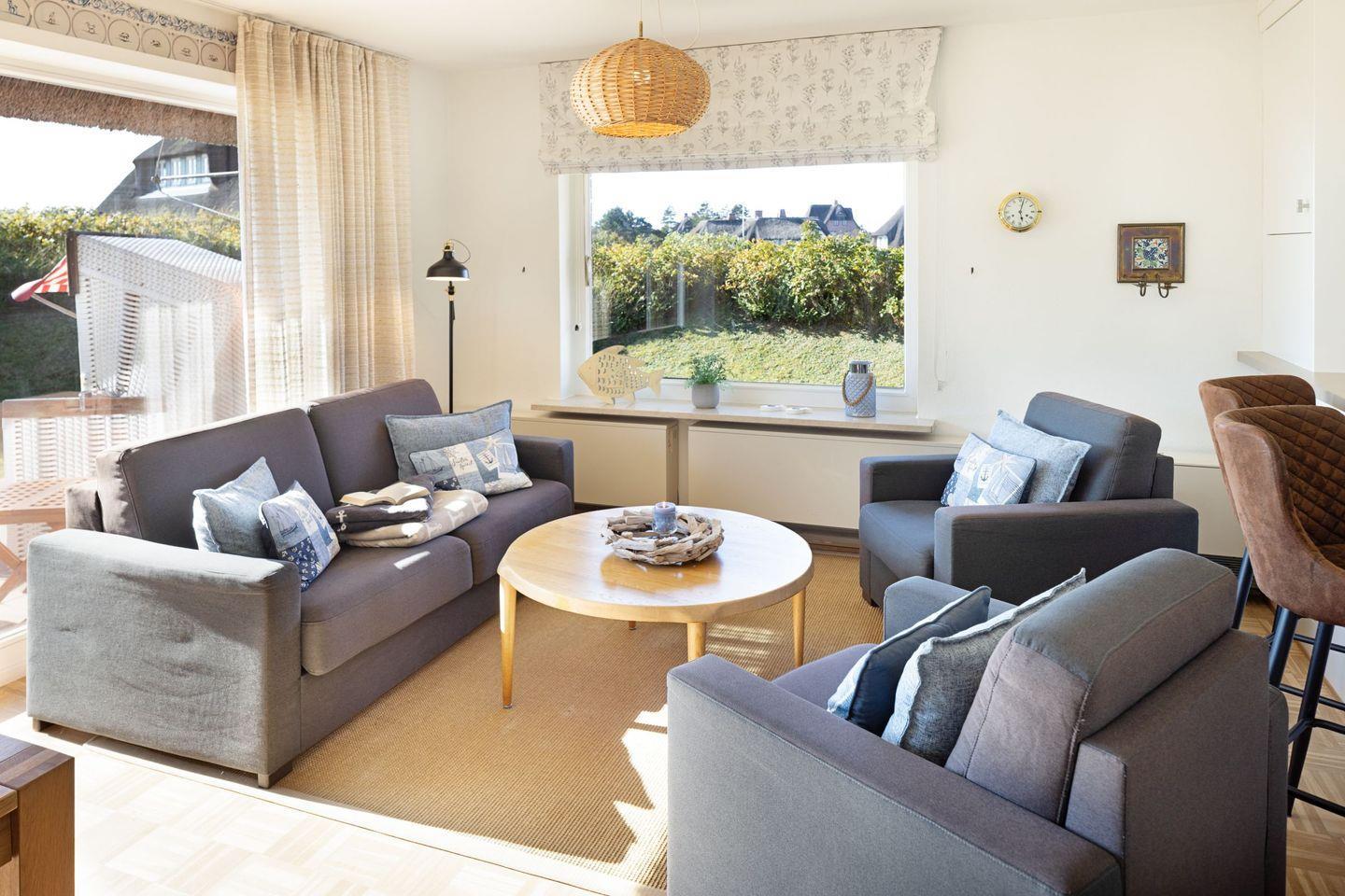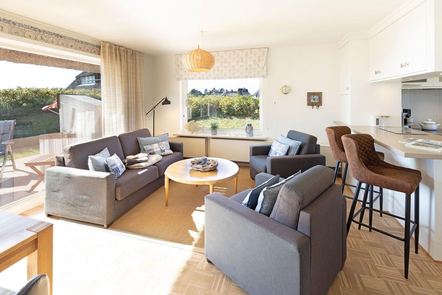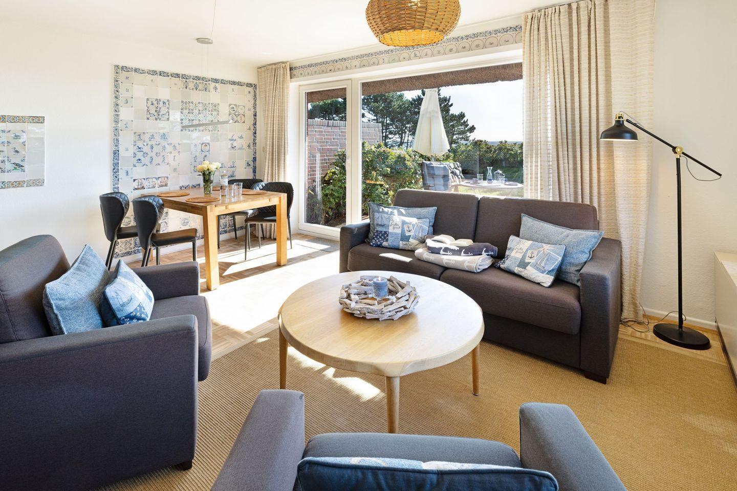 Über die Terrassentür im Wohnbereich kommen Sie in den Garten mit Meerblick.