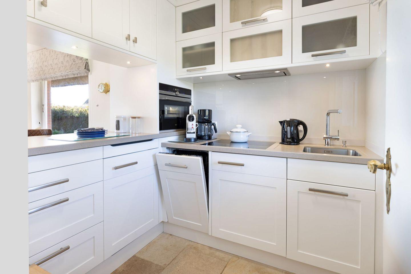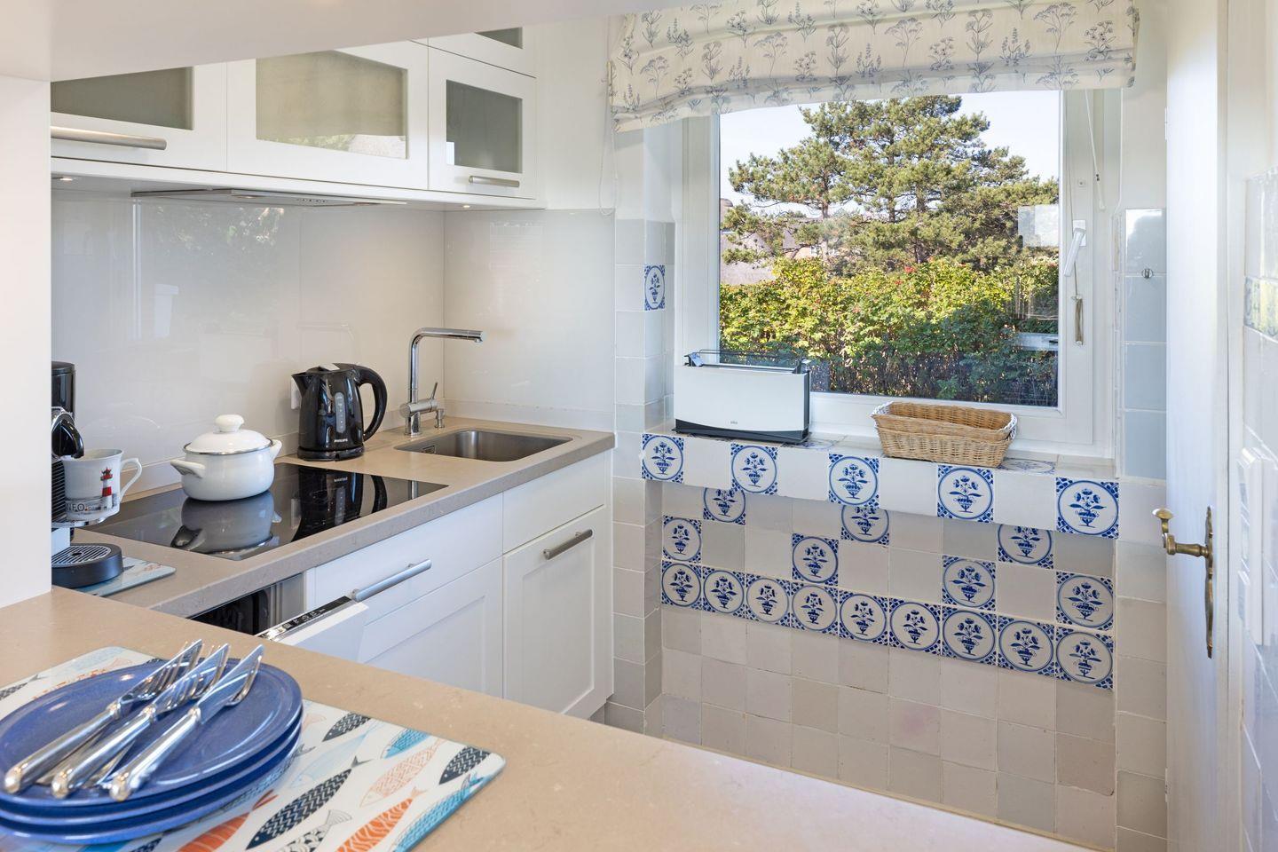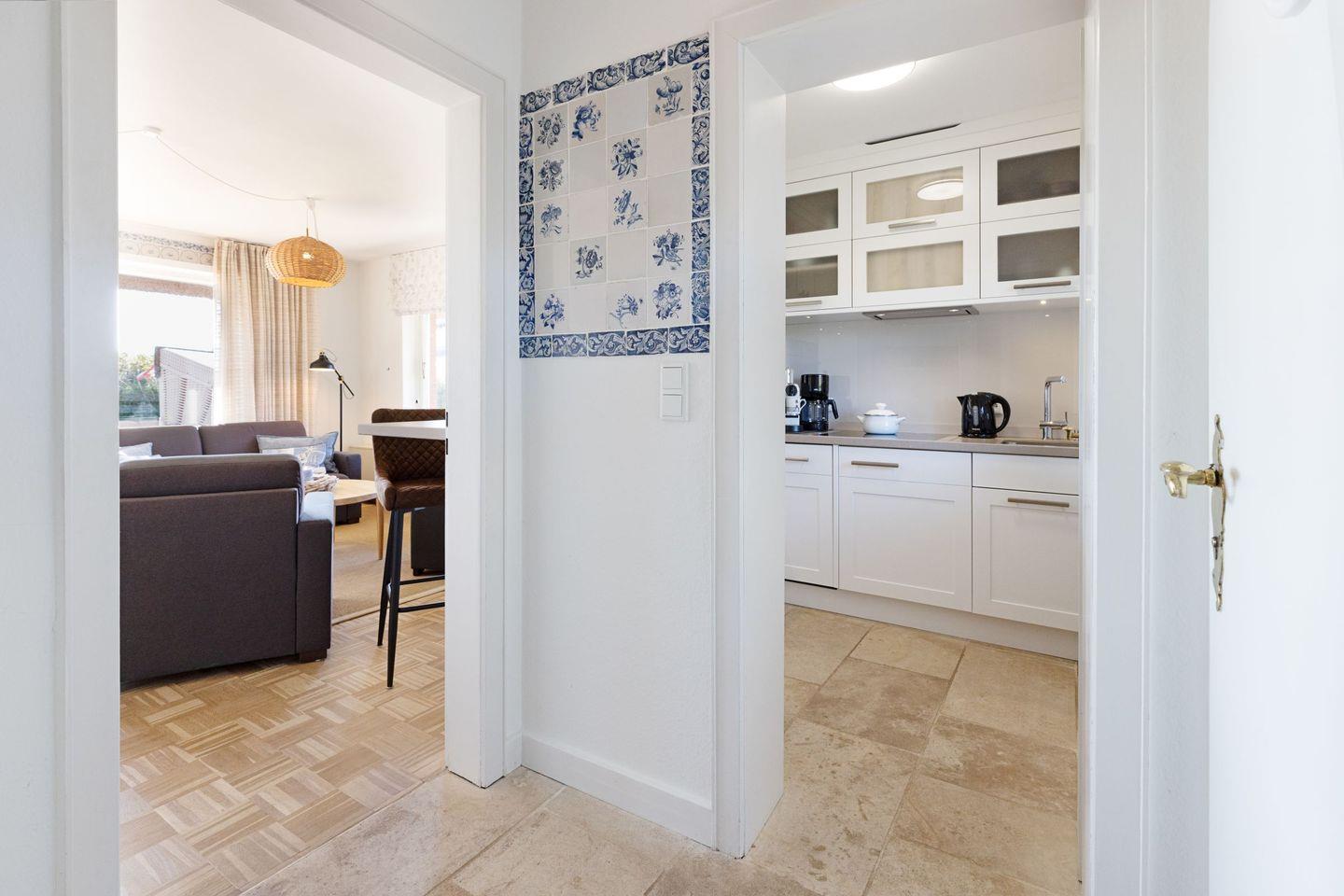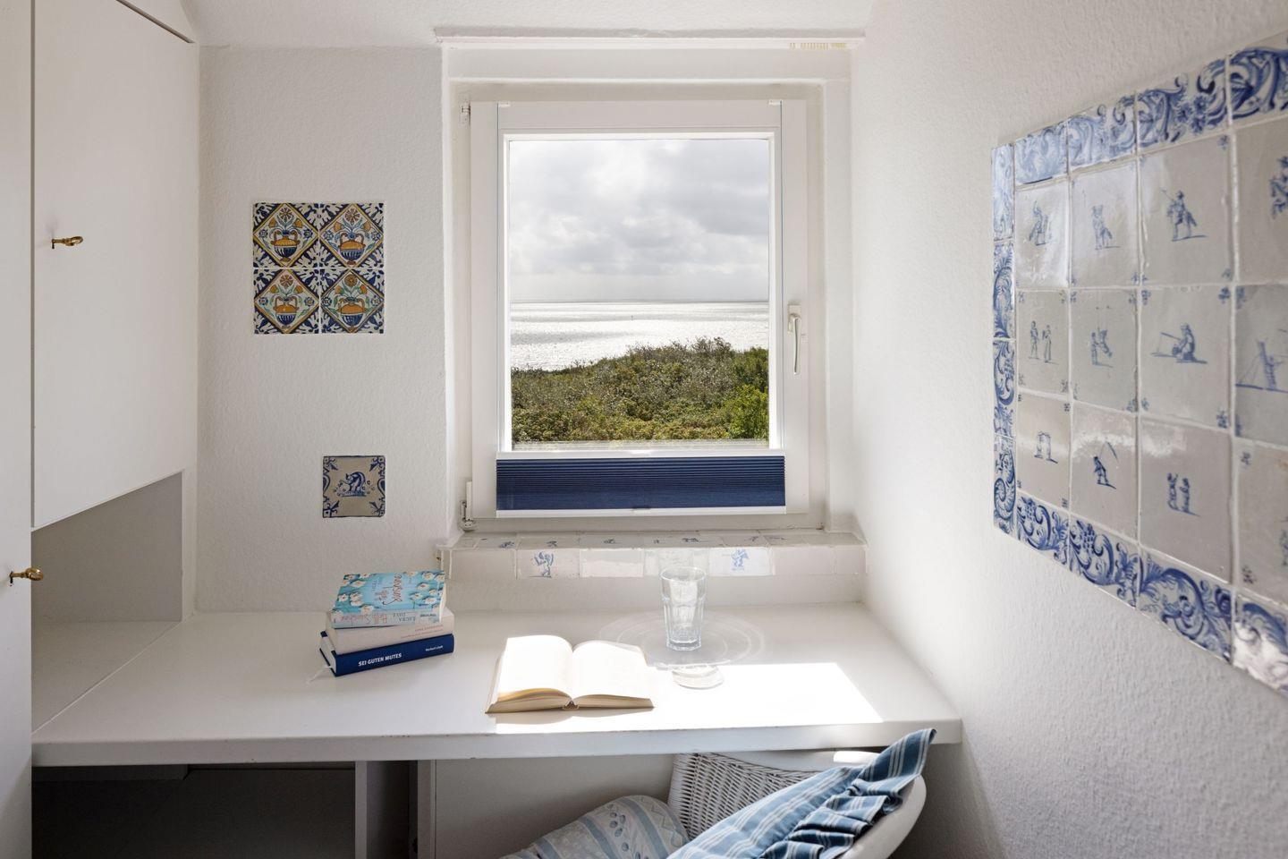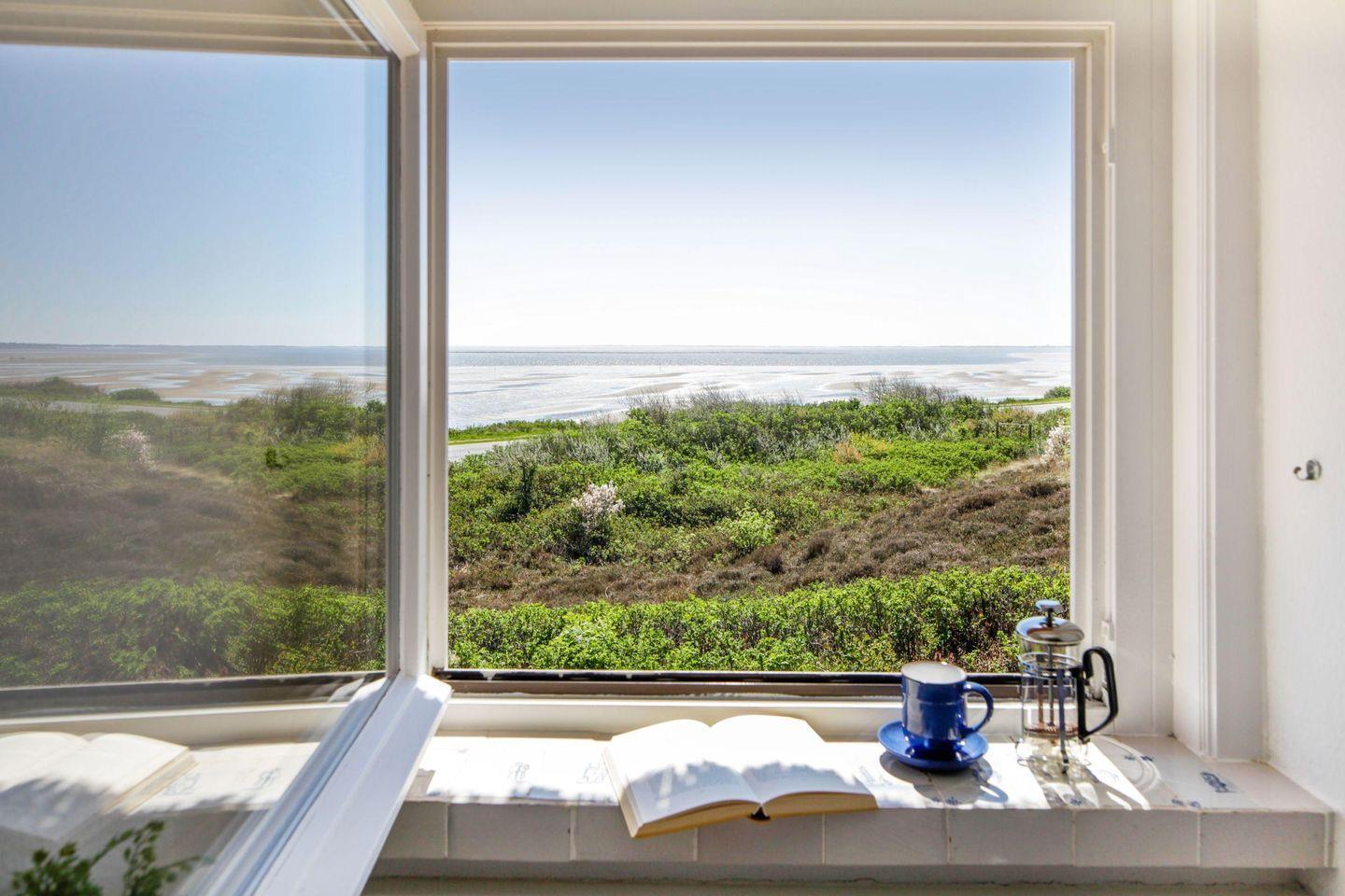 Über die Terrassentür im Wohnbereich kommen Sie in den Garten mit Meerblick.