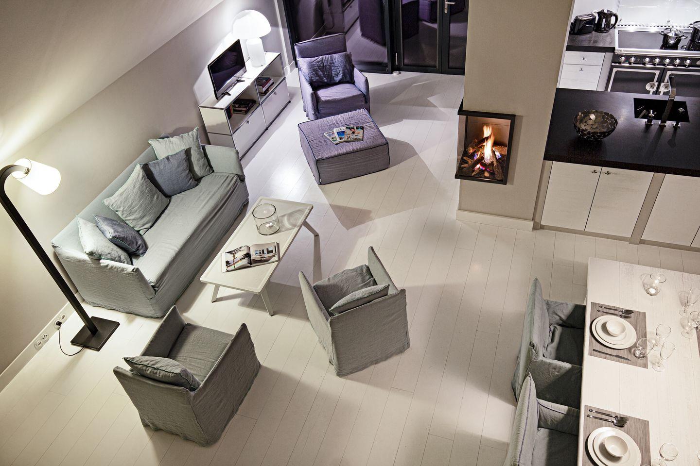 Die moderne lichtdurchflutete Architektur verbindet auf angenehme Art und Weise den Wohnbereich mit der offenen Küche und dem separaten Schlafzimmer mit Doppelbett.