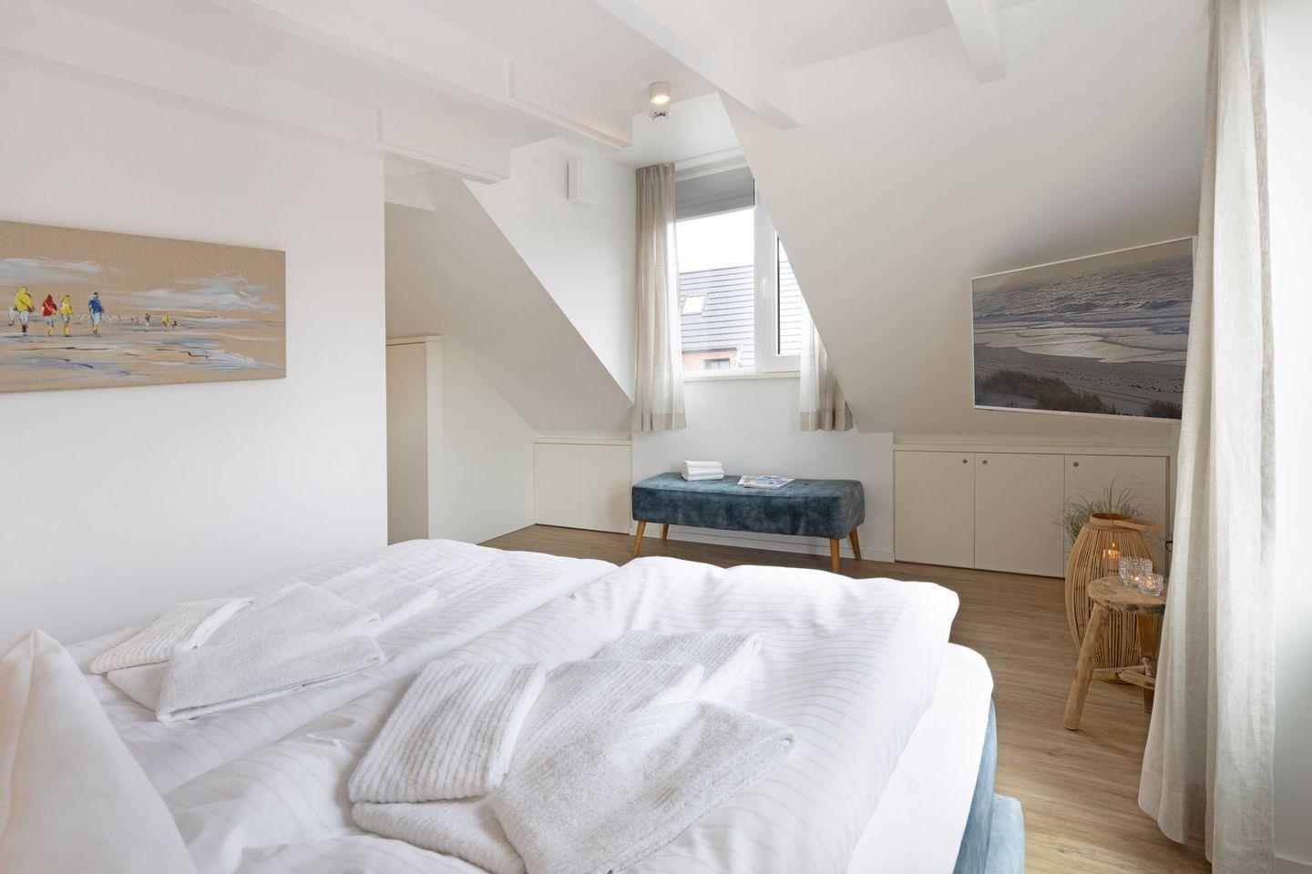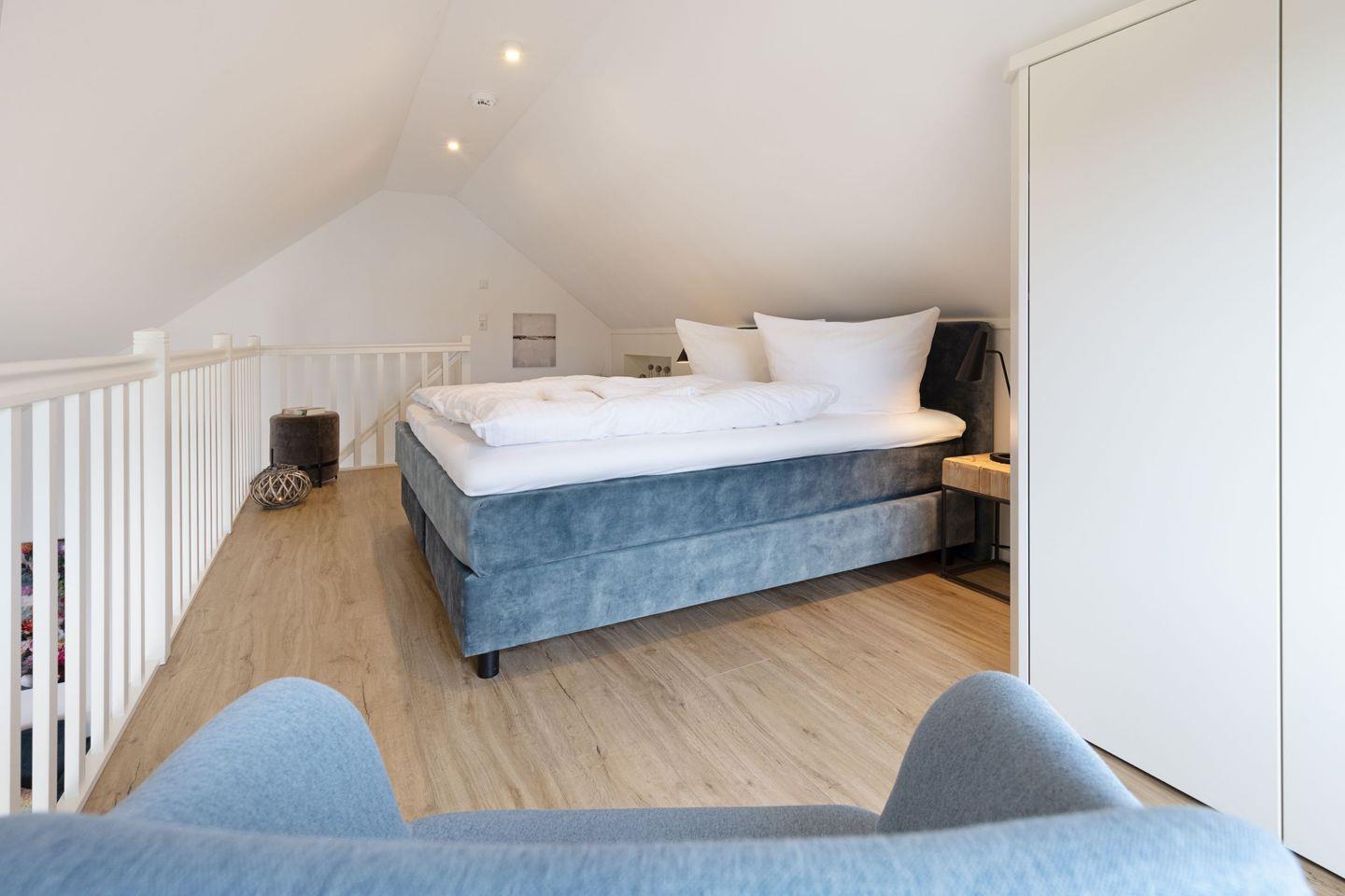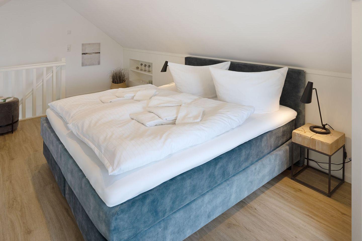 Das Schlafzimmer ist großzügig gestaltet, ausgestattet mit einem Boxspringbett und bietet viel Stauraum sowie ein zweites Smart TV für gemütliche Fernsehabende im Bett. Ein weiteres Schlafzimmer befindet sich in der Galerie des Appartements.