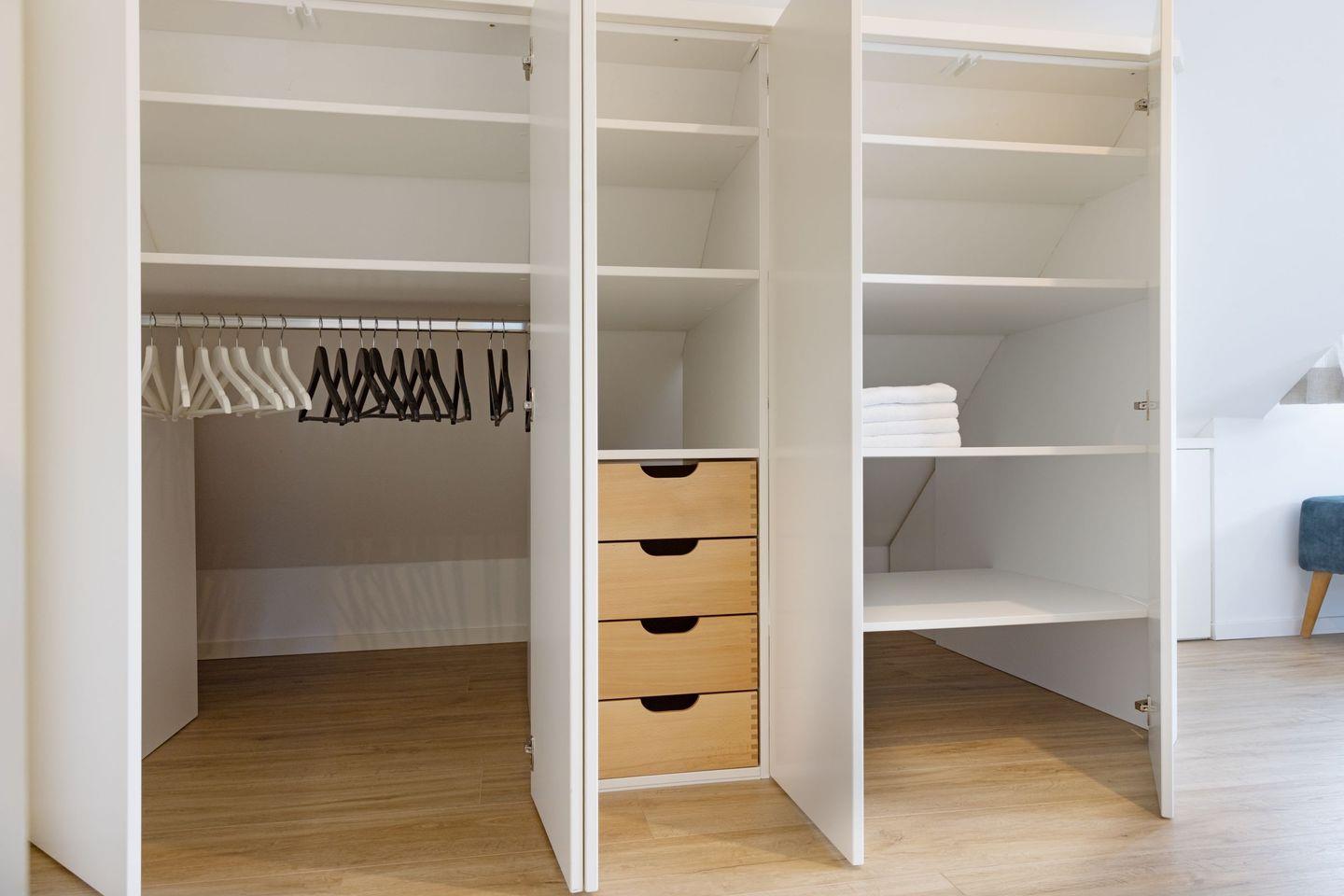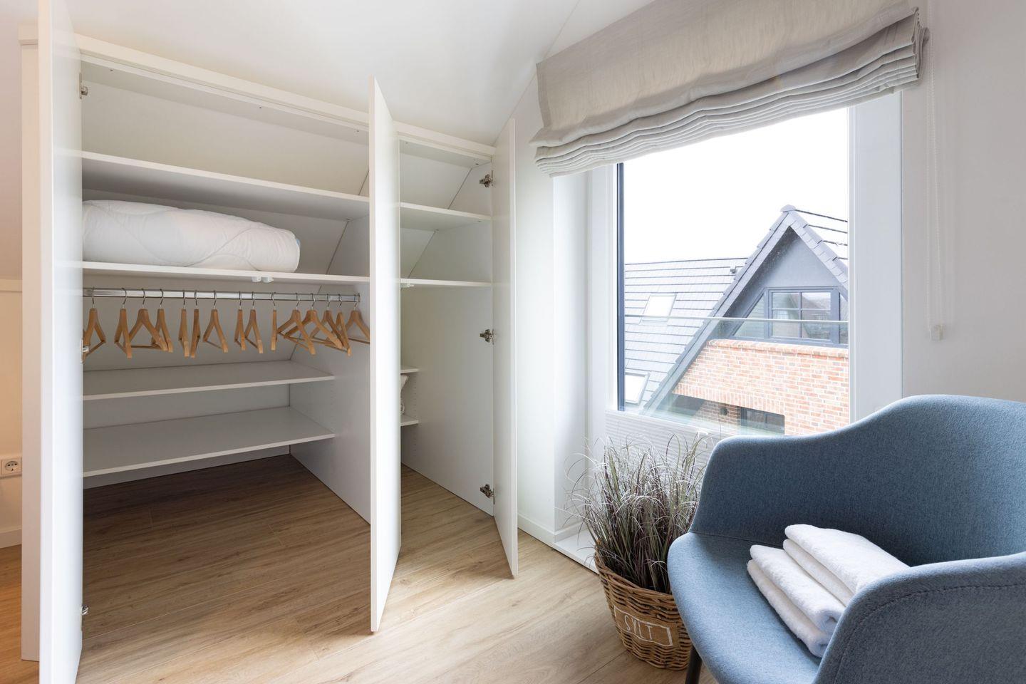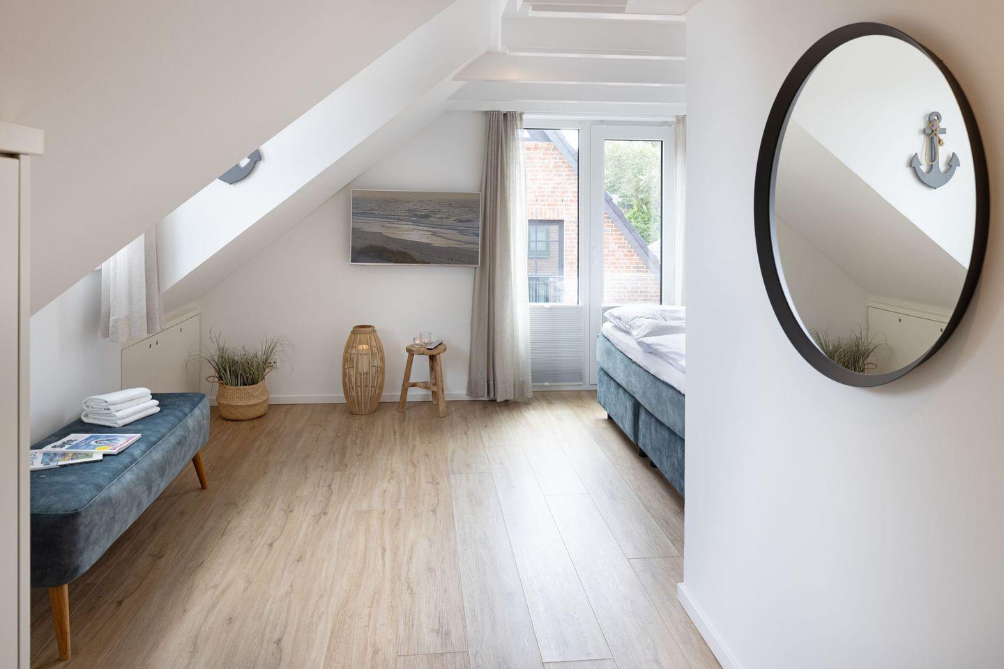 Das Schlafzimmer ist großzügig gestaltet, ausgestattet mit einem Boxspringbett und bietet viel Stauraum sowie ein zweites Smart TV für gemütliche Fernsehabende im Bett. Ein weiteres Schlafzimmer befindet sich in der Galerie des Appartements.