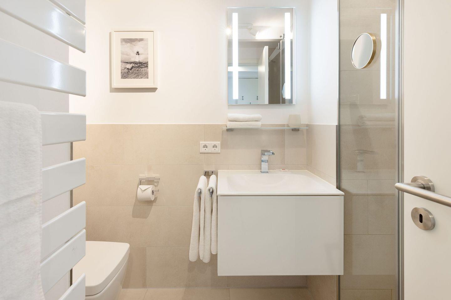 Das Badezimmer mit Regendusche ist modern und freundlich eingerichtet für einen guten Start in den Tag.