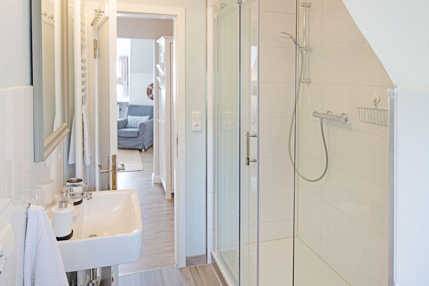 Genießen Sie Ihren Aufenthalt in unserem charmanten Ferienappartement im Obergeschoss, ideal für bis zu 4 Personen. Es erwartet Sie ein gemütliches Wohnzimmer mit offener Küche, ein separates Schlafzimmer mit komfortablem Doppelbett und Fernseher, eine bequeme Schlafcouch im Wohnbereich sowie ein modernes Duschbad.