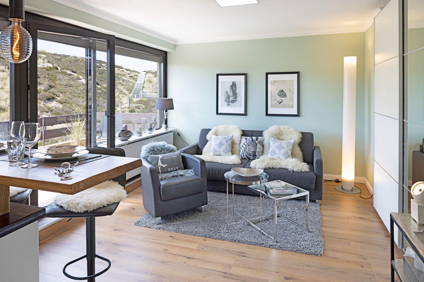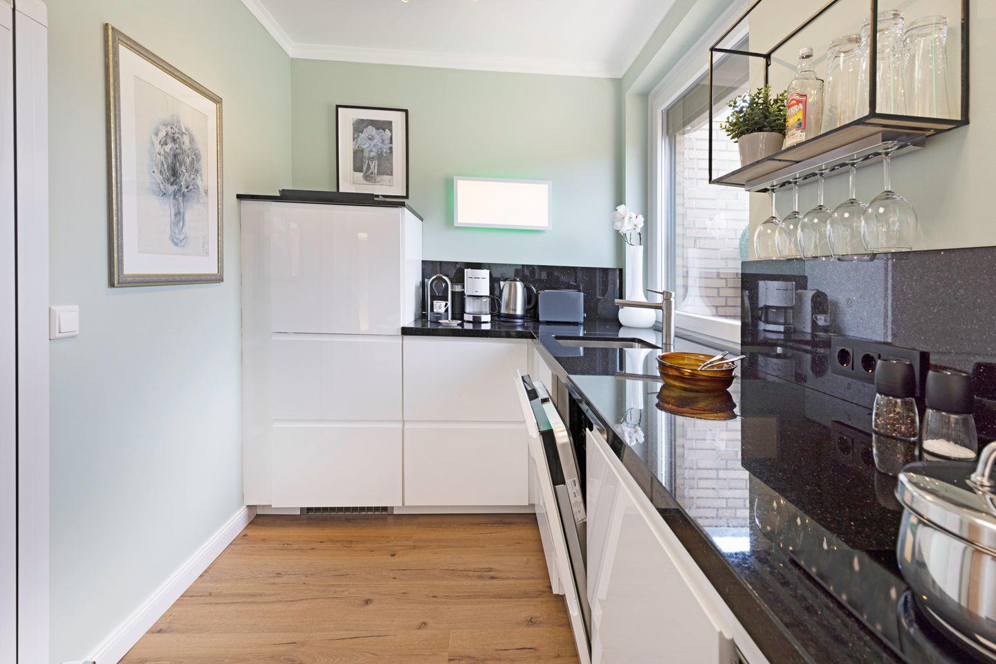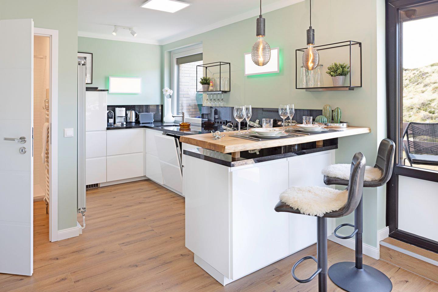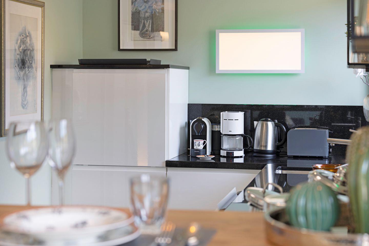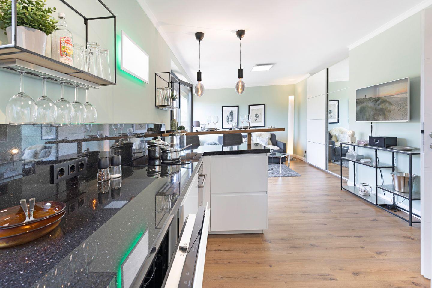 Die liebevoll eingerichtete Unterkunft verfügt über einen gemütlichen Wohnbereich mit Sofaecke, einem Esstisch und einem modernen TV, der optimalen Komfort für entspannte Abende bietet. Genießen Sie Ihre selbst zubereiteten Mahlzeiten aus der voll ausgestatteten geschlossen Küche, die unter anderem mit einem Ceran-Herd, einem Kühlschrank, einer Spülmaschine und einer Nespresso-Maschine aufwartet. Der Brötchenservice sorgt zudem dafür, dass Sie jeden Morgen frisch in den Tag starten können.