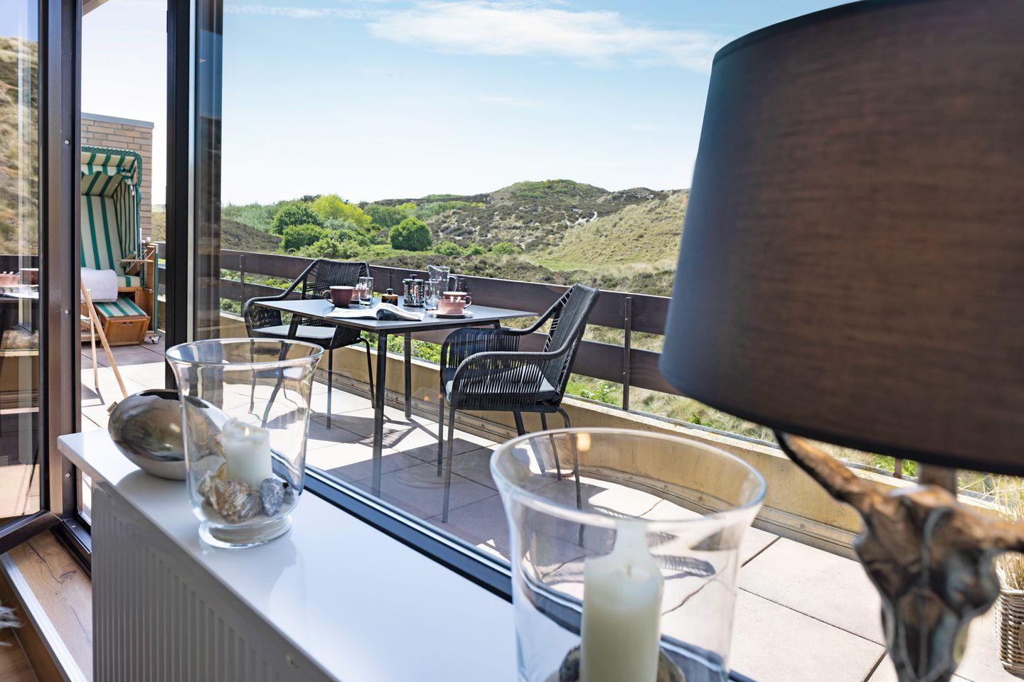 Möchten Sie entspannen? Nutzen Sie den großen Balkon – der ideale Ort für ein Glas Wein bei Sonnenuntergang oder einen lesenden Nachmittag im Strandkorb.