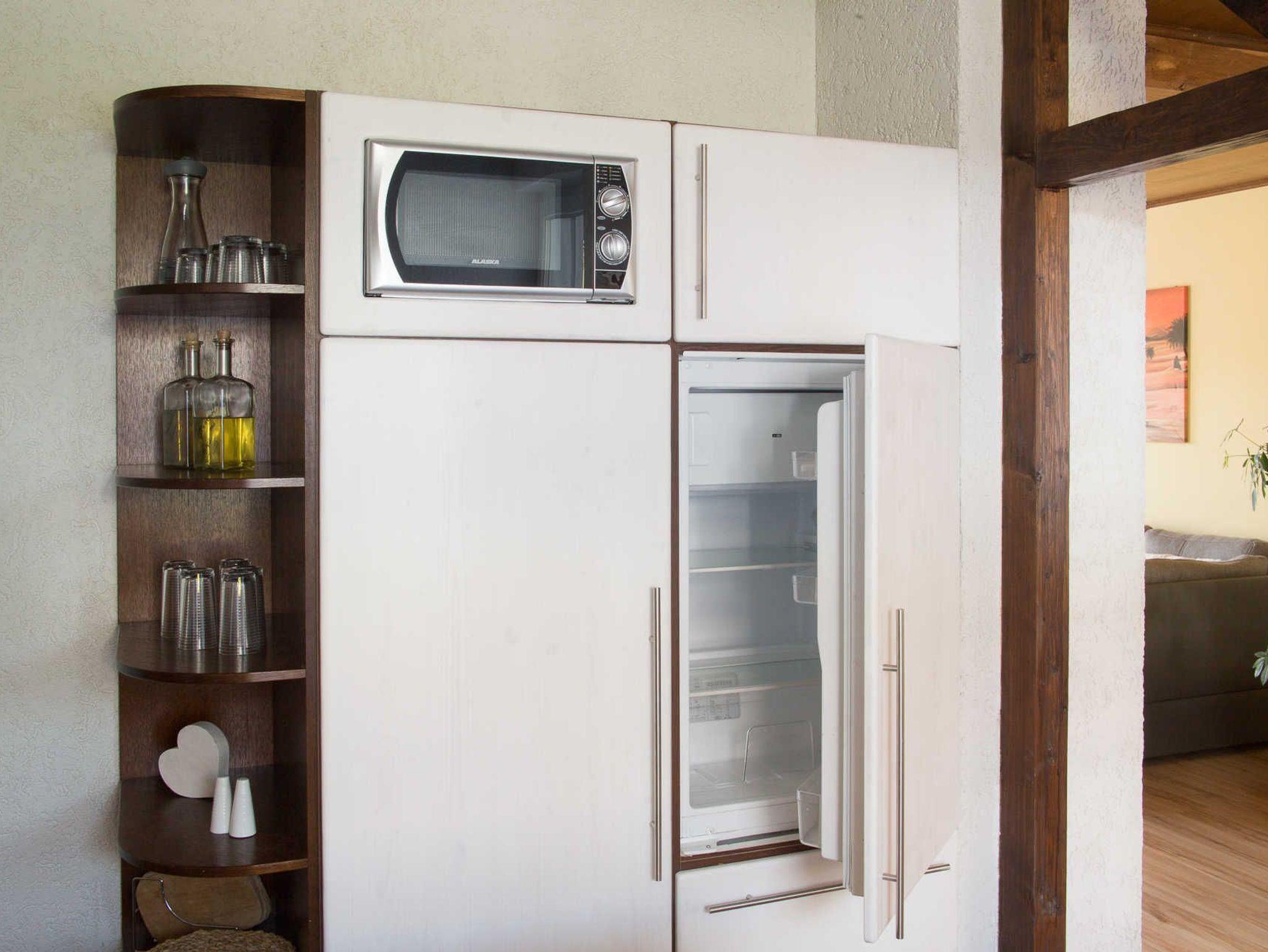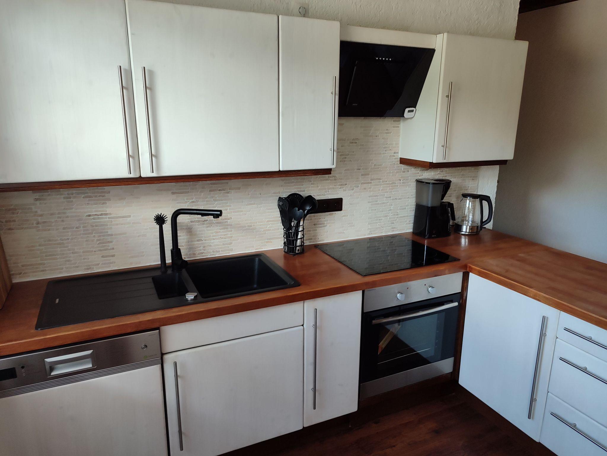 Die Küche (mit kleinem Balkon ) ist perfekt ausgestattet: Vom Backofen, Geschirrspüler, bis hin zum Wasserkocher, Toaster und Mikrowelle bietet die Küche Selbstversorgern jeden Komfort.