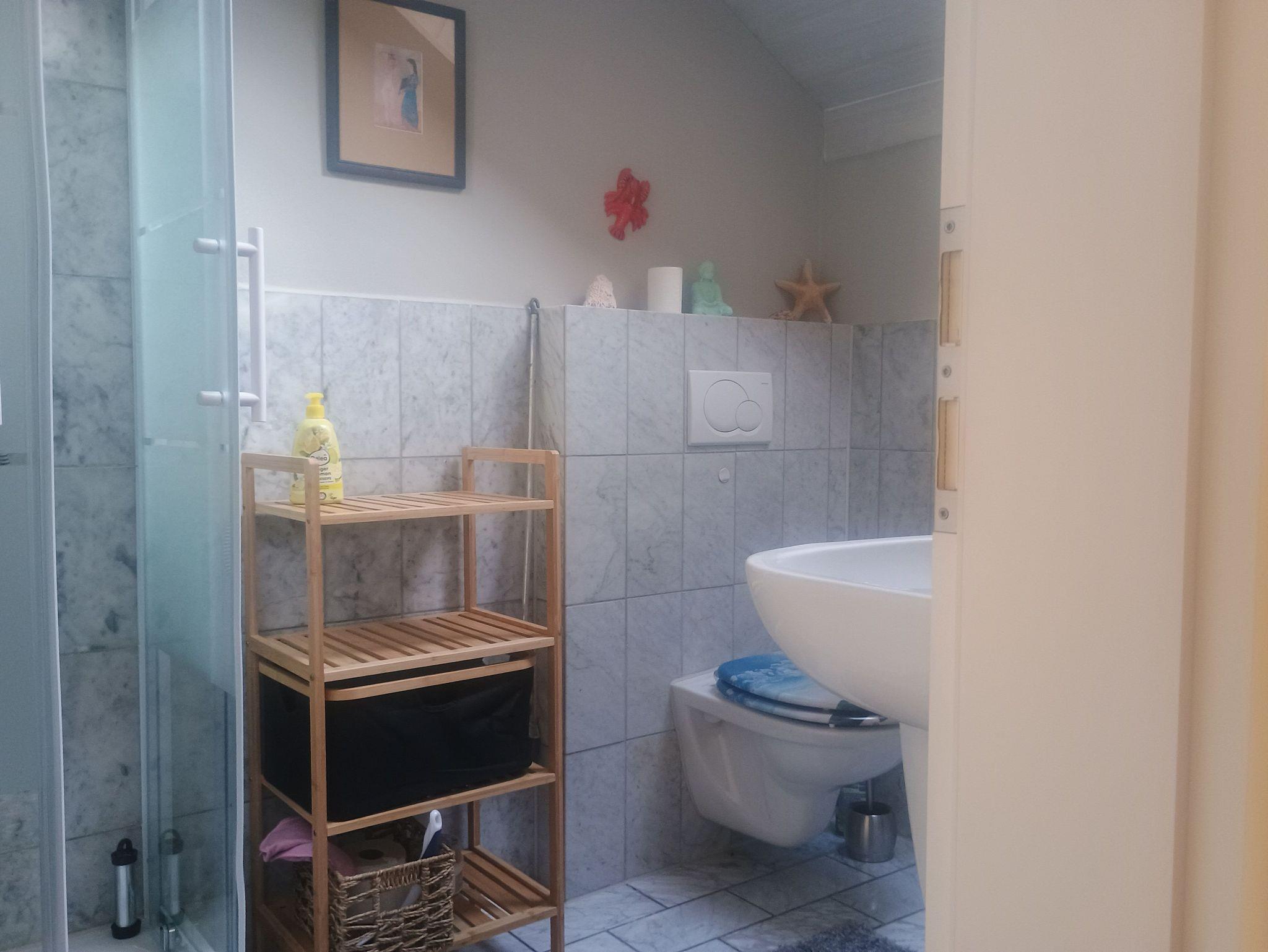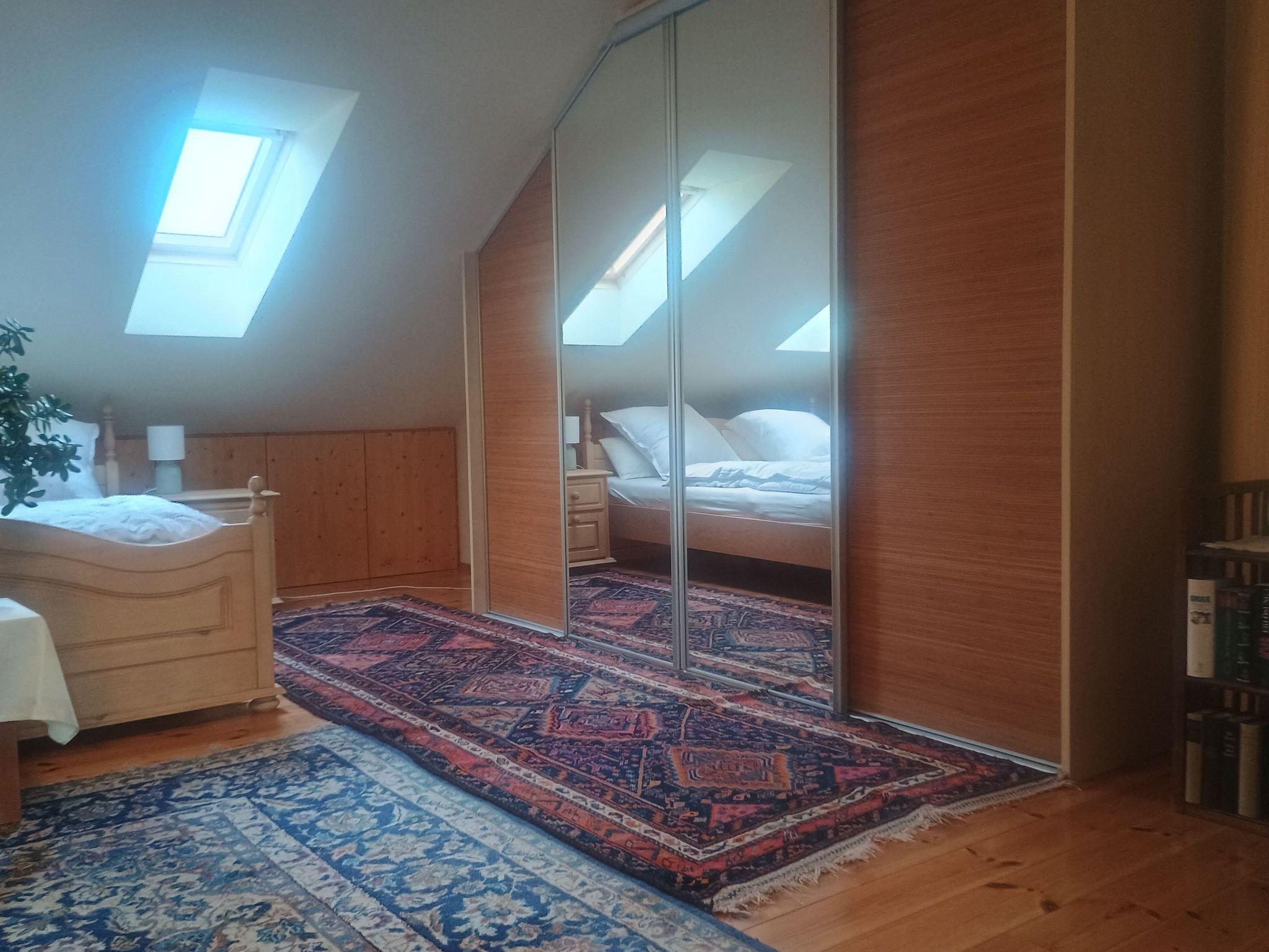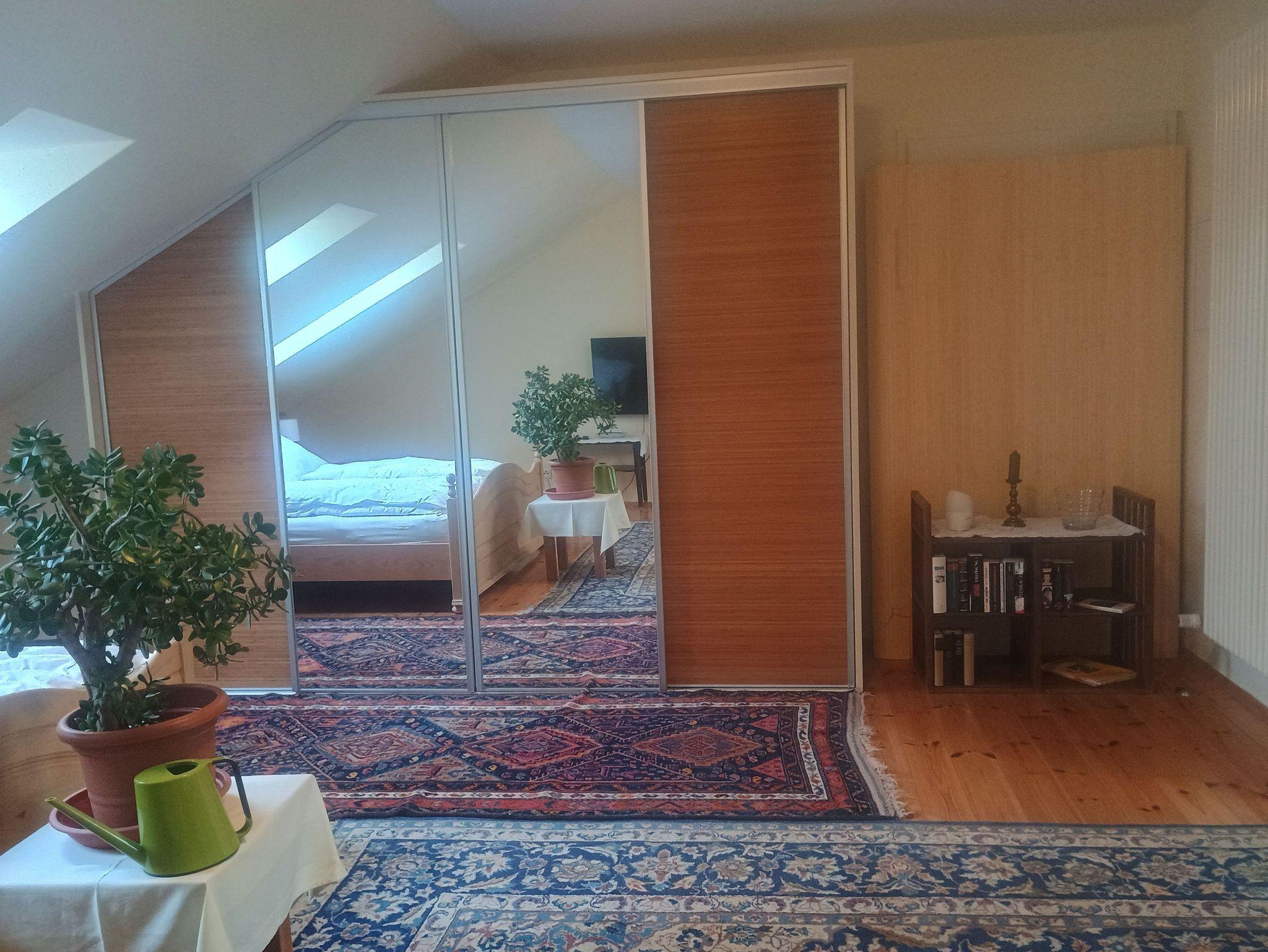 Die Ferienwohnung befindet sich in der Einliegerwohnung der Gastgeber. Sie verfügt über eine Terrasse, einen Balkon und einen seperaten Eingang. Die Eingangstür führt direkt in die gut ausgestattete Wohnküche, von der aus eine Treppe zum Wohn-Schlafberreich und der Dusche mit WC führt. Das Bad hat Tageslicht.
