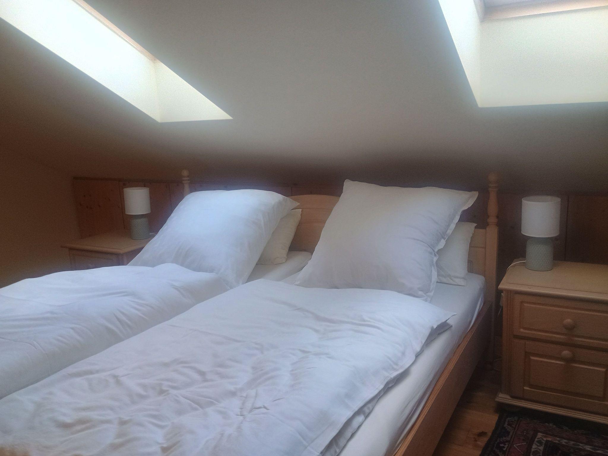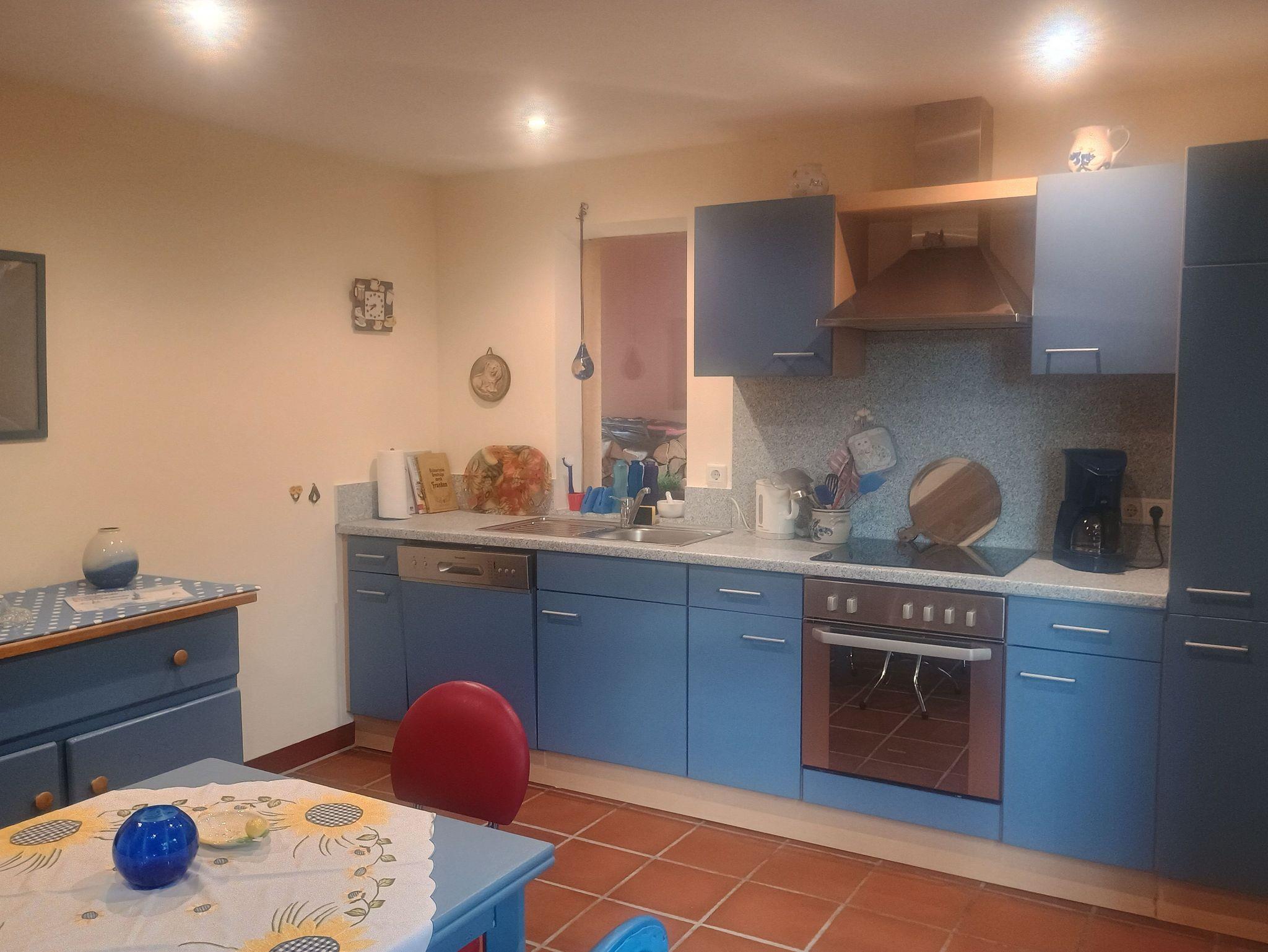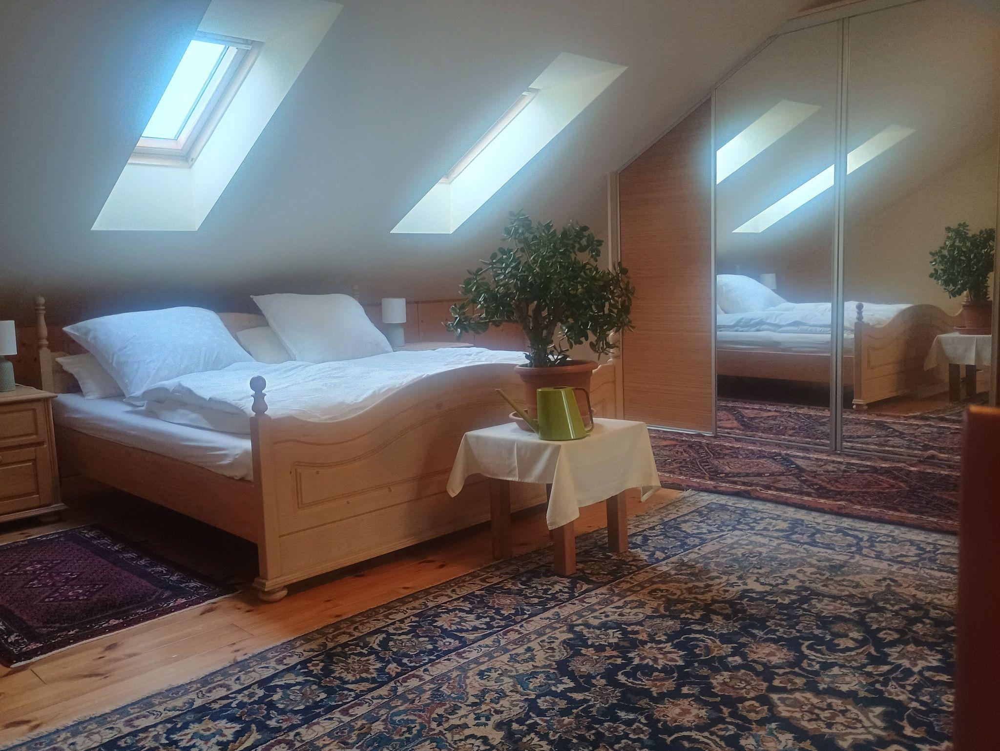 Die Ferienwohnung befindet sich in der Einliegerwohnung der Gastgeber. Sie verfügt über eine Terrasse, einen Balkon und einen seperaten Eingang. Die Eingangstür führt direkt in die gut ausgestattete Wohnküche, von der aus eine Treppe zum Wohn-Schlafberreich und der Dusche mit WC führt. Das Bad hat Tageslicht.