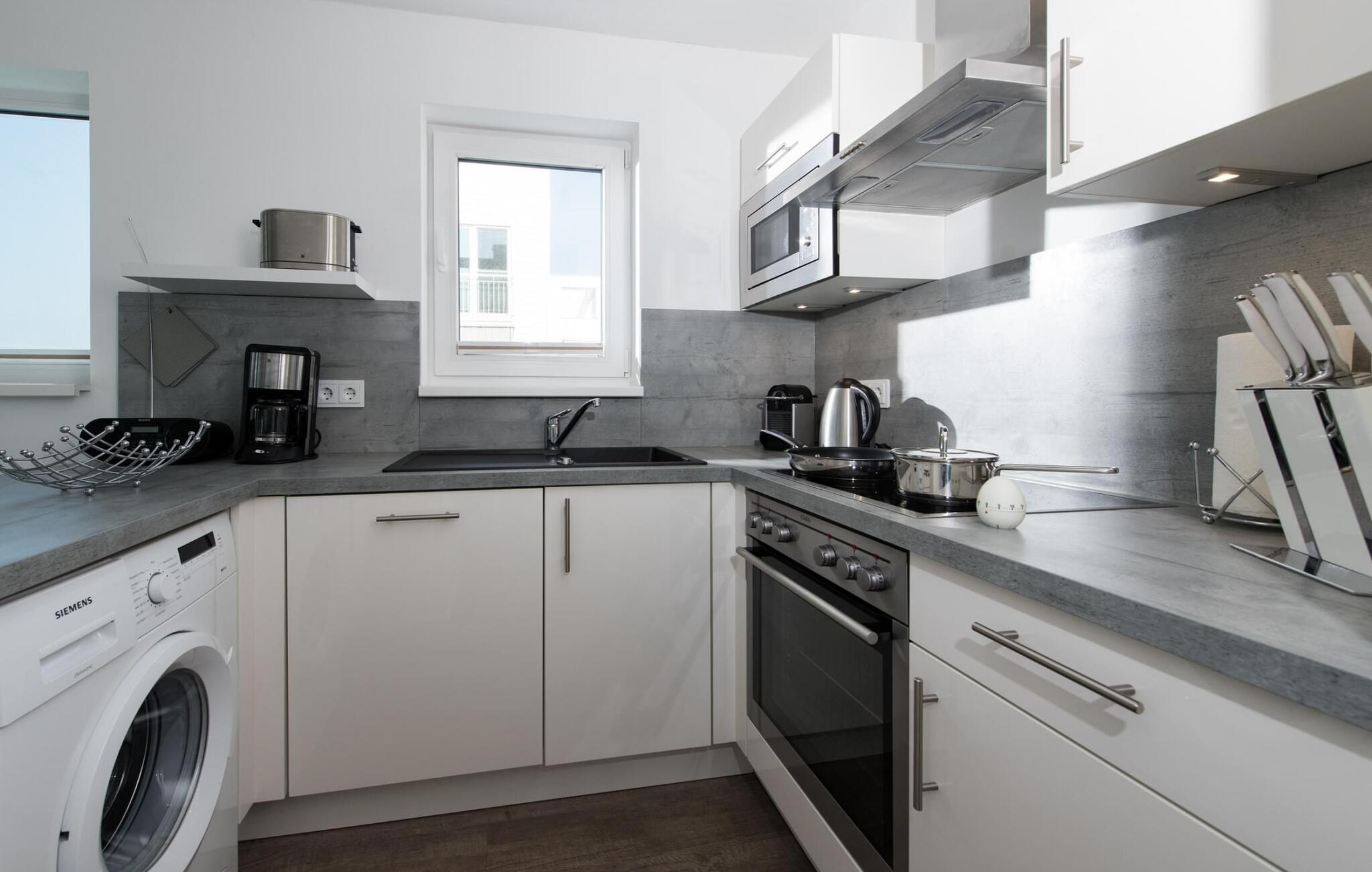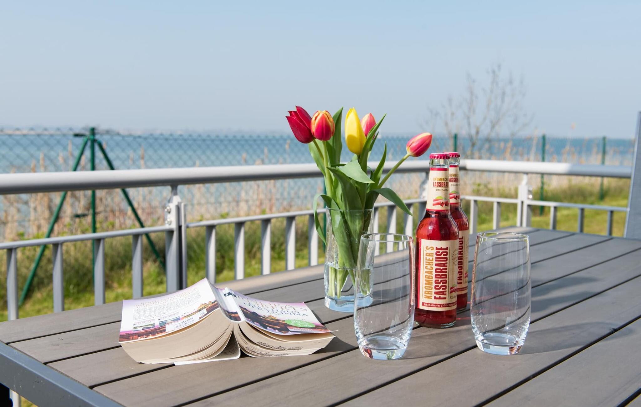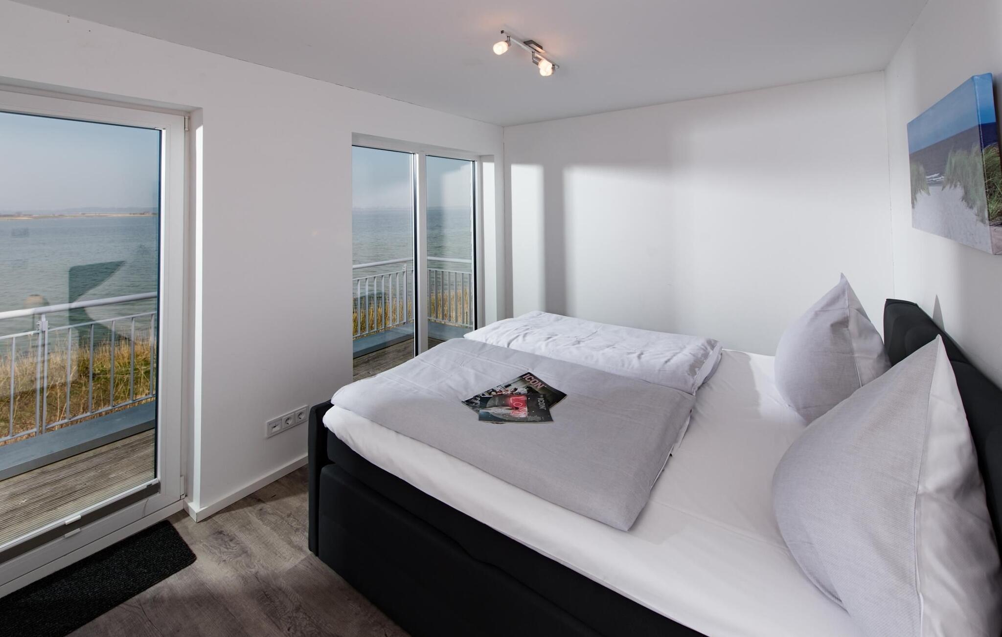 Et andet højdepunkt er den 25 m² store tagterrasse, som byder på panoramaudsigt over Slien, dens udmunding i Østersøen og ferieområdets havn. Her kan I nyde solen i fulde drag. Dette feriehus har en ren, moderne indretningsstil. Klare former og dæmpede farver afbrydes af shabby chic elementer og individuelle farveaccenter og sikrer den perfekte balance. I dette feriehus er mindre mere. Der er to parkeringspladser og eget cykelskur lige foran huset. Det levende feriehus er den ene halvdel af huset.