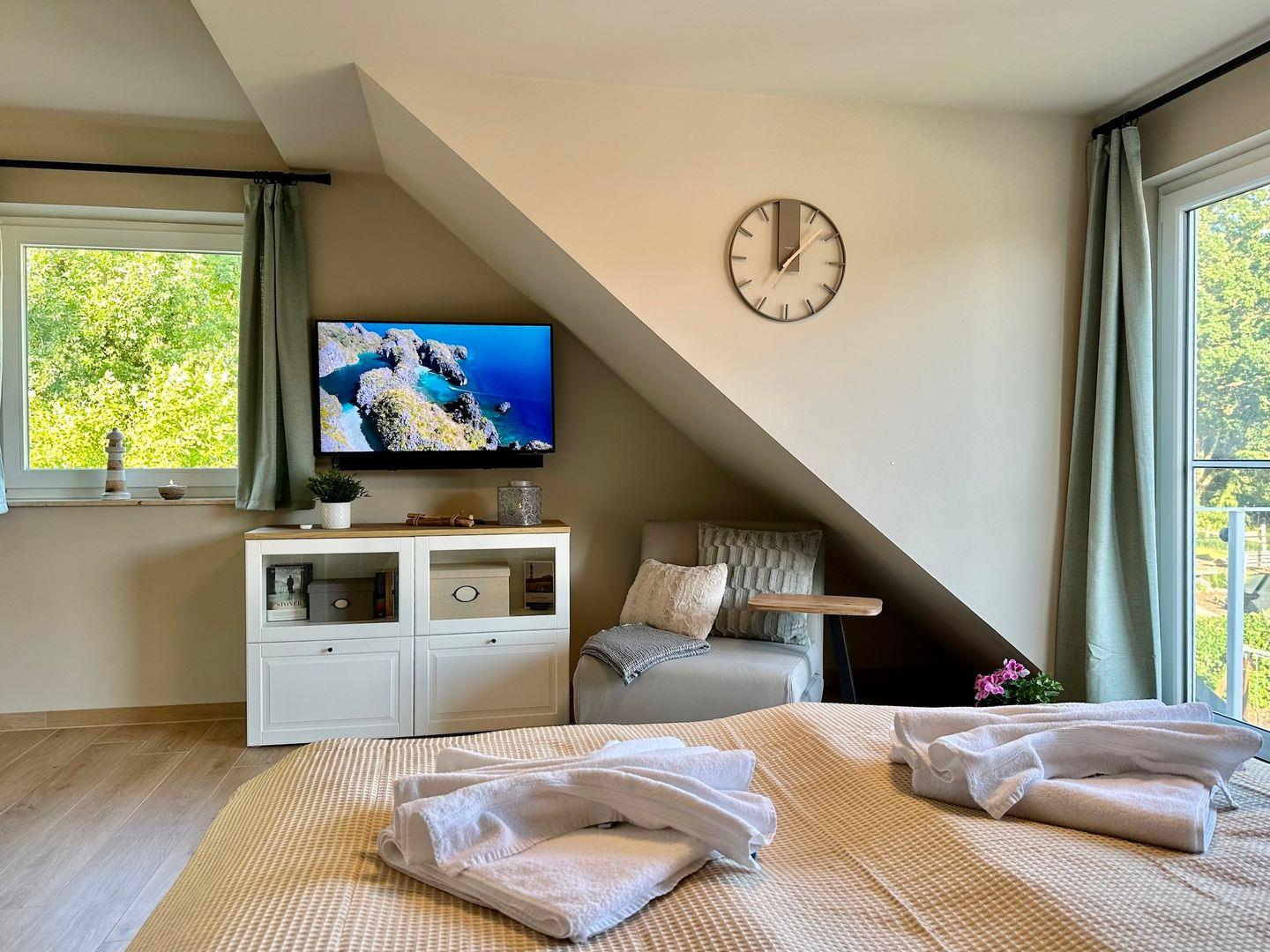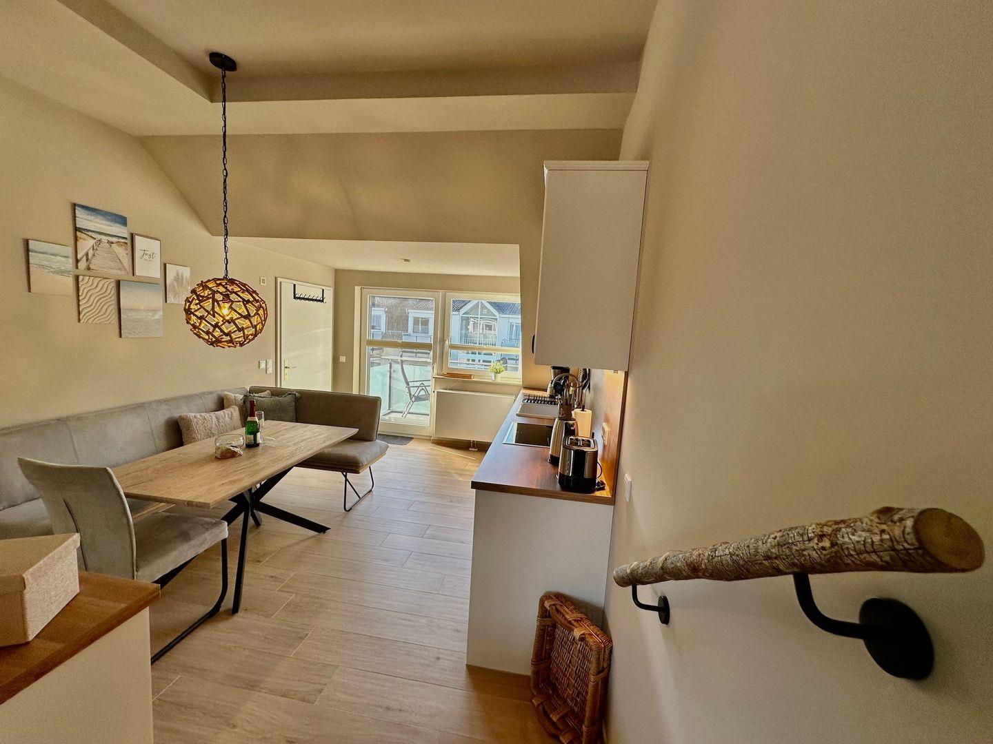 Die Wohnung hat eine voll ausgestattete Küche, mit allem was man zum Kochen benötigt und einen angrenzenden Essbereich. Über zwei Stufen gelangt man in den Wohnbereich mit einem Doppelbett ( 160/ 200cm ) und einer Schlafcouch. Für die Unterhaltung sorgt ein Flachbild-TV, eine CD- und DVD-Anlage.