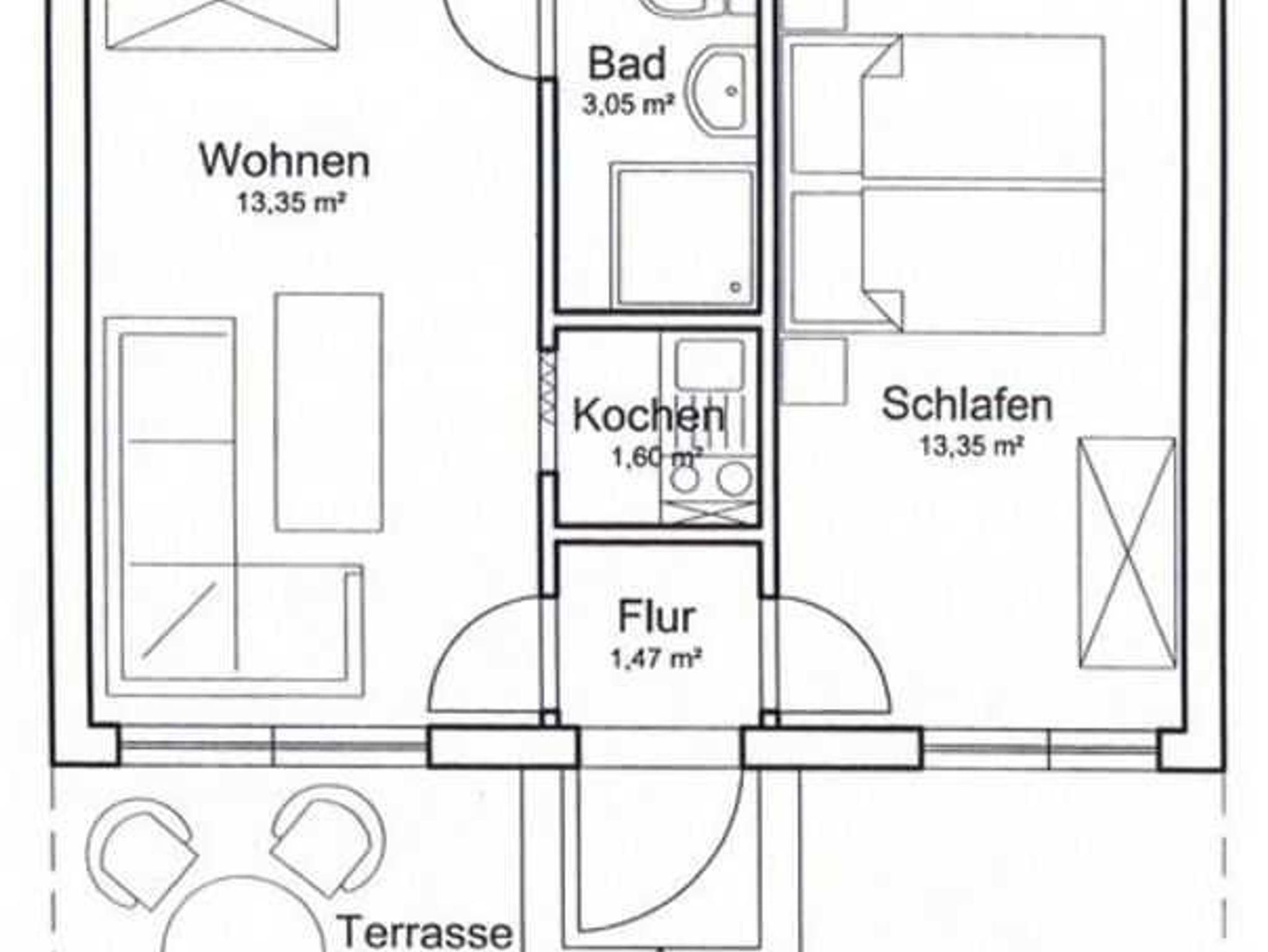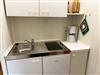 - Kochnische mit Single-Küche (2-Platten-Kocher, Kühlschrank mit Gefrierfach, Wasserkocher, Kaffemaschine, Töpfe, Geschirr)