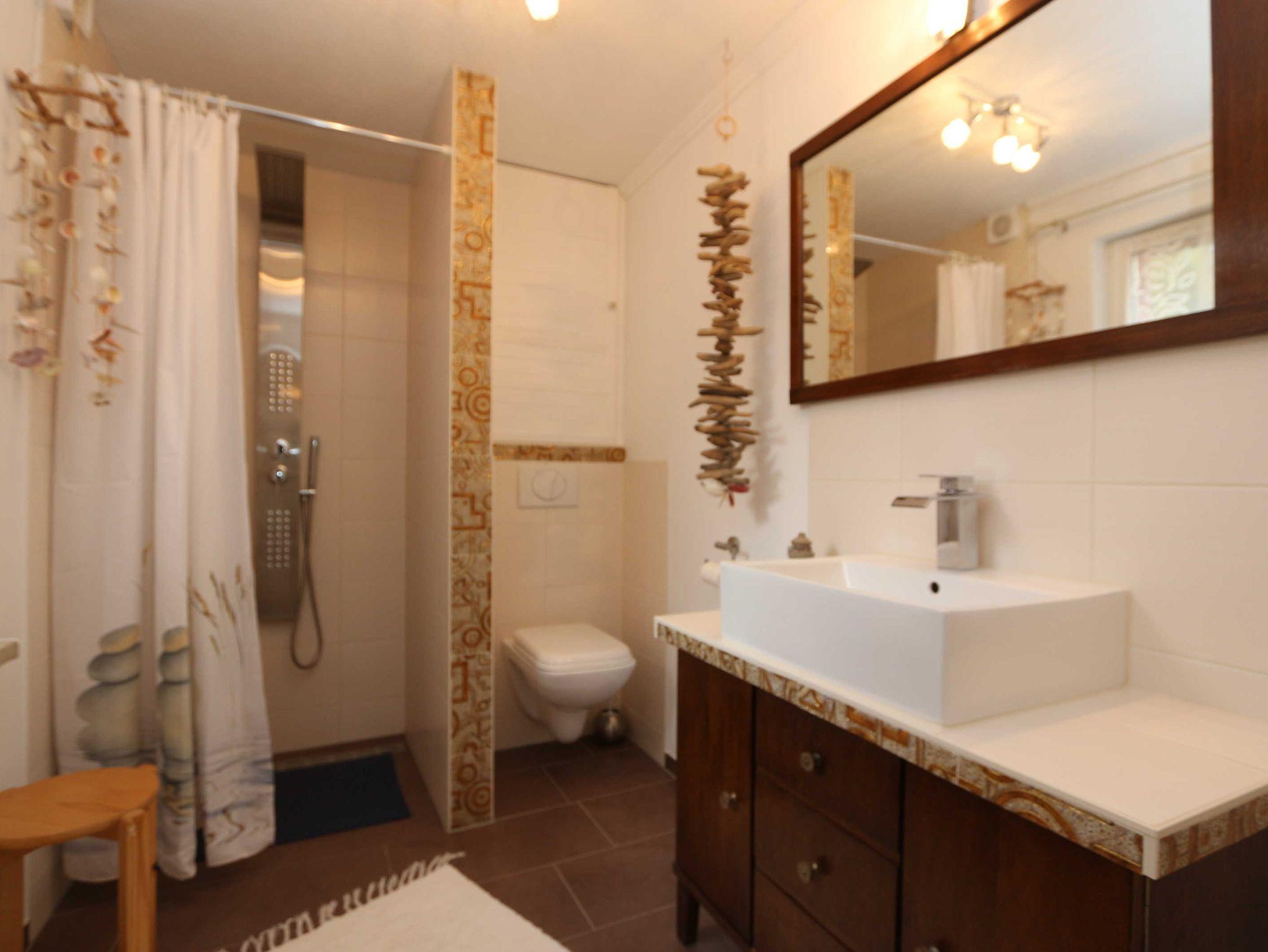 • Das Badezimmer mit Fenster hat eine bodengleiche Dusche (mit Duschvorhang), ein WC und ein Waschbecken.